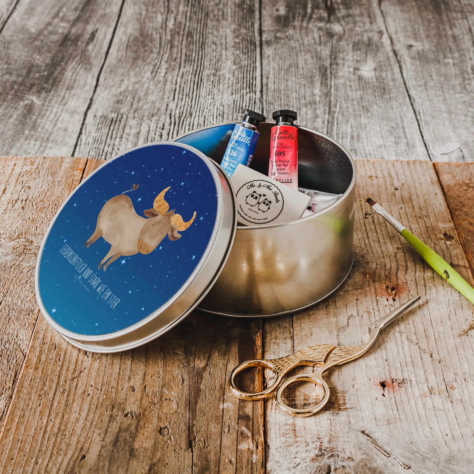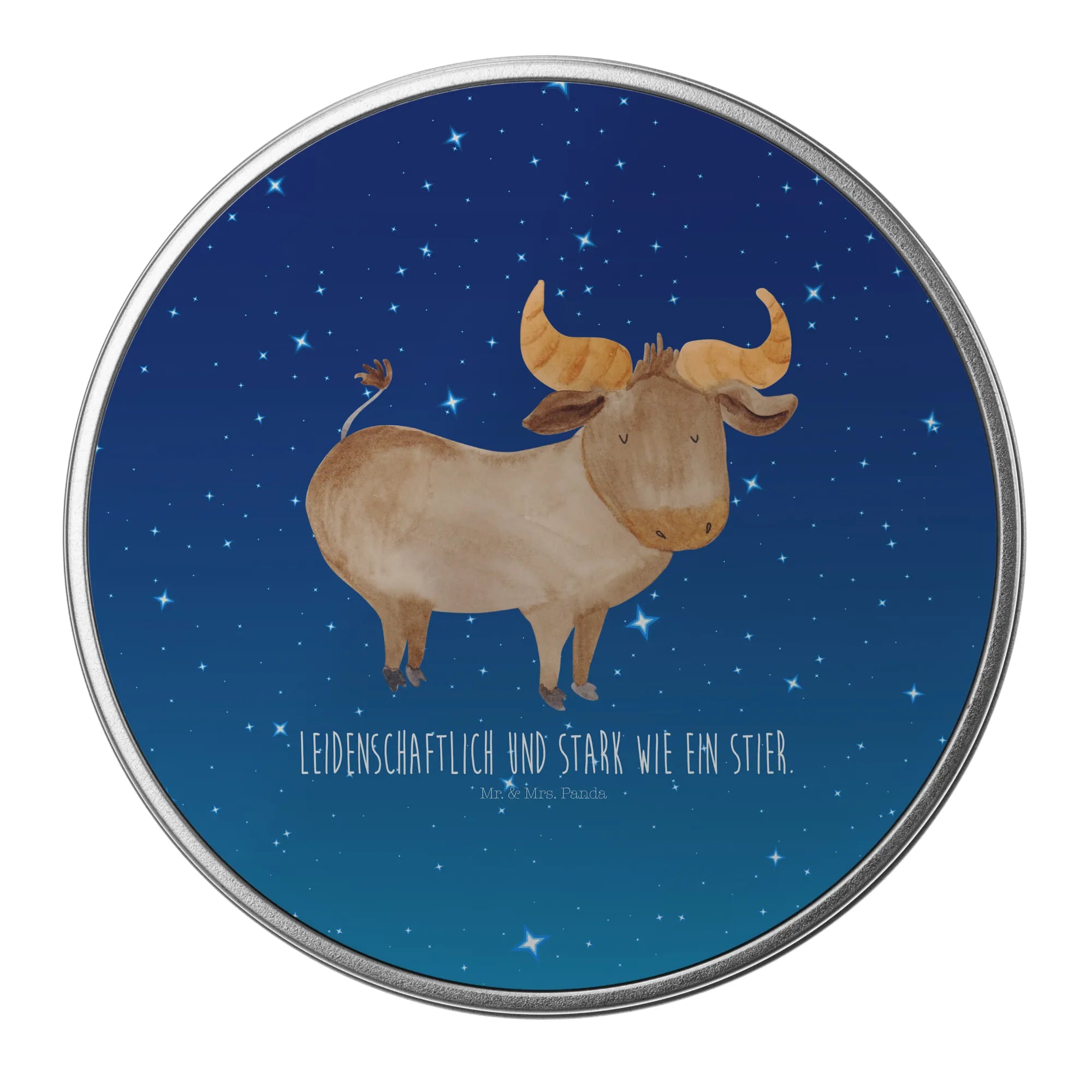 okrągła puszka z blachy Znak zodiaku Byk - z napisem