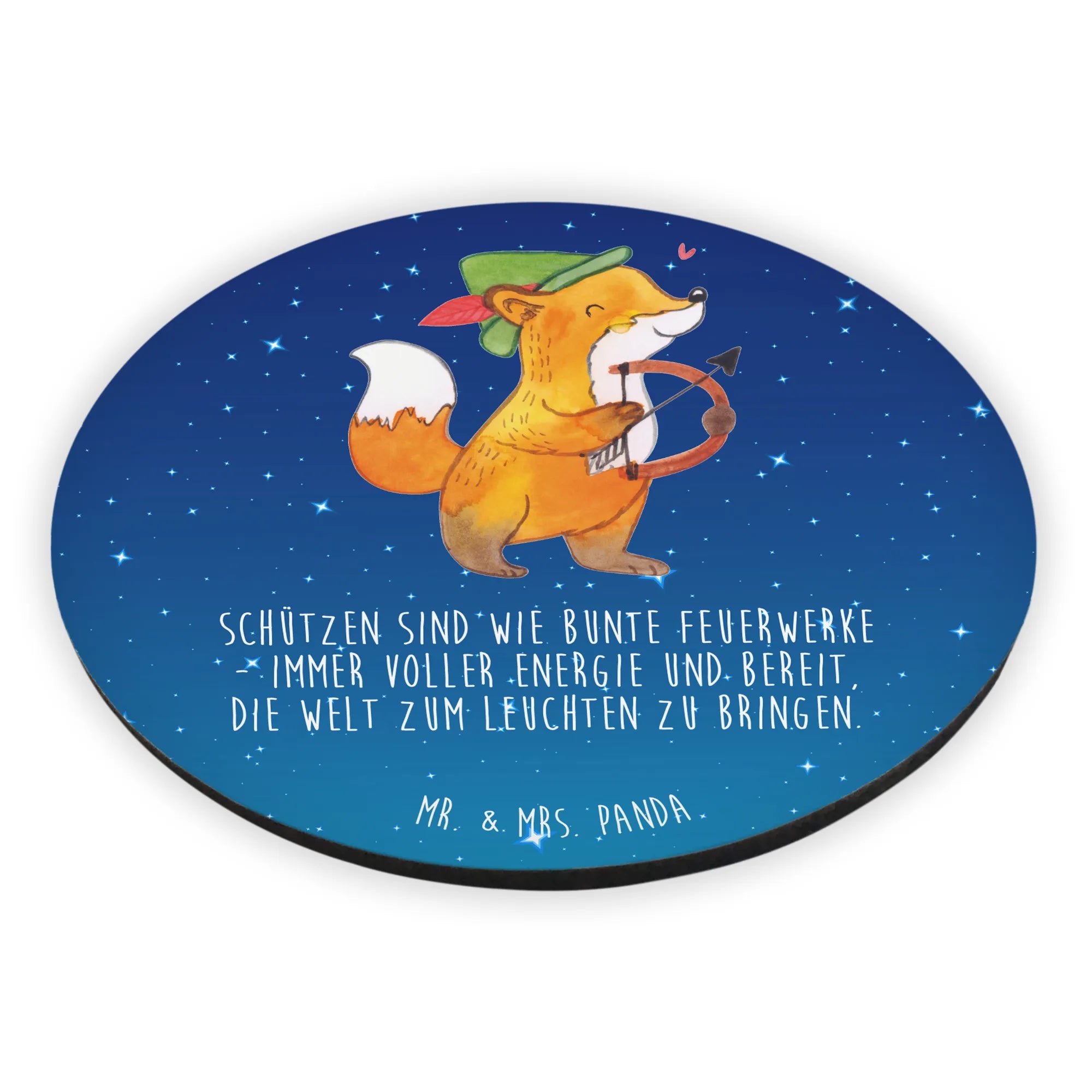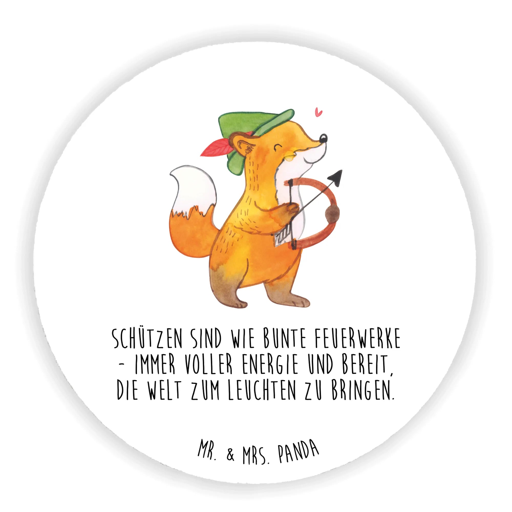 Suchst du nach dem perfekten Geschenk für Schütze-Fans? Dann ist unser Rund Magnet mit dem bezaubernden Schütze-Motiv genau das Richtige für dich! Dieser einzigartige Kühlschrankmagnet bringt nicht nur Farbe in die Küche, sondern auch das Sternzeichen Schütze direkt zu dir. Mit seinem liebevoll handgezeichneten Motiv von Mrs. Panda zeigt dieser Magnet einen lustigen orange-braunen Fuchs, der sich als Schütze verkleidet hat. Er trägt einen grünen Hut mit einer roten Feder und zielt mit Pfeil und Bogen, was dir ein Lächeln ins Gesicht zaubern wird! Der charmante Slogan "Schützen sind wie bunte Feuerwerke - immer voller Energie und bereit, die Welt zum Leuchten zu bringen" ergänzt das Motiv und macht den Magneten zu einer tollen Deko für den Kühlschrank oder das Whiteboard.