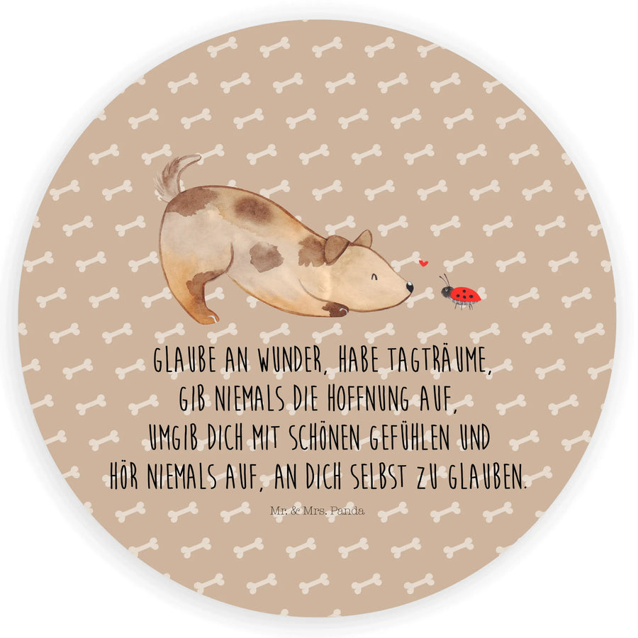 Ein bezaubernder 80mm Runder Aufkleber von Mr. & Mrs. Panda – das Motiv "Hund Marienkäfer" zeigt einen niedlichen Hund, der entzückt vor einem kleinen Marienkäfer sitzt. Von Mrs. Panda liebevoll in Aquarell gezeichnet, bringt dieser runde Sticker Wärme und Freude in Deinen Alltag. 😊🐶🐞