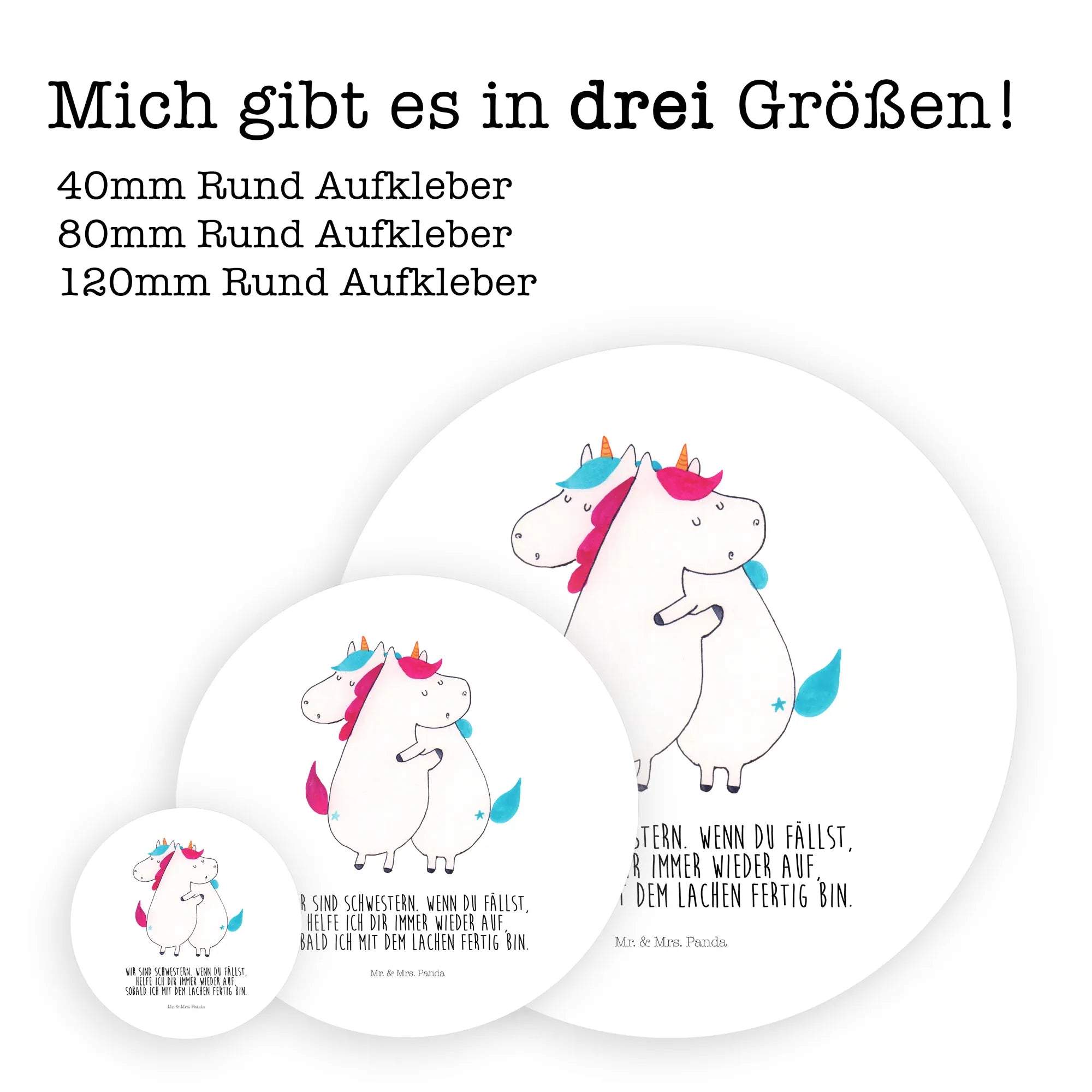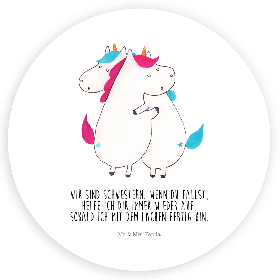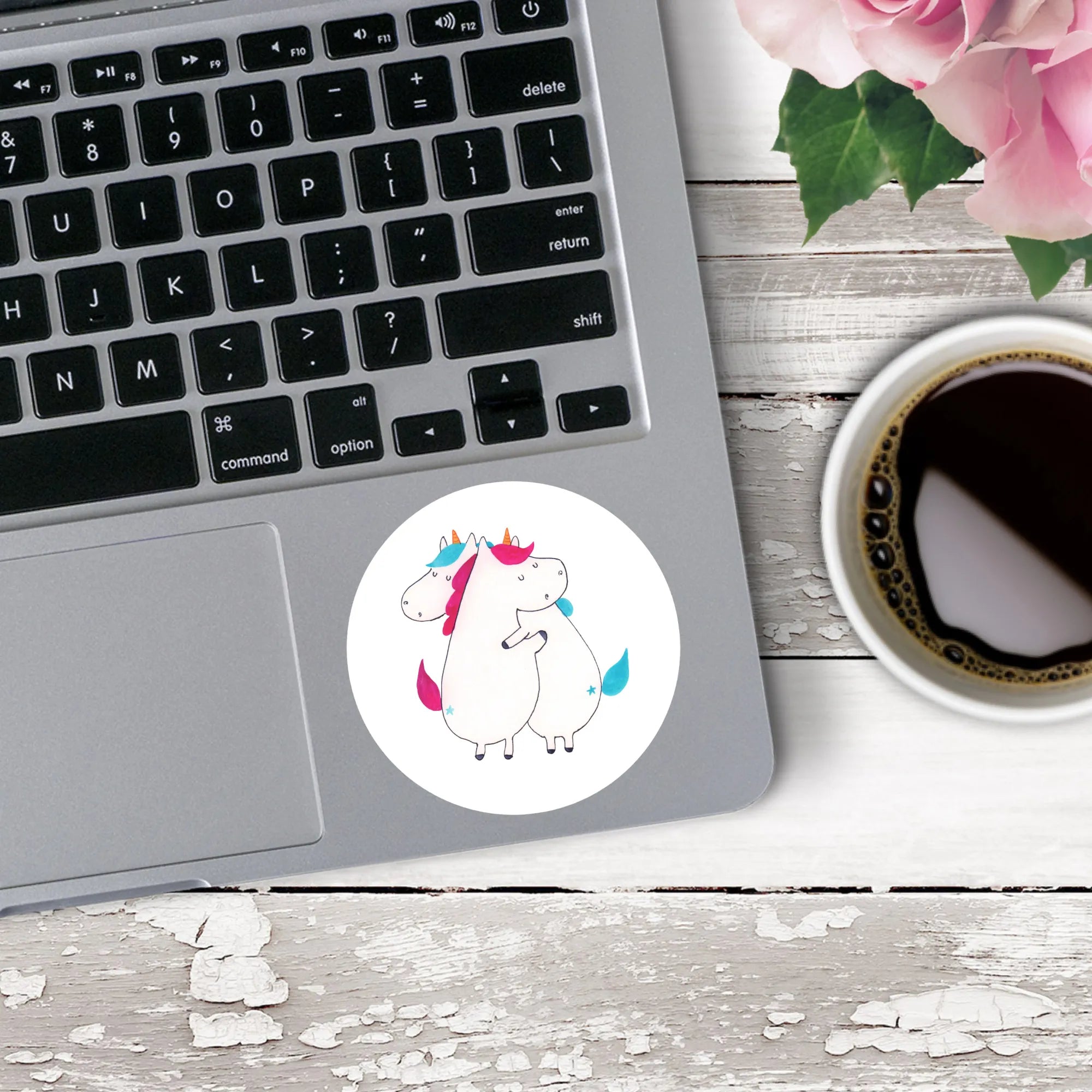 Ein wunderschöner 80mm Rund Aufkleber von Mr. & Mrs. Panda – das Motiv „Einhörner Umarmen“ zeigt zwei süße Einhörner, die sich herzlich umarmen und pure Freundschaft ausstrahlen. Ein liebevolles Design aus der Einhorn - Kollektion, handgezeichnet von Mrs. Panda.