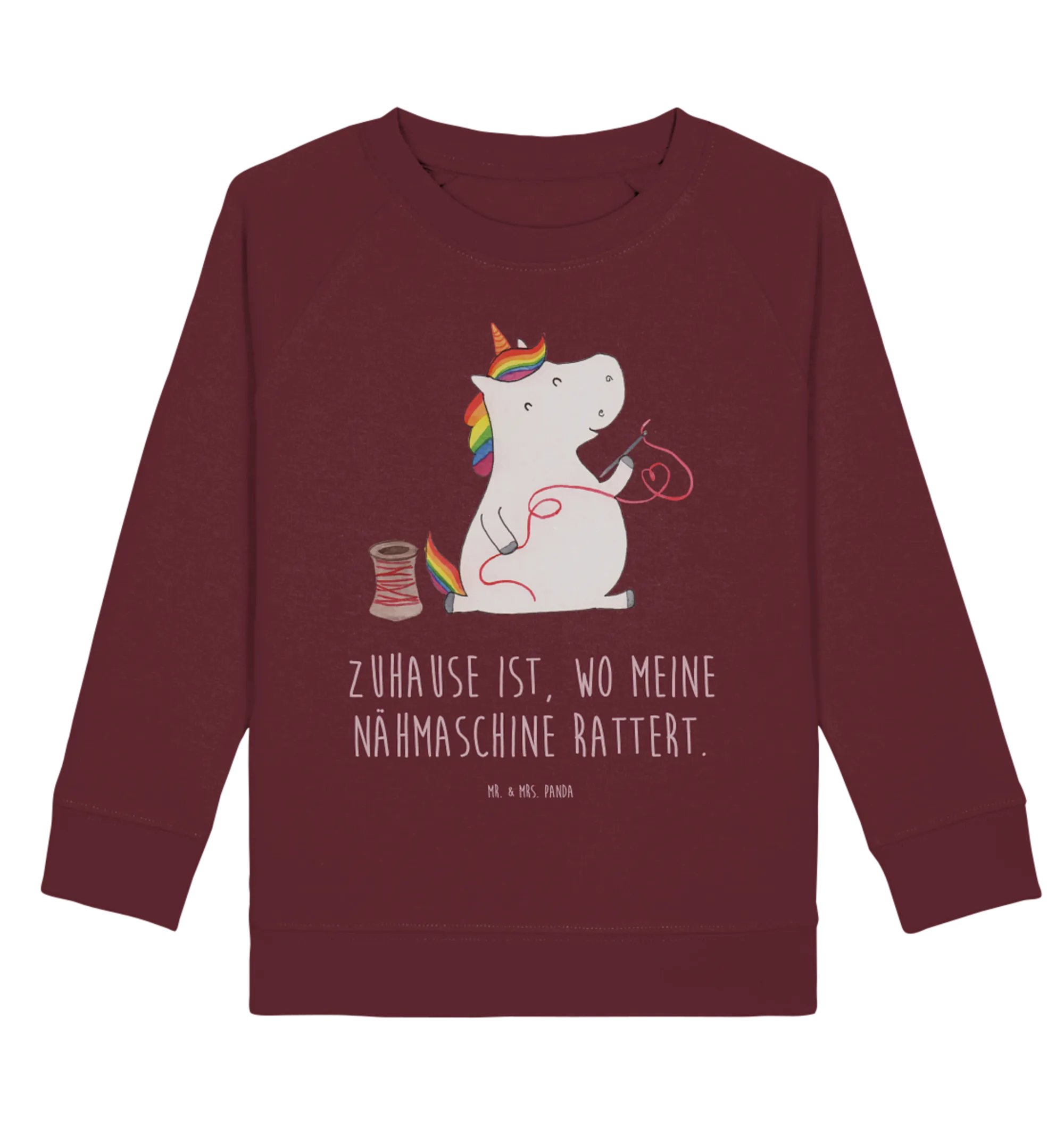 Die kleinen Näherinnen und Schneider werden von einem niedlichen Einhorn umgeben, das mit Nadel und Faden kreatives Schaffen zelebriert. Auf dem Pullover steht der liebevolle Spruch: "Zuhause ist, wo meine Nähmaschine rattert."