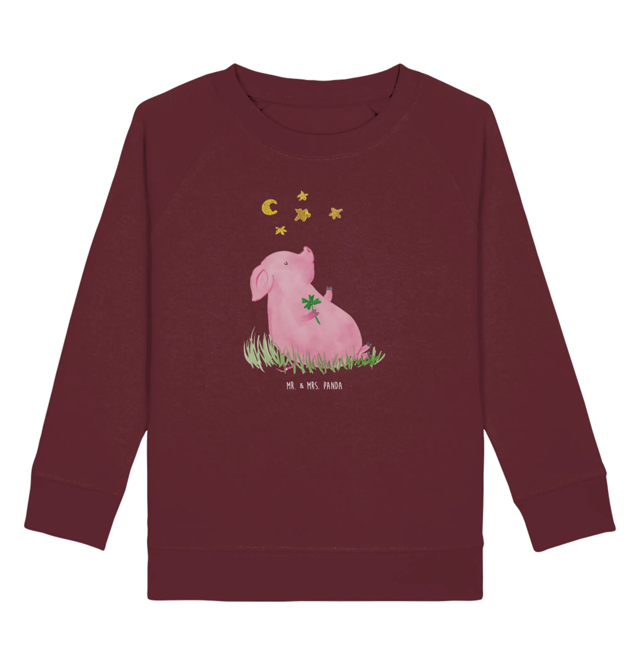 Der Pullover ist aus hochwertiger, ökologischer Baumwolle gefertigt und sorgt für maximalen Tragekomfort, egal ob beim Spielen im Freien oder beim Kuscheln auf dem Sofa. Die Farbe Burgund verleiht dem Teil eine elegante Note, während die niedlichen Sterne um das Glücksschwein herum ein besonders verspieltes Gefühl verbreiten. Jedes Kind wird begeistert sein!