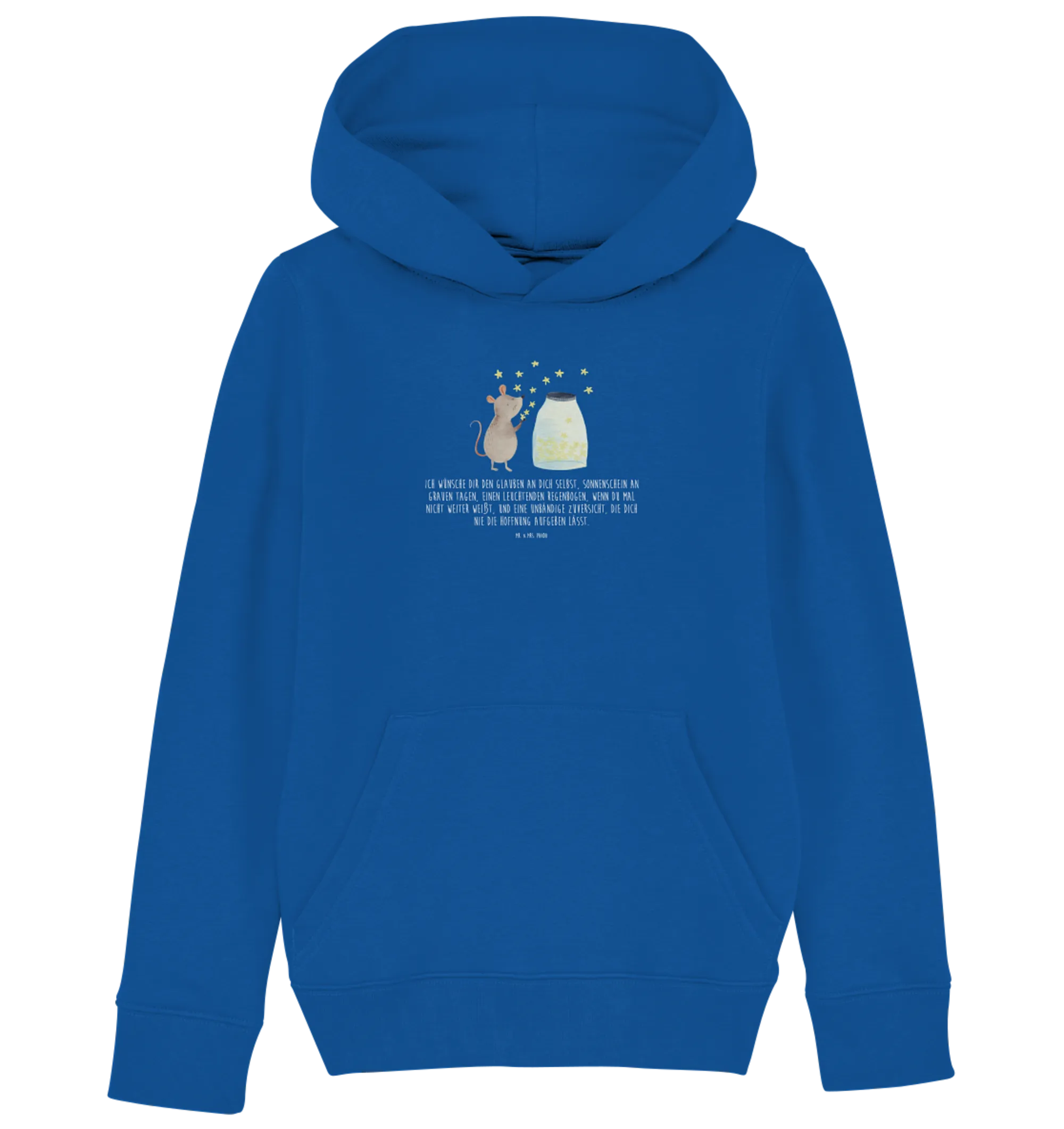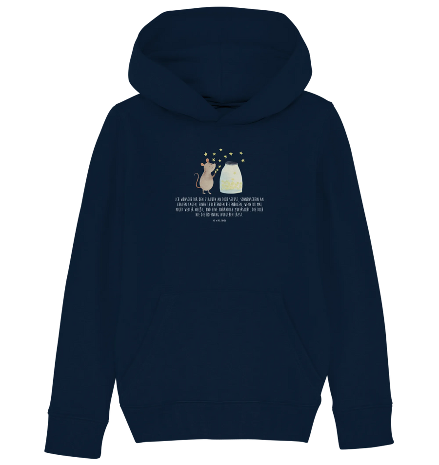Das süße Motiv der kleinen Maus, die vor einem Glas voller funkelnder Sterne sitzt, lädt ein, in eine Welt voller Träume und Abenteuer einzutauchen. Sie lässt die Sterne in die Freiheit fliegen und inspiriert die Kleinen, an ihre eigenen Träume zu glauben. Der Slogan "Ich wünsche dir den Glauben an dich selbst, Sonnenschein an grauen Tagen, einen leuchtenden Regenbogen, wenn du mal nicht weiter weißt, und eine unbändige Zuversicht, die dich nie die Hoffnung aufgeben lässt." macht diesen Hoodie zu einem ganz besonderen Stück, das nicht nur stylisch, sondern auch voller positiver Botschaften ist.