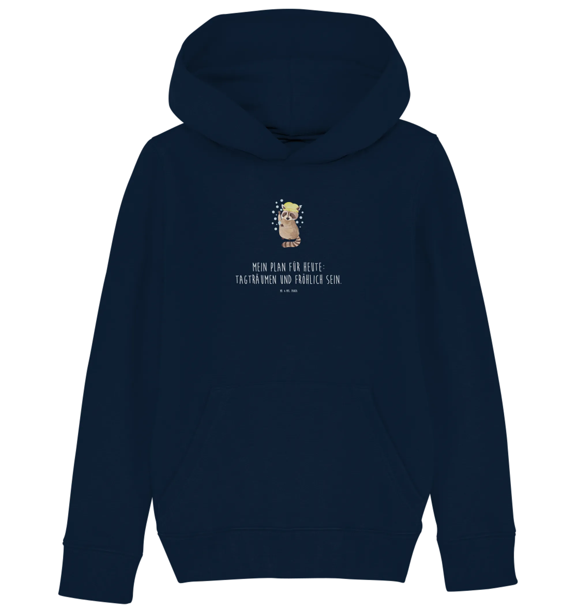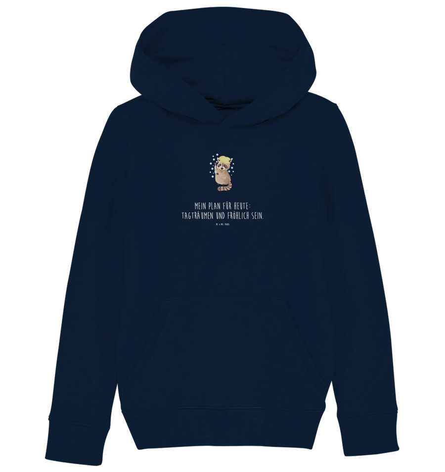 Das Motiv zeigt einen süßen Waschbär, der fröhlich ins Tageslicht blickt, während der Slogan "Mein Plan für heute: Tagträumen und fröhlich sein." die Lebensfreude perfekt zusammenfasst. Kinder können sich in diesem Hoodie so richtig wohlfühlen, egal ob sie drinnen spielen oder draußen toben.