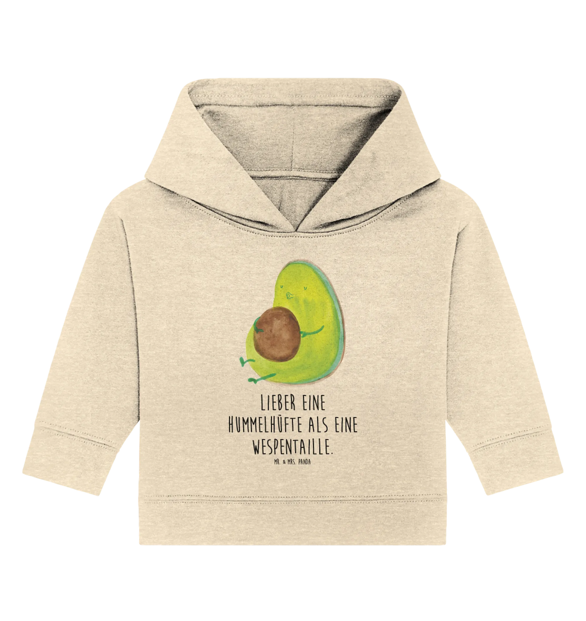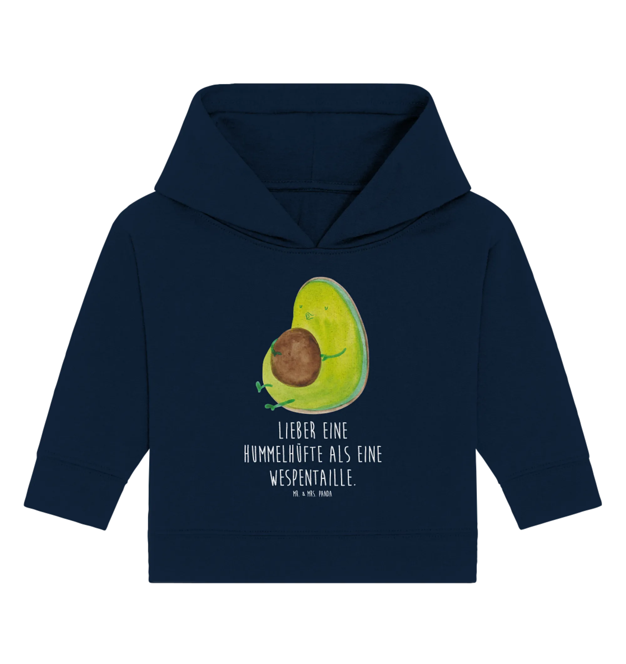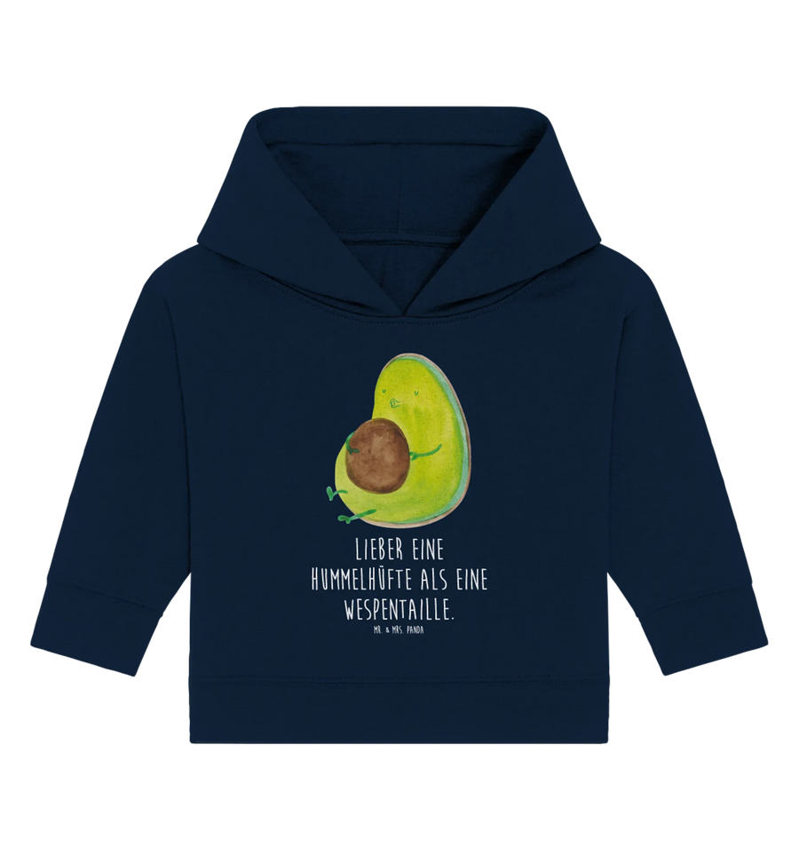 Die nachhaltige Herstellung und die liebevolle Gestaltung machen es zudem zu einer bewussten Wahl für umweltbewusste Eltern. Trage Dein Baby stolz in diesem trendigen Hoodie und teile die Botschaft: 'Lieber eine Hummelhüfte als eine Wespentaille' – ein humorvoller Spruch, der perfekt zur Avocado passt!