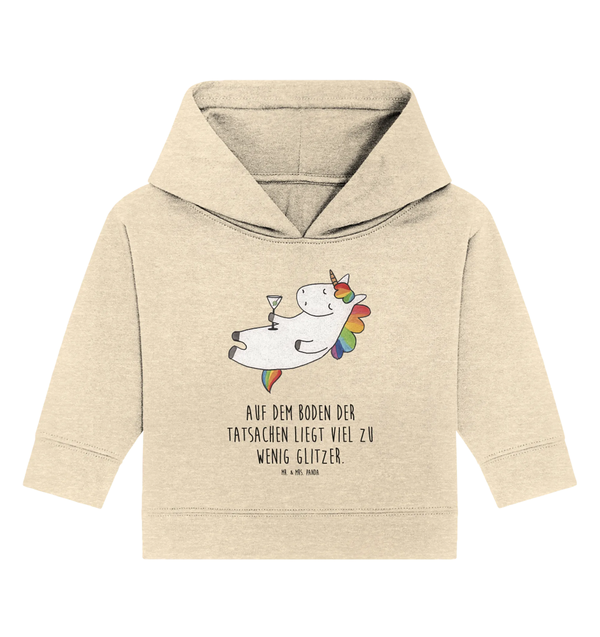 Das Organic Baby Hoodie mit dem zauberhaften Einhorn Cocktail ist das perfekte Geschenk für kleine Einhorn-Fans und ihre besten Freundinnen. Mit einem liebevoll handgezeichneten Motiv von Mrs. Panda, zeigt dieses Hoodie ein glückliches Einhorn, das entspannt mit einem Cocktail in der Hand posiert und gleichzeitig den Spruch 'Auf dem Boden der Tatsachen liegt viel zu wenig Glitzer' verkündet. Es ist nicht nur ein modisches Teil, sondern auch ein Statement, das die Freude am Feiern und den Spaß am Leben verkörpert.