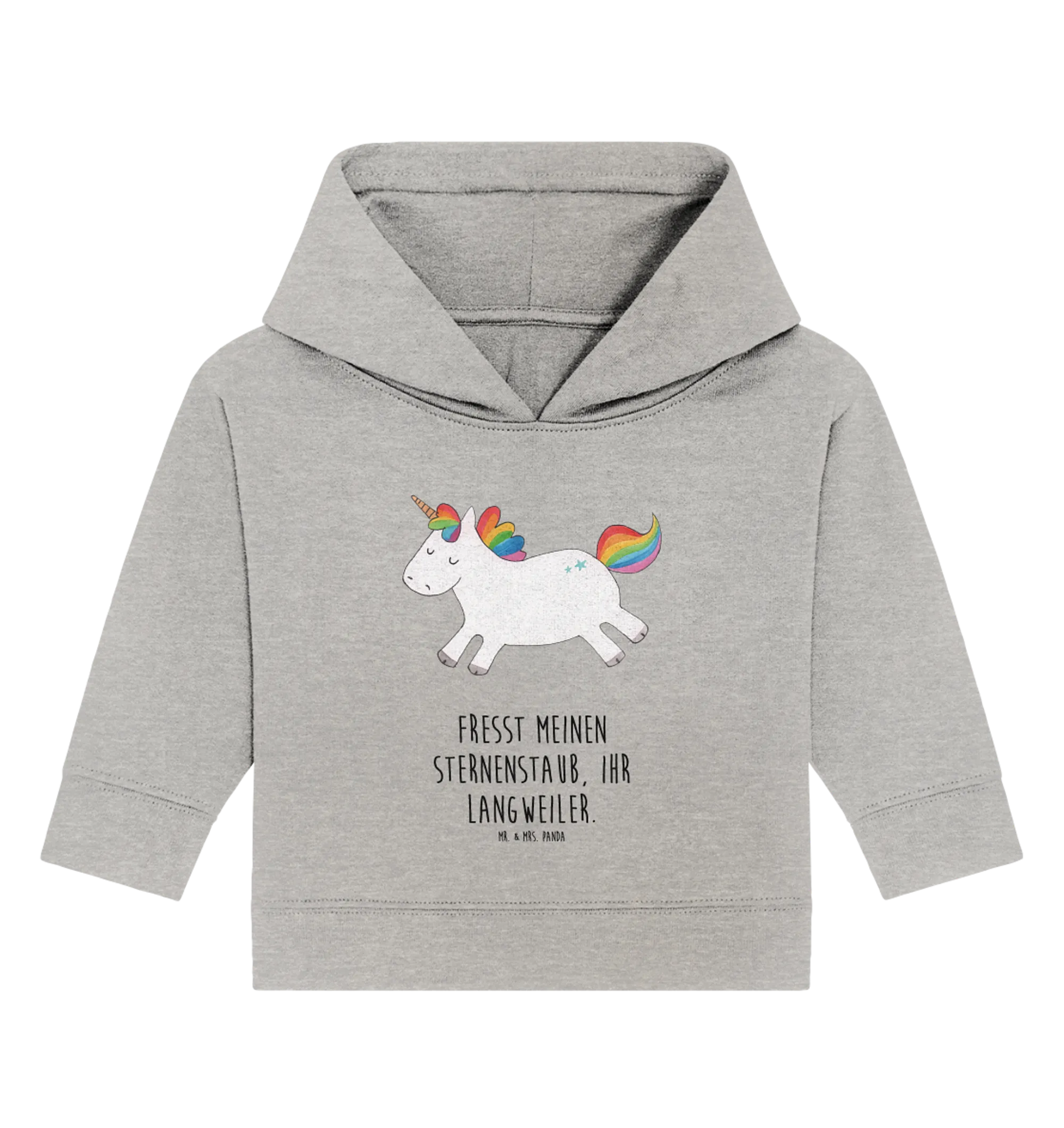 Suchst du ein geschätztes Geschenk für einen besonderen Anlass, wie einen ersten Geburtstag, eine Taufe oder das Weihnachtsfest? Dieser Baby Hoodie ist genau das richtige Geschenk für kleine Einhorn-Fans! Es wird mit dem witzigen Spruch 'Fresst meinen Sternenstaub, ihr Langweiler.' verziert, der dein Kind spielerisch ermutigt, immer es selbst zu sein - was könnte es Schöneres geben? In den Größen 12 - 18 Monate ist dieses Kapuzensweatshirt ideal für eure kleinen Abenteuer. Die hübsche Farbe in Heather Grey macht den Hoodie zudem zu einem vielseitigen Kleidungsstück, das sich leicht kombinieren lässt.