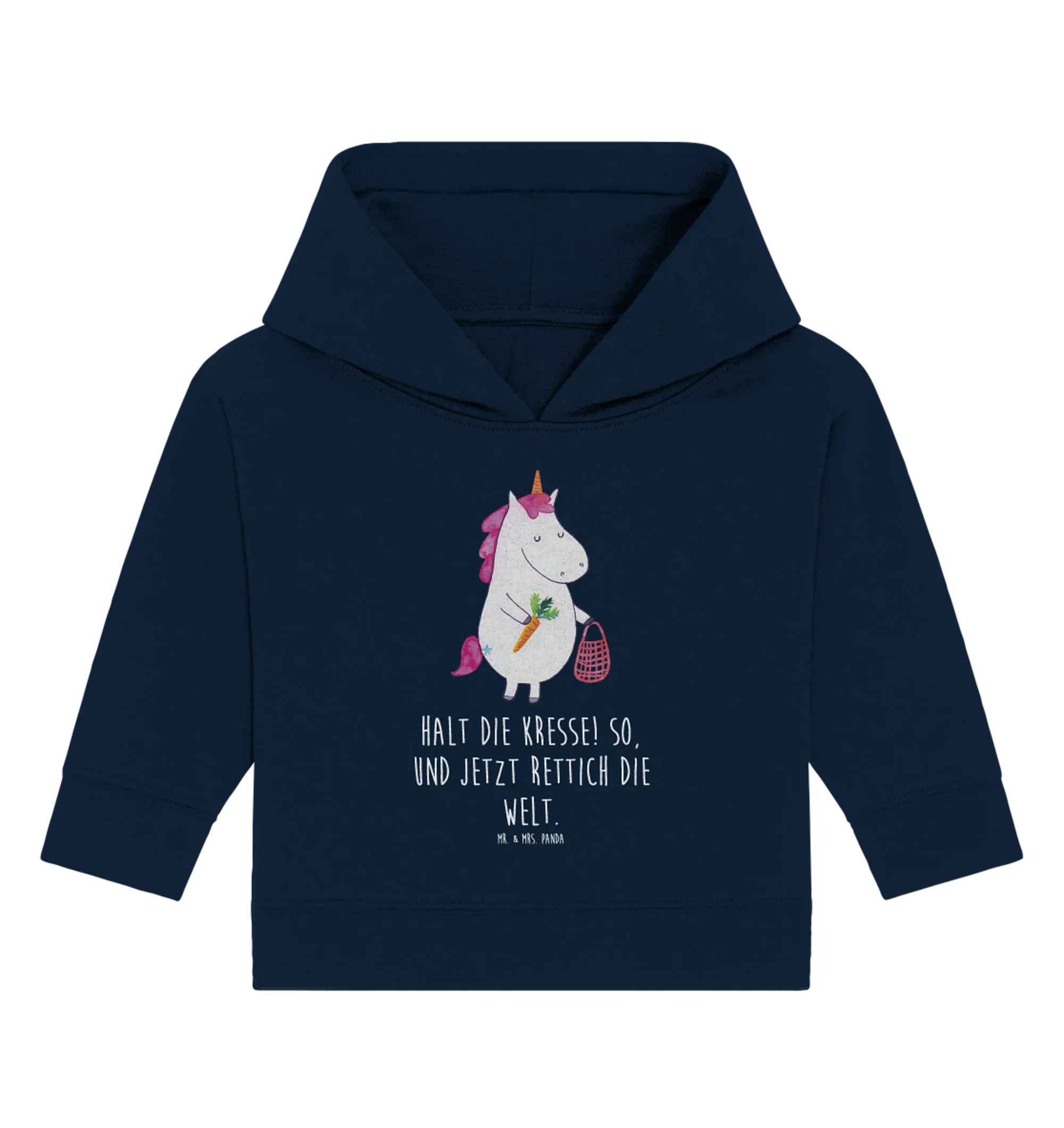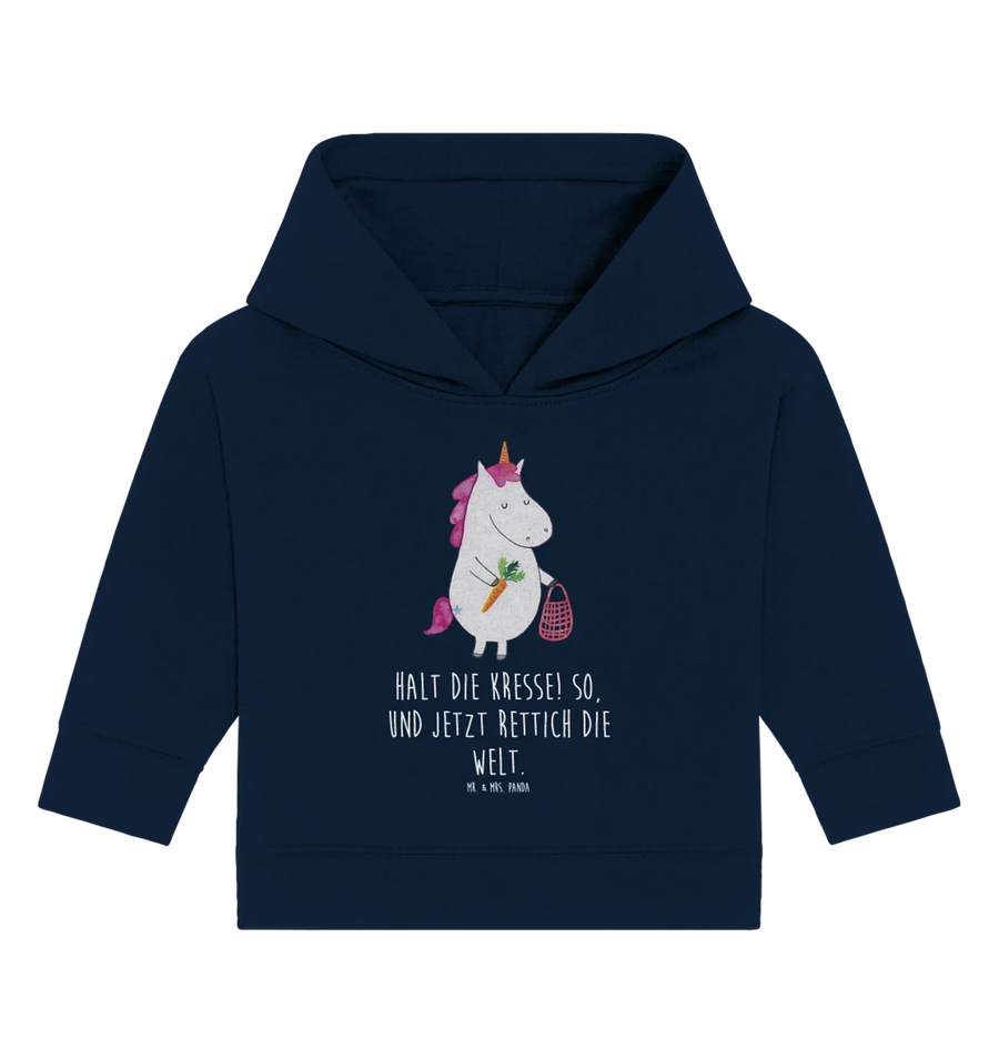 Egal, ob zum ersten Geburtstag, zur Babyparty oder einfach nur als süßes Mitbringsel – dieser Hoodie ist ein tolles Geschenk für alle kleinen Einhorn-Fans! Und sicher werden auch die Eltern begeistert sein! Das charmante Design und der lustige Spruch "Halt die Kresse! So, und jetzt Rettich die Welt" bringen jedem ein Lächeln ins Gesicht.