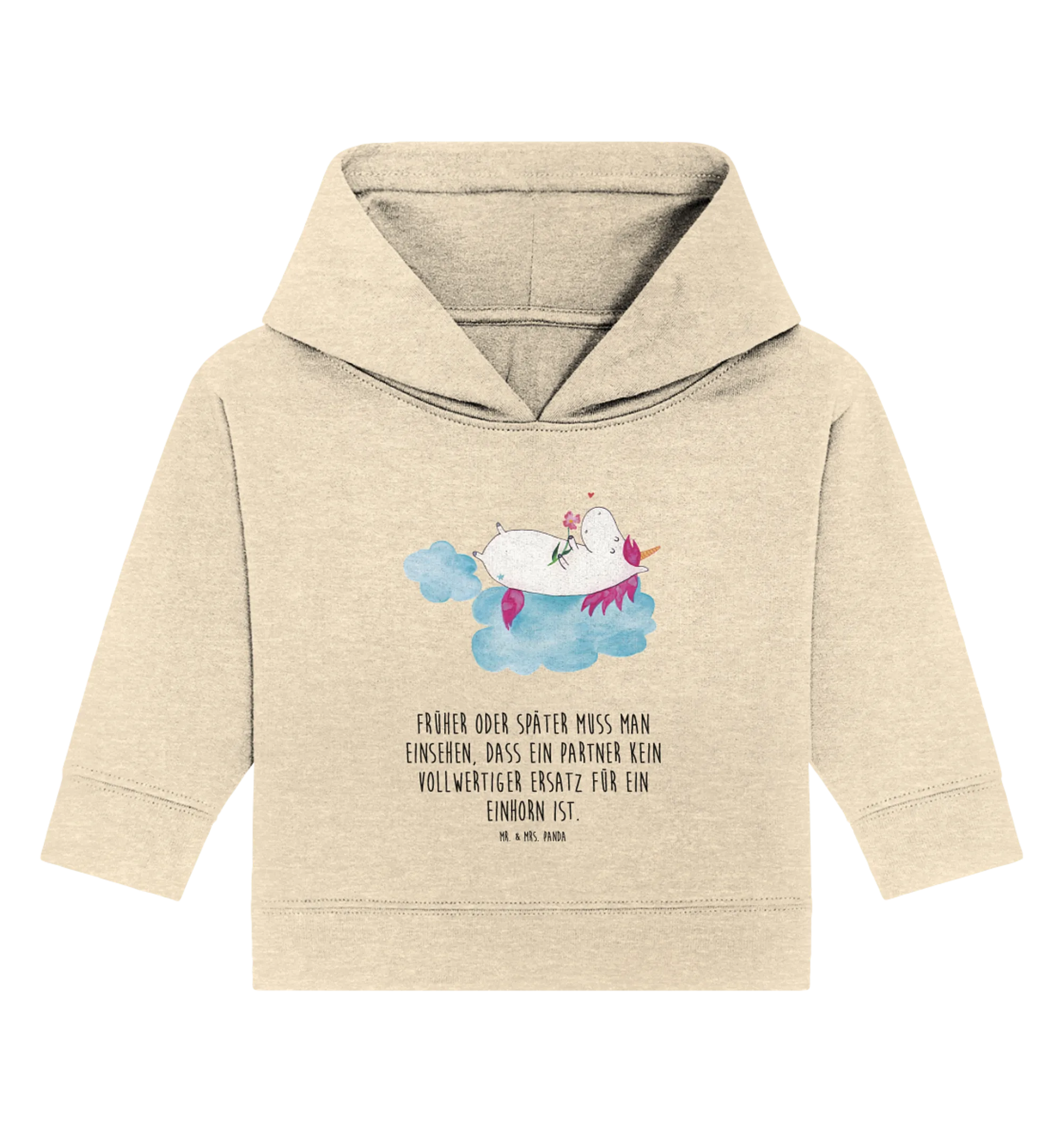 Der Organic Baby Hoodie "Einhorn verliebt auf Wolke" aus der zauberhaften Einhorn-Kollektion von Mr. & Mrs. Panda ist ein Must-Have für kleine Einhorn-Fans! Dieser niedliche Kapuzensweatshirt sorgt nicht nur für Komfort, sondern bringt auch ein bisschen Magie in den Alltag deines Lieblings. Die süße Zeichnung eines verliebten Einhorns, das entspannt auf einer Wolke schwebt, wird jedes Herz im Nu erobern. Und das Beste daran? Die Botschaft ist unwiderstehlich: "Früher oder später muss man einsehen, dass ein Partner kein vollwertiger Ersatz für ein Einhorn ist." Ein toller Spruch, der zeigen soll, wie besonders und einzigartig Einhörner sind.