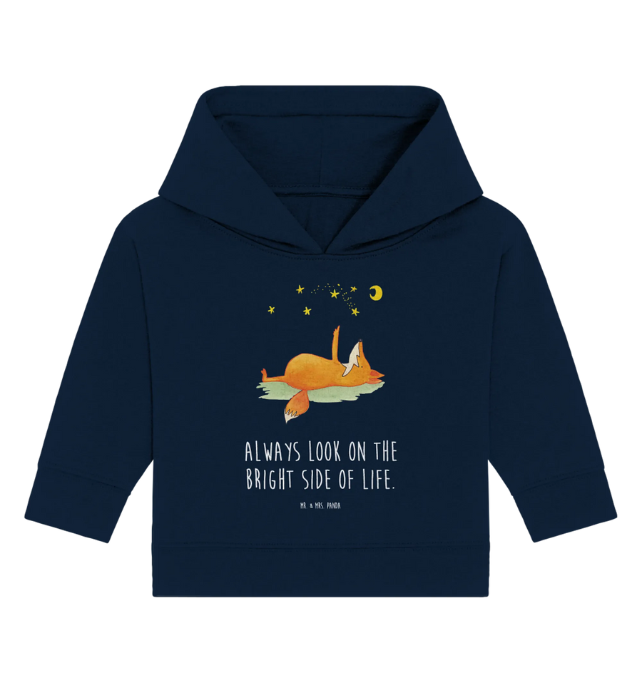 Der Organic Baby Hoodie mit dem süßen Motiv "Fuchs Sterne" aus der beliebten Fuchs-Kollektion von Mr. & Mrs. Panda ist das perfekte Geschenk für kleine Träumer und Sternengucker. Wenn dein Baby in diesem bezaubernden Hoodie steckt, wird es nicht nur warm und gemütlich gehalten, sondern sieht auch fantastisch aus! Das besondere Design zeigt einen süßen Fuchs, der entspannt auf seinem Rücken liegt und fasziniert in den nächtlichen Sternenhimmel schaut. Diese Kombination aus einem liebevollen Motiv und einer positiven Botschaft, "Always look on the bright side of life", bringt sowohl eine nostalgische als auch eine fröhliche Stimmung zum Ausdruck.