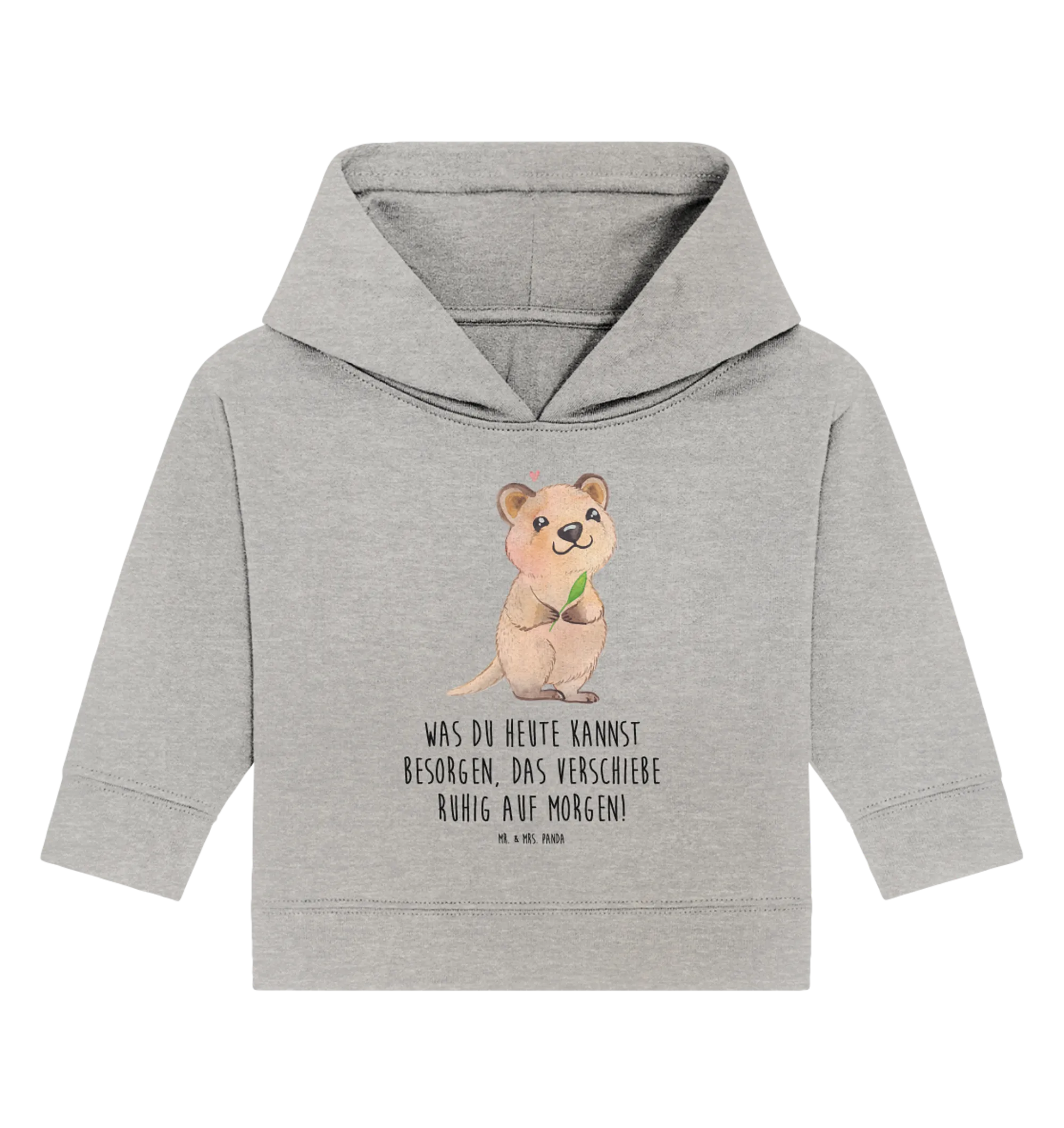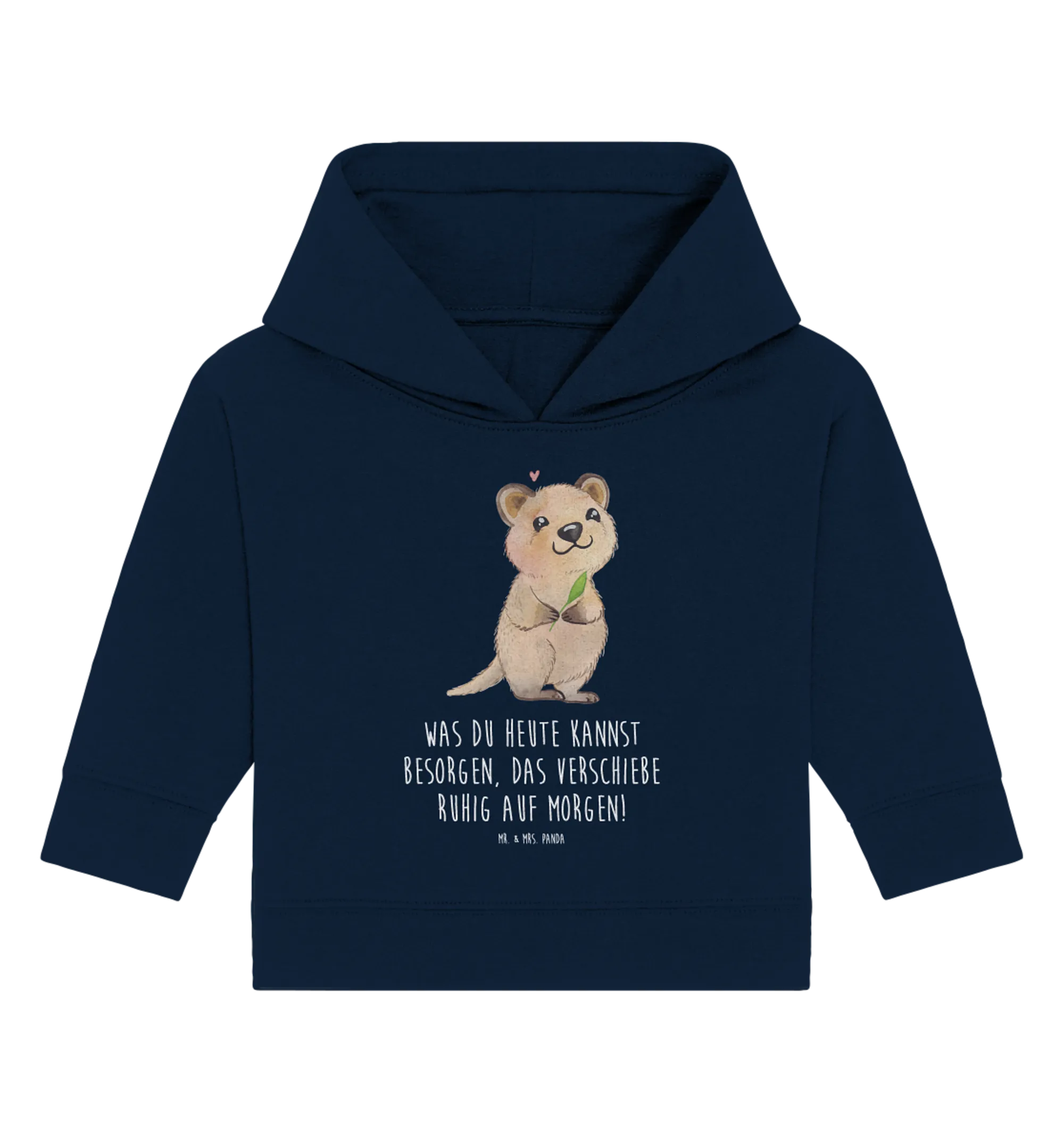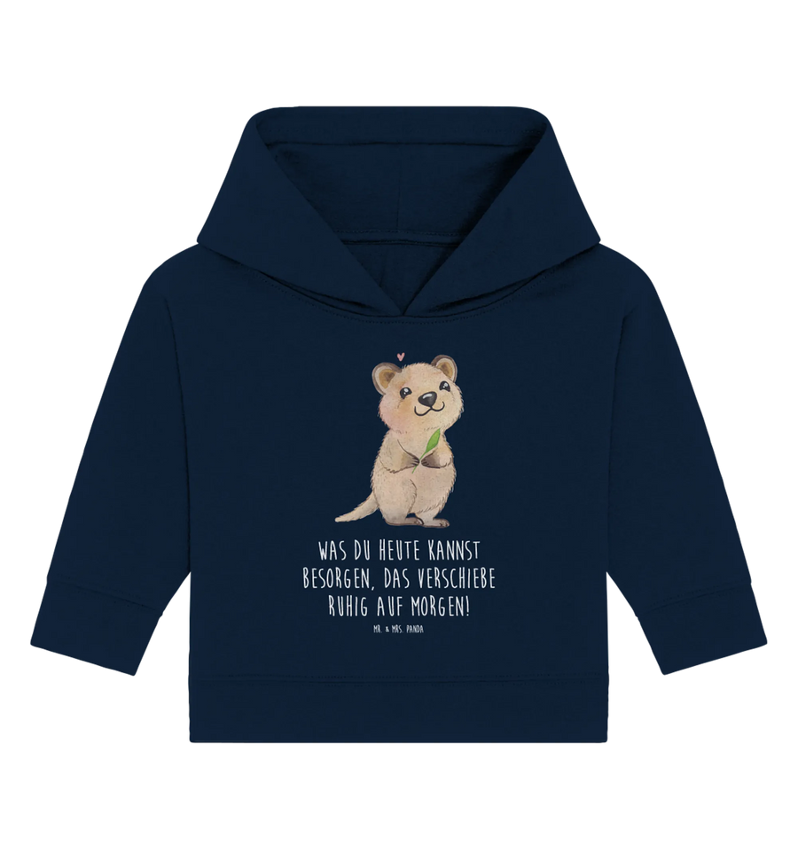 Dieses niedliche Baby Kapuzenshirt aus der Small World Kollektion von Mr. & Mrs. Panda vereint ein zauberhaftes Tiermotiv mit einem frechen, lustigen Spruch: „Was du heute kannst besorgen, das verschiebe ruhig auf morgen!“ 😄 Das Quokka steht aufrecht, lächelt freundlich, hält ein grünes Blatt und hat ein kleines rosa Herz über dem Kopf – ein Motiv, das sofort gute Laune verbreitet.
