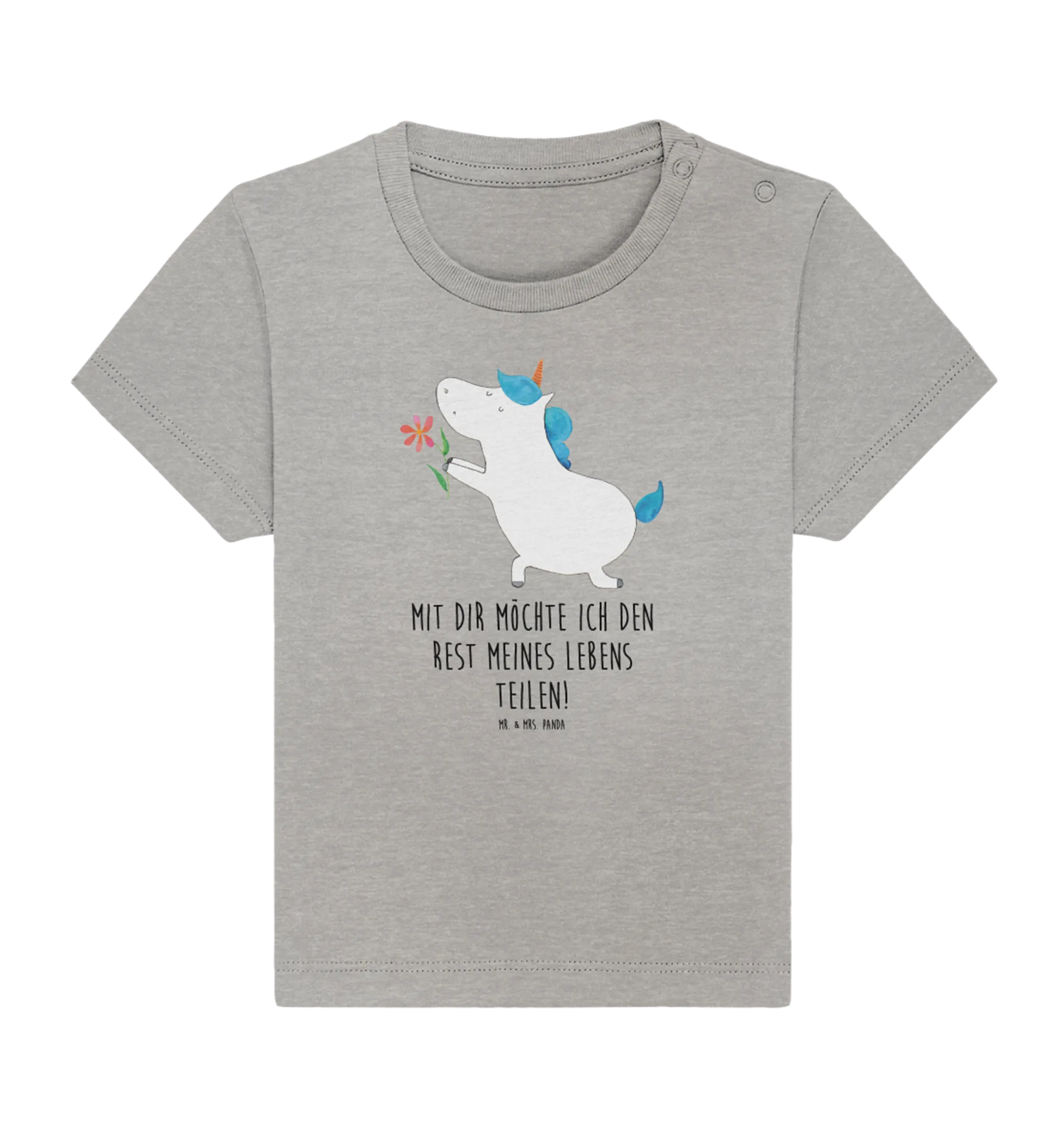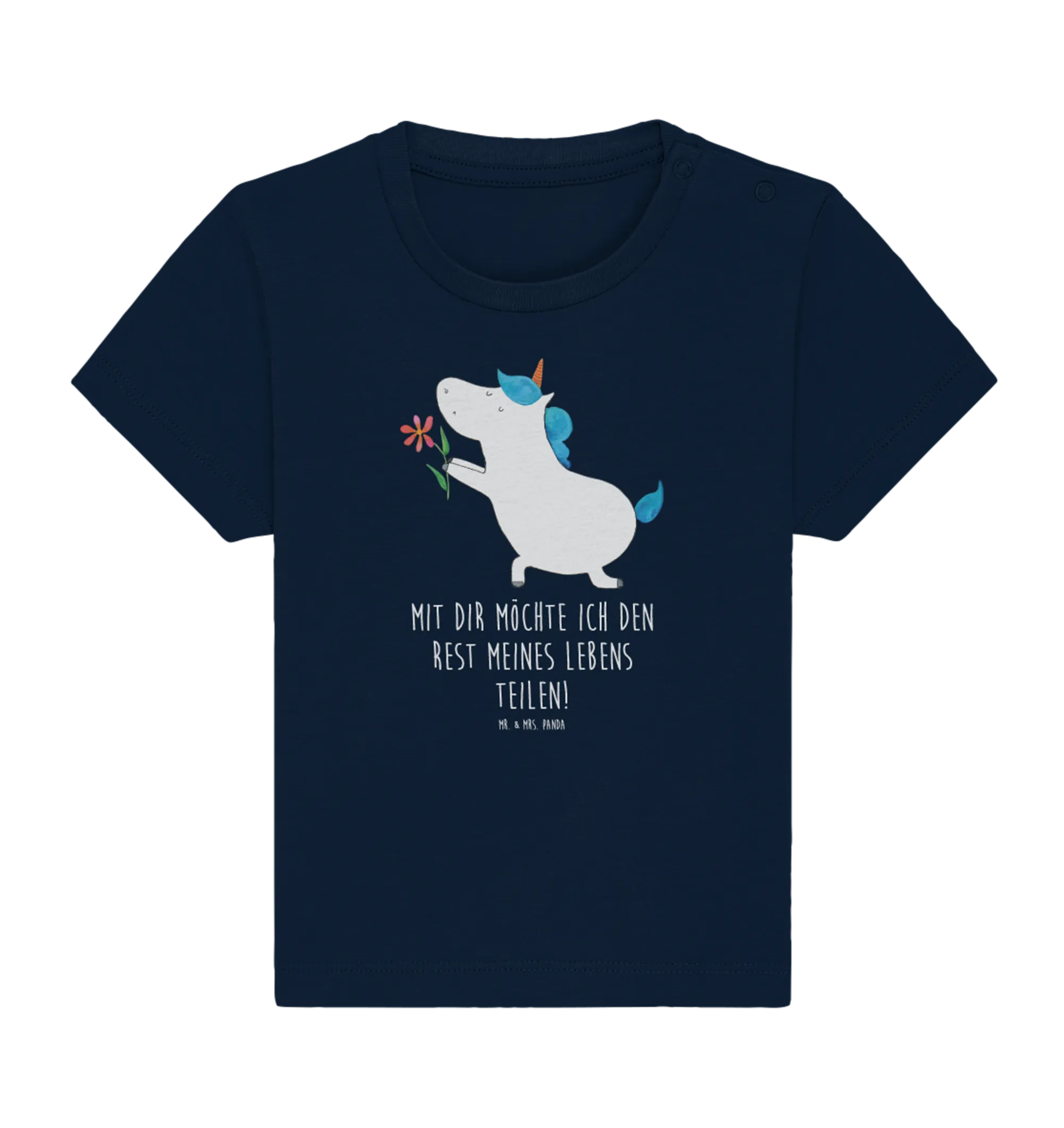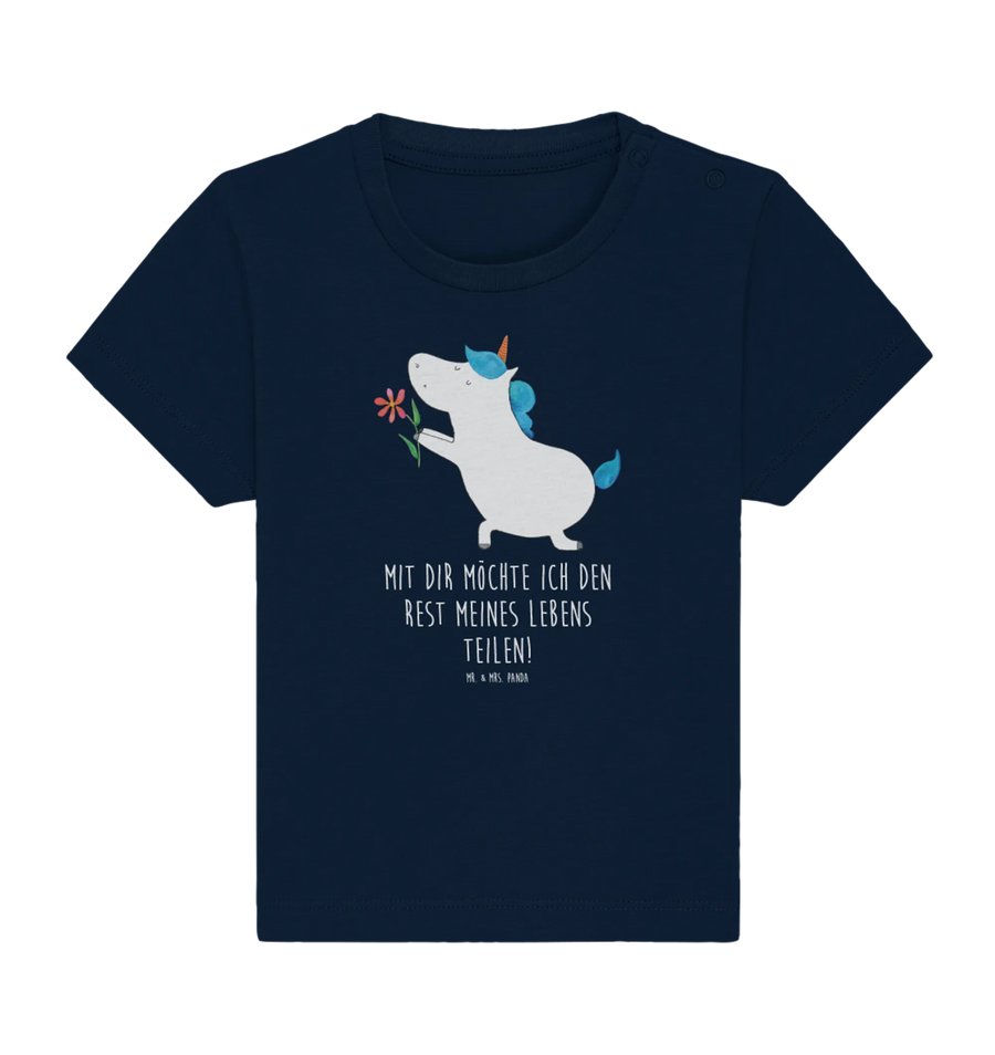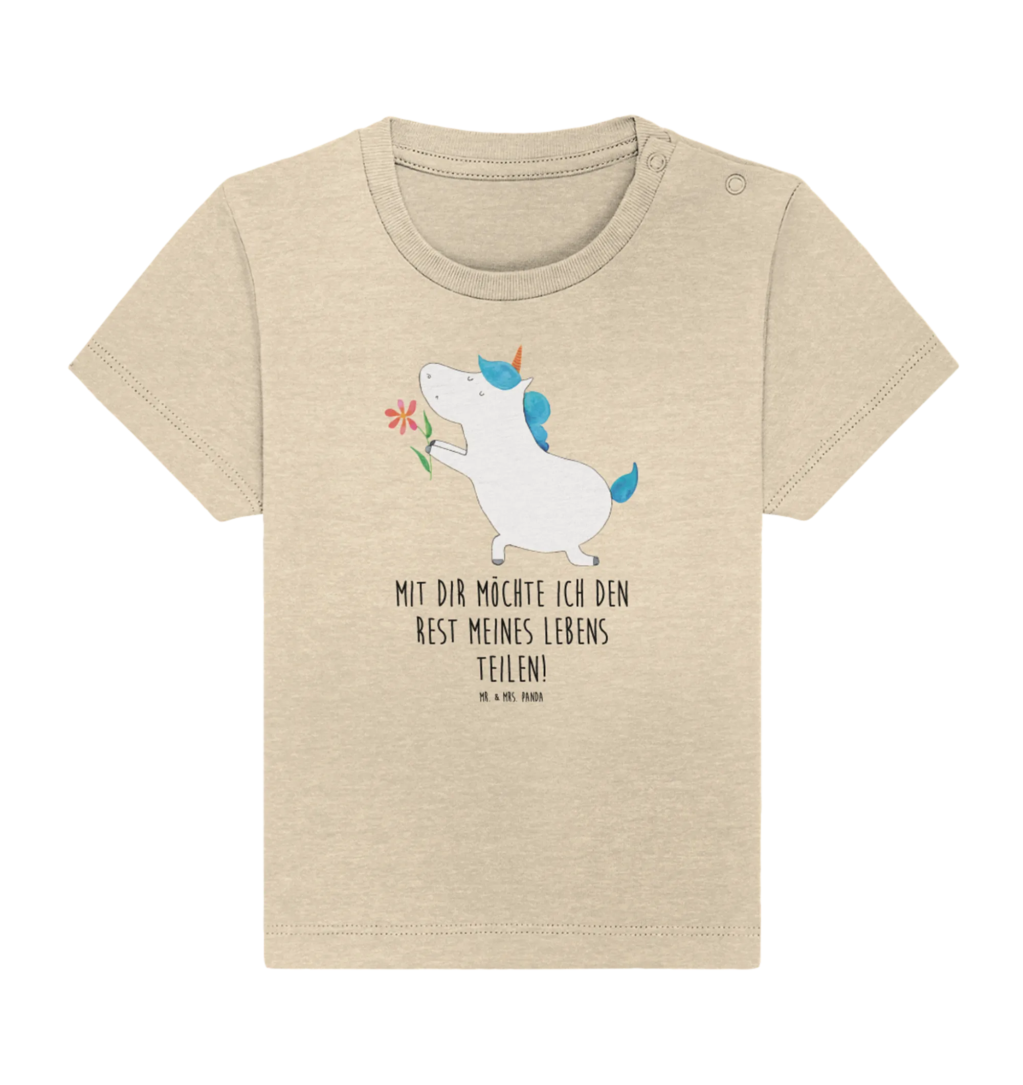 Entdecke das zauberhafte Organic Baby Shirt mit dem niedlichen Einhorn Blume-Motiv aus unserer besonderen Einhorn-Kollektion von Mr. & Mrs. Panda! Dieses T-Shirt ist nicht nur ein Blickfang, sondern auch eine liebevolle Botschaft. Mit dem Text "Mit dir möchte ich den Rest meines Lebens teilen!" bringt es die tiefe Verbundenheit und die Freude der ersten gemeinsamen Momente zum Ausdruck. Ideal für kleine Abenteurer und Entdecker, die ihren kleinen Lieblingssatz in die Welt tragen möchten.