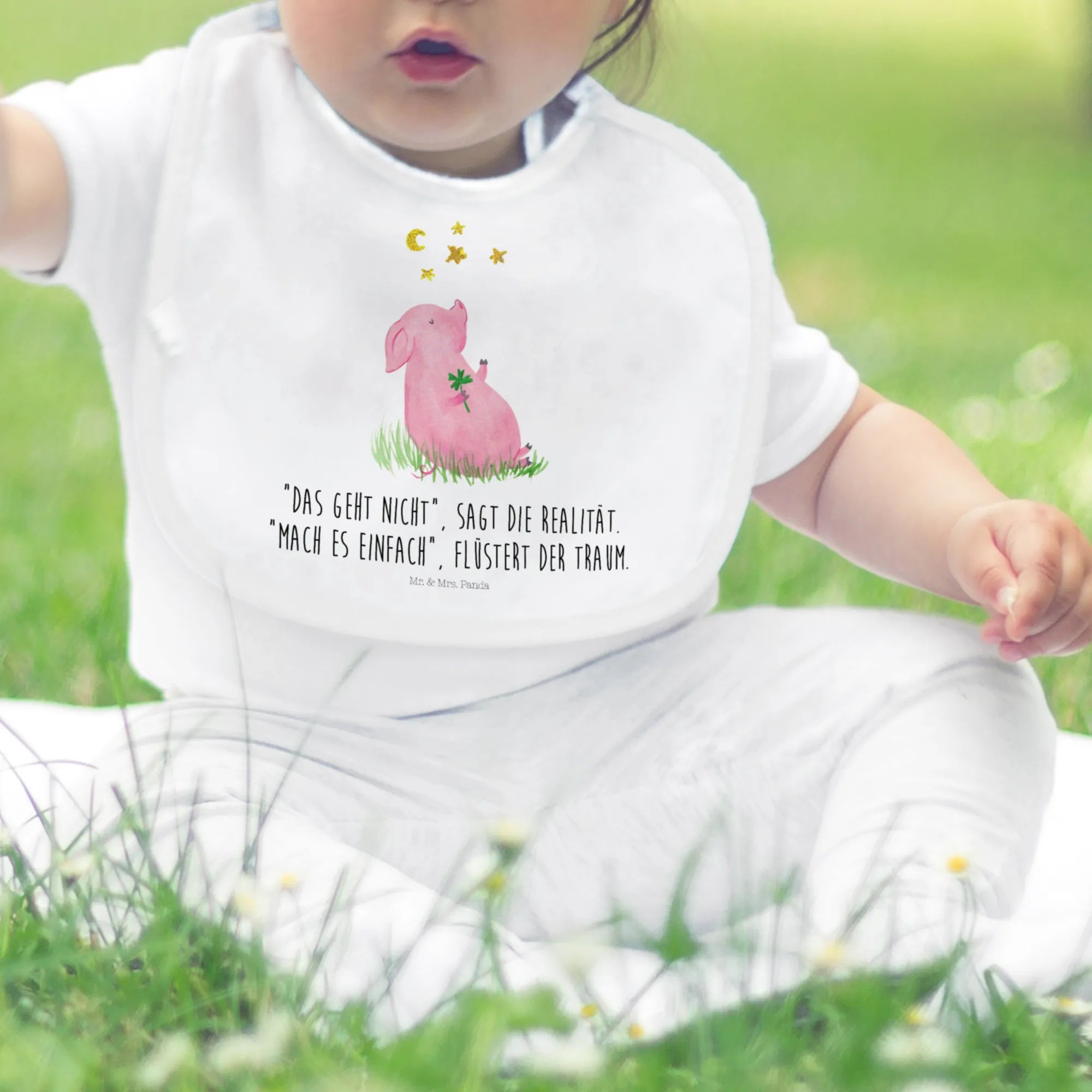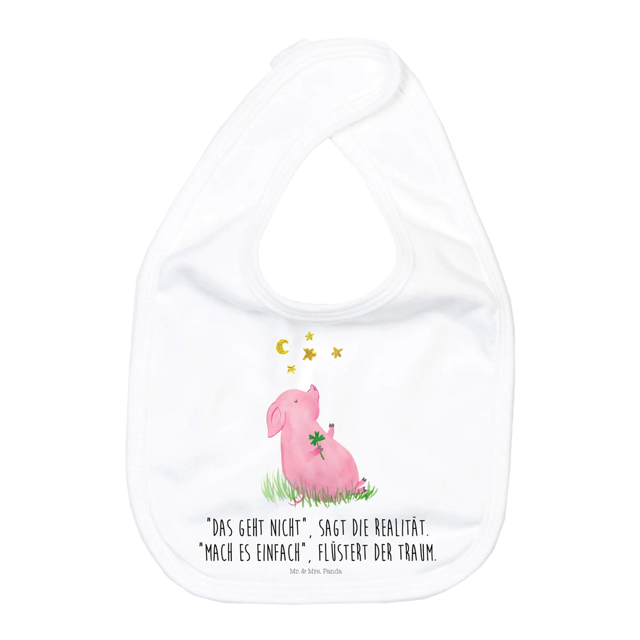 Das wunderschöne Motiv zeigt ein fröhliches Schweinchen, das ein Kleeblatt in der Hand hält - das Symbol für Glück und Zufriedenheit. Die weiche Baumwolle sorgt dafür, dass sich dein Baby wohlfühlt, während es Ziele und Träume formt. Ob als Geschenk zur Geburt, zur Babyparty oder einfach nur, um deinem eigenen Sprössling eine Freude zu machen, dieses Babylätzchen ist eine wunderbare Wahl.