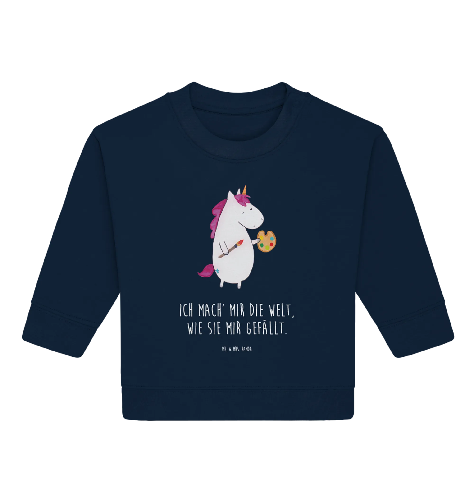 Entdecke den zauberhaften Organic Baby Pullover mit dem einzigartigen Einhorn Künstler Motiv aus der Einhorn Kollektion von Mr. & Mrs. Panda. Dieses niedliche Design zeigt ein entzückendes Einhorn, das an einer Staffelei zeichnet, umgeben von einer bunten Palette und vielen Farben. Perfekt für alle kleinen Kreativen und Kunstliebhaber!