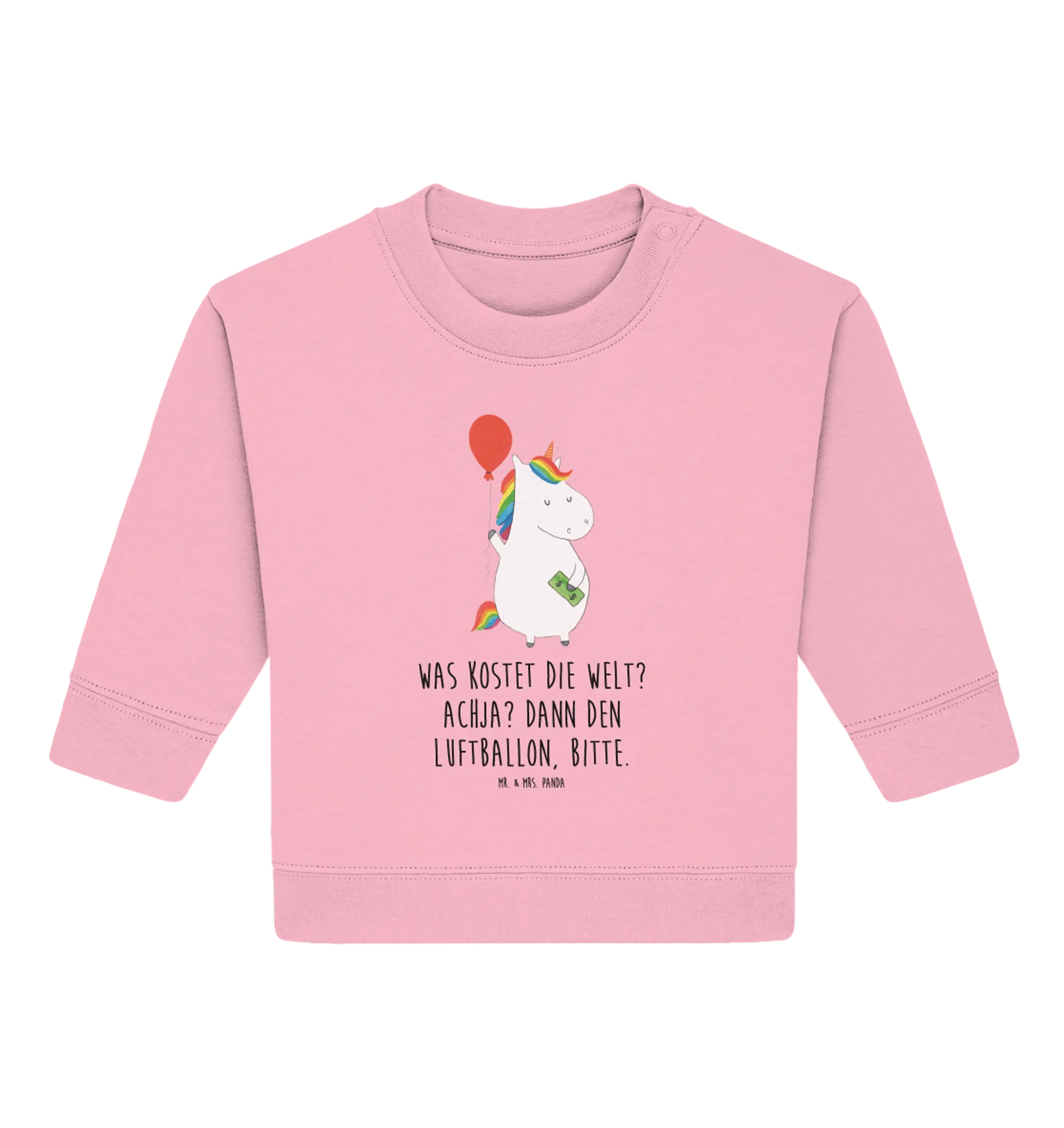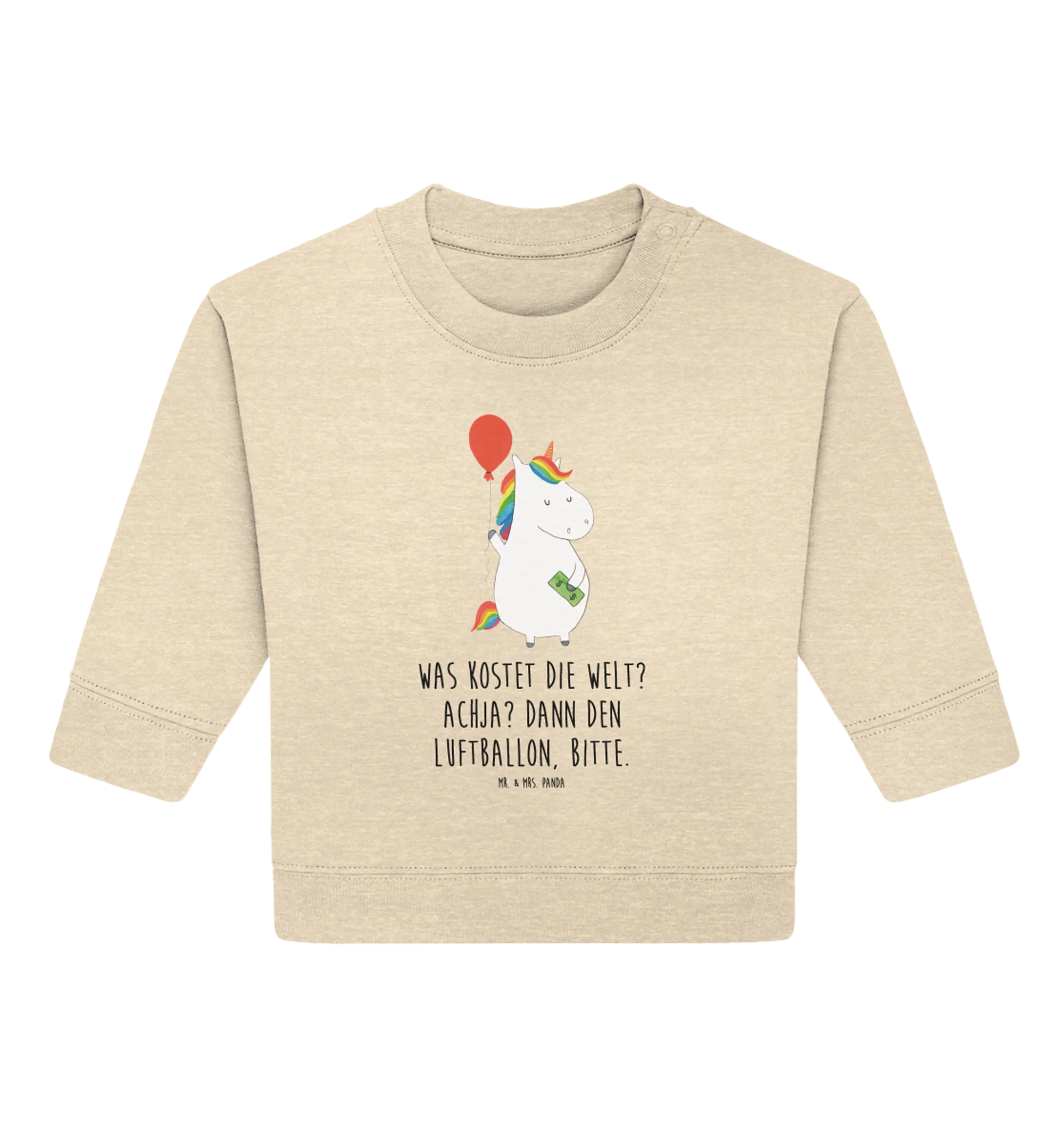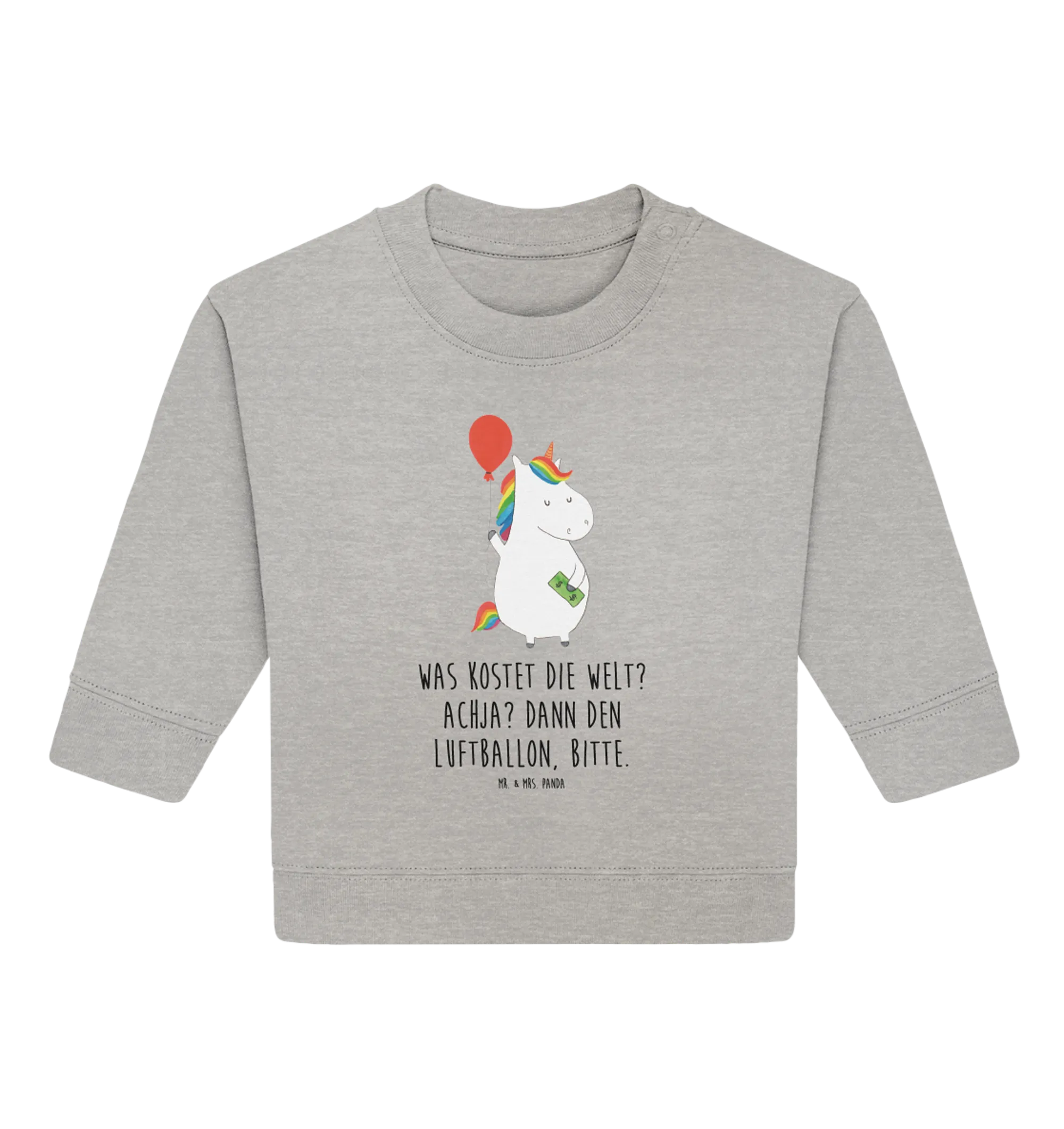 Du suchst den perfekten Baby Pullover? Unser Organic Baby Pullover mit dem zauberhaften Einhorn Luftballon Motiv ist genau das Richtige für kleine Einhorn-Fans! Dieses süße Einhorn hat in der einen Hand ein paar Geldscheine und in der anderen einen bunten Luftballon, mit einem charmanten Spruch: "Was kostet die Welt? Achja? Dann den Luftballon, bitte."
