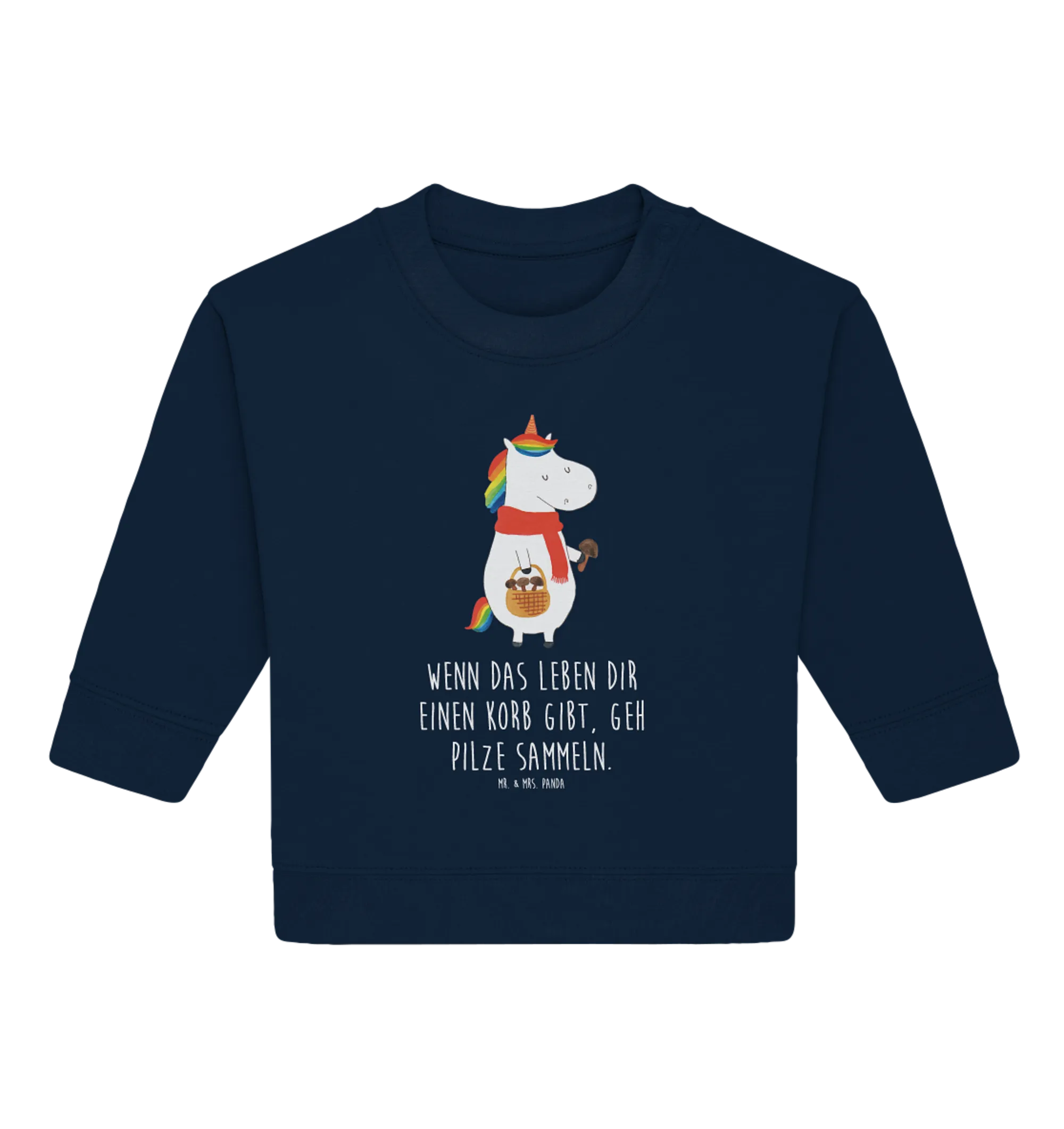 Die Einhorn-Motive sind ein echter Trend, und mit dem Spruch 'Wenn das Leben dir einen Korb gibt, geh Pilze sammeln' wird das Design noch einzigartiger. Auch ohne den Spruch bleibt der Pullover im Hochkant-Design ein absoluter Hingucker. Die Einhorn - Kollektion von Mr. & Mrs. Panda bietet dabei noch viele weitere Produkte, die Kinderaugen zum Strahlen bringen.