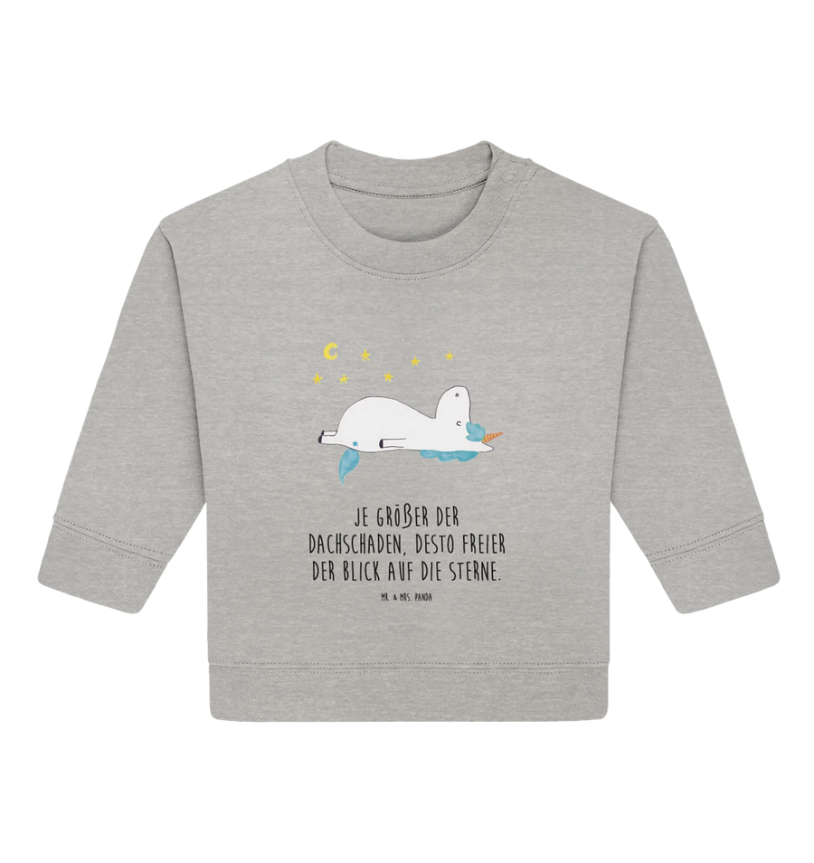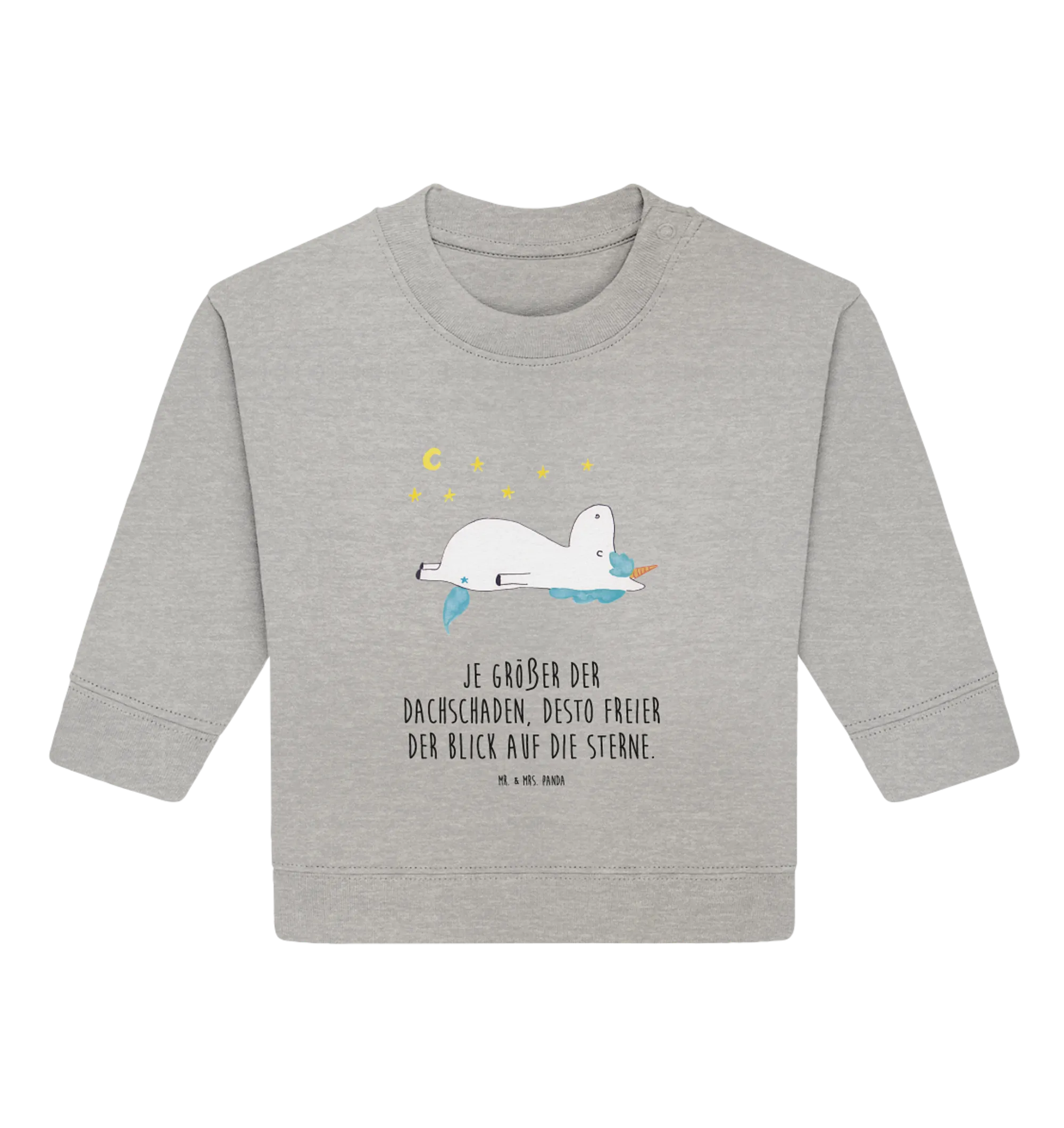 Du suchst nach einem besonderen Geschenk zur Geburt, zur Taufe oder einfach nur so, um kleine Einhorn-Liebhaber glücklich zu machen? Dann ist dieser Baby Pullover genau das Richtige! Das Motiv zeigt ein süßes Einhorn, das den funkelnden Sternenhimmel bewundert. Der Spruch "Je größer der Dachschaden, desto freier der Blick auf die Sterne." bringt eine fröhliche Botschaft, die perfekt zur unbeschwerten Welt der Kleinen passt. Unsere Einhorn-Kollektion enthält zahlreiche Produkte, die sich ideal für jene Momente eignen, in denen man seinen Lieben eine Freude machen möchte.