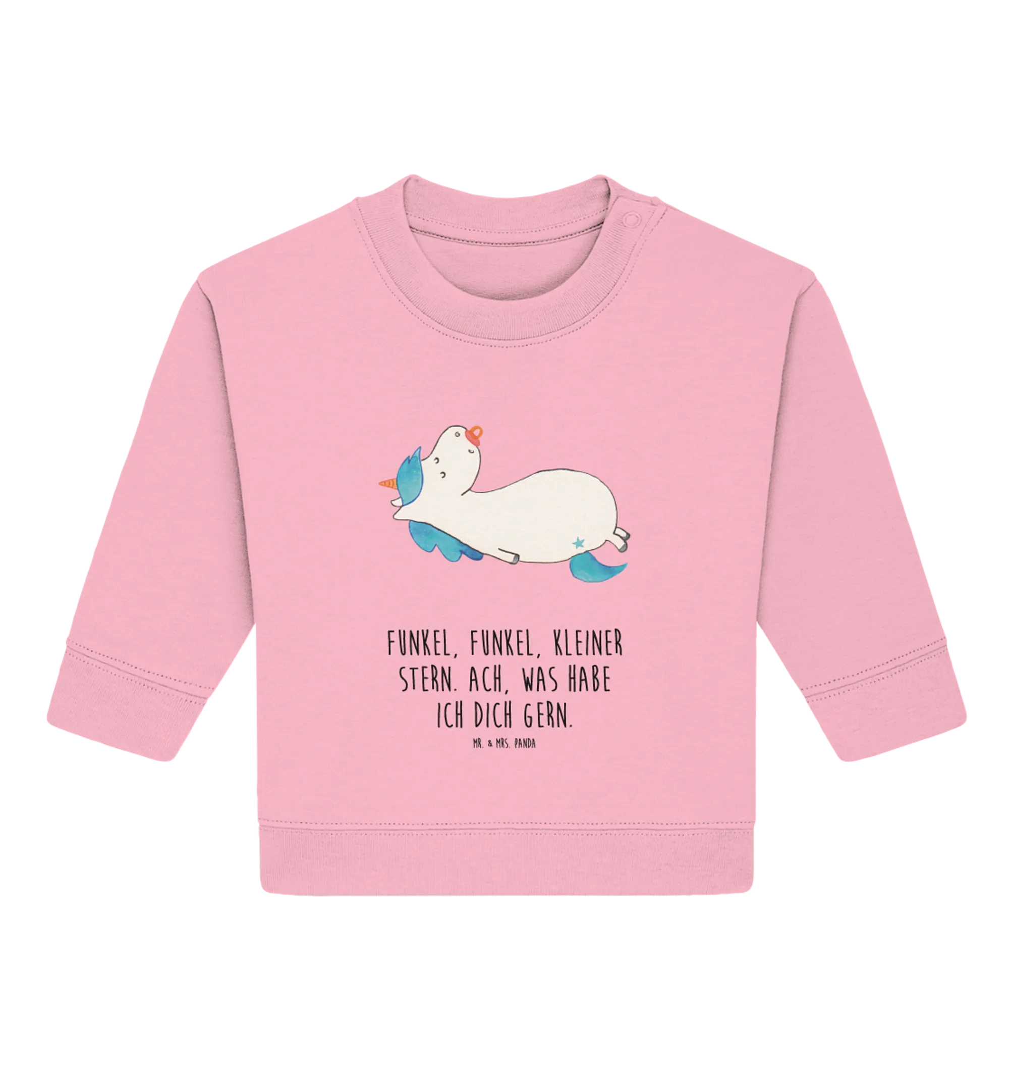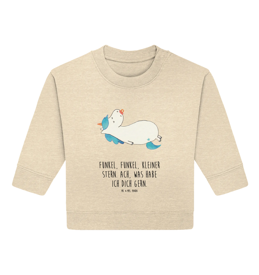 Der Organic Baby Pullover Einhorn Schnullie aus der zauberhaften Einhorn-Kollektion von Mr. & Mrs. Panda ist das perfekte Geschenk für angehende Eltern und deren kleine Schätze! Hergestellt aus hochwertiger Öko-Baumwolle, bietet dieser Pullover nicht nur einen unglaublich hohen Tragekomfort, sondern ist auch sanft zur empfindlichen Babyhaut. Das niedliche Einhorn-Motiv, das liebevoll von Mrs. Panda handgezeichnet wurde, zeigt ein süßes Einhorn, das friedlich mit einem Schnuller im Mund schläft. Immer begleitet von unserem kleinen Liedchen: "Funkel, Funkel, kleiner Stern. Ach, was habe ich dich gern."