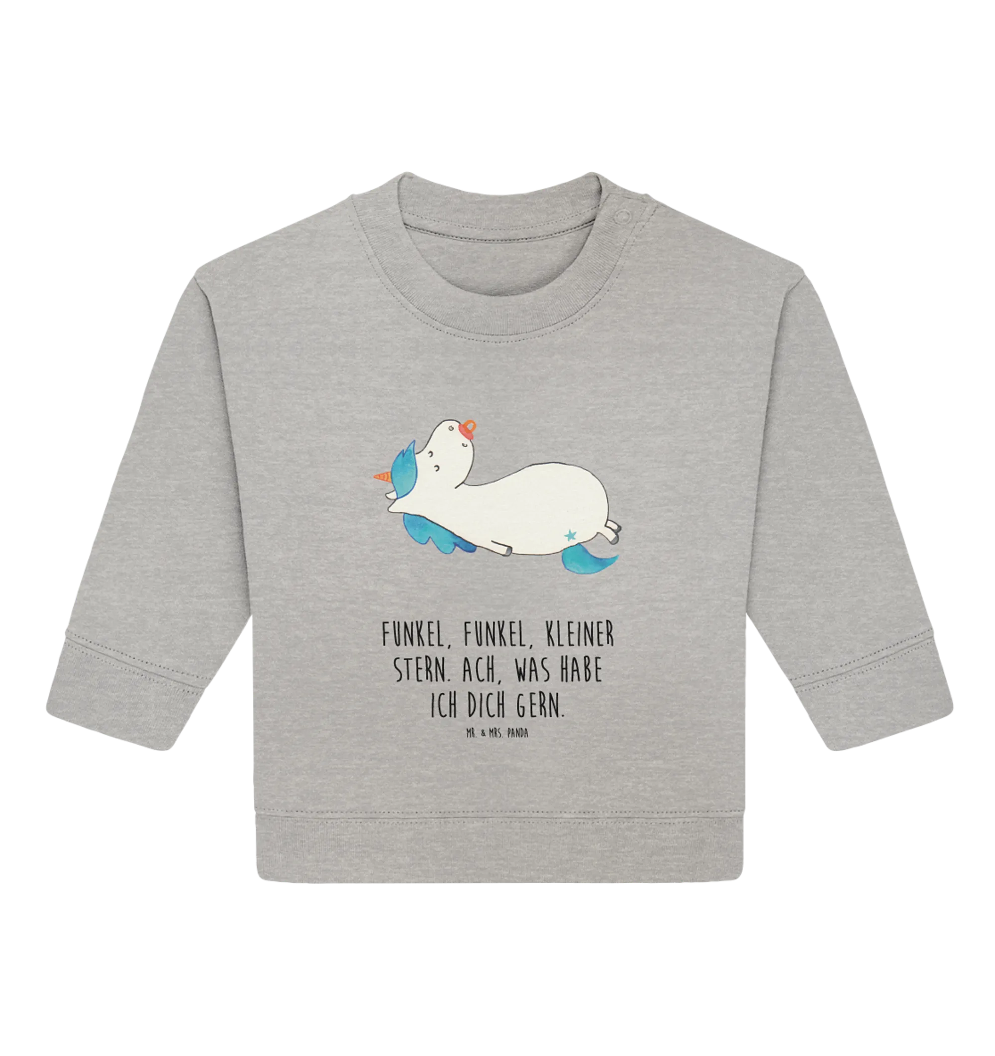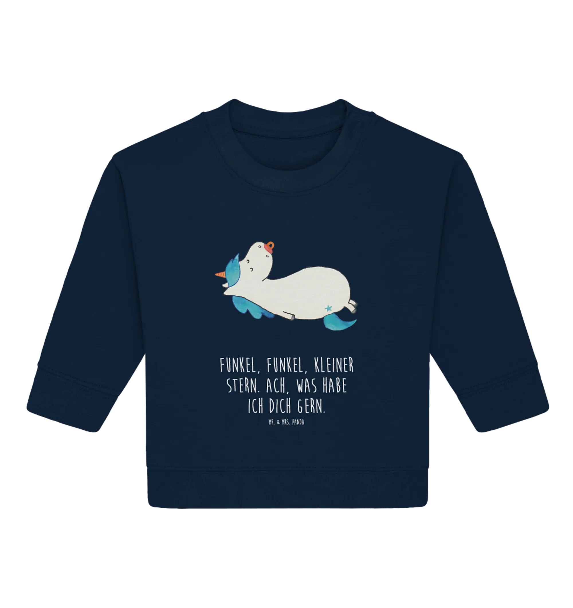 Wenn Du Einhörner liebst, wirst Du mit diesem Baby Sweater aus der Einhorn Kollektion von Mr. & Mrs. Panda viel Freude haben. Alle Motive sind handgezeichnet und verleihen dem Pullover eine ganz persönliche Note. Das Motiv mit dem kleinen Einhorn und dem Slogan "Funkel, Funkel, kleiner Stern. Ach, was habe ich dich gern." versprüht eine warme, liebevolle Atmosphäre.