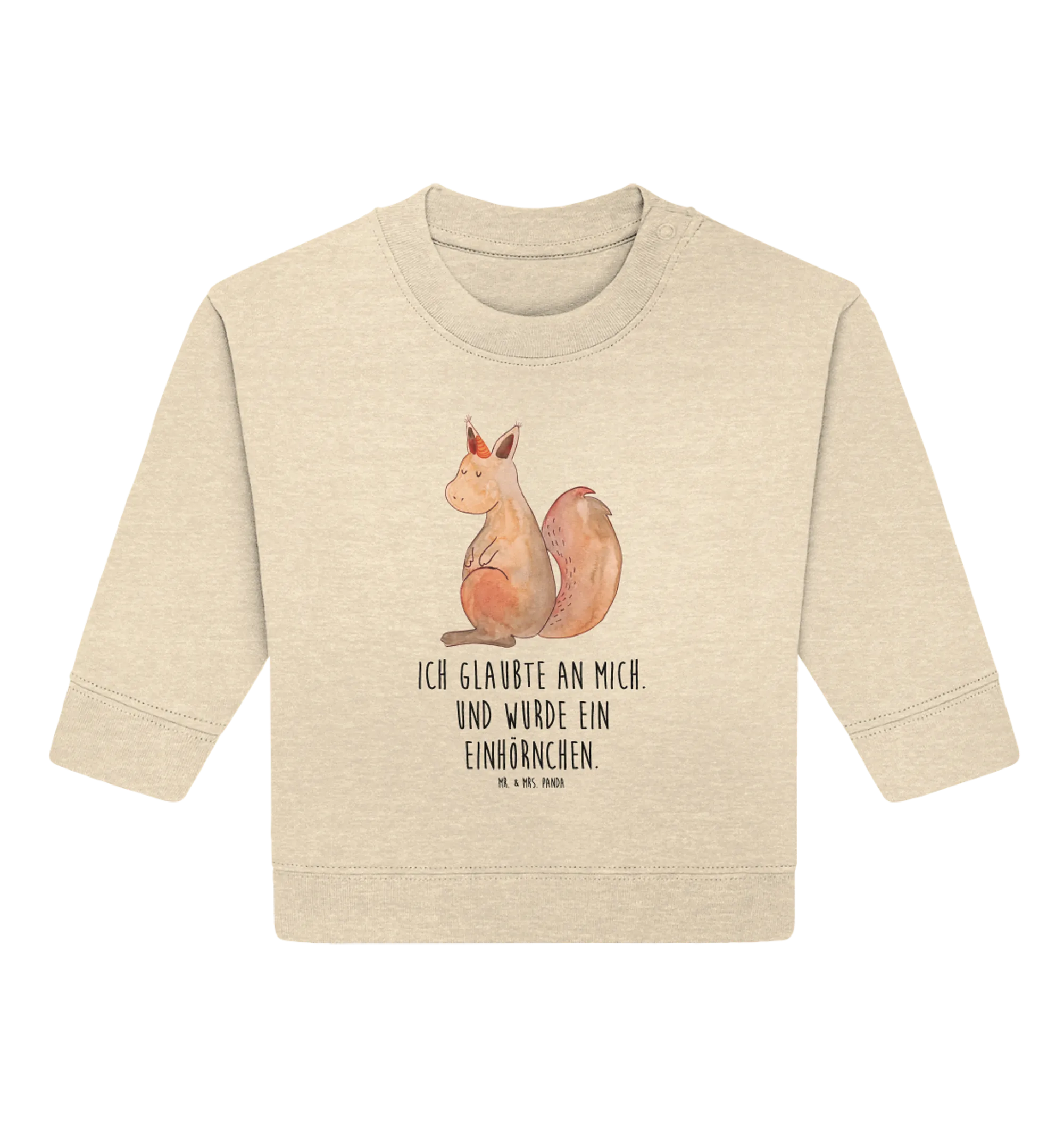 Der Organic Baby Pullover Einhörnchen Glaube aus der bezaubernden Einhorn-Kollektion von Mr. & Mrs. Panda ist das perfekte Geschenk für alle kleinen Einhorn-Fans! Dieses besondere Oberteil besticht nicht nur durch sein süßes Design mit einem handgezeichneten Einhörnchen und dem inspirierenden Spruch "Ich glaubte an mich. Und wurde ein Einhörnchen.", sondern auch durch seine hervorragende Qualität. Aus 100% Öko Baumwolle gefertigt, sorgt der Pullover für ein angenehmes Tragegefühl und hält die kleinsten Abenteurer schön warm. Ob für den eigenen Wonneproppen oder als liebevolles Geschenk zur Babyparty – dieser Pullover ist ein echter Hingucker und verzaubert jedes Kind!