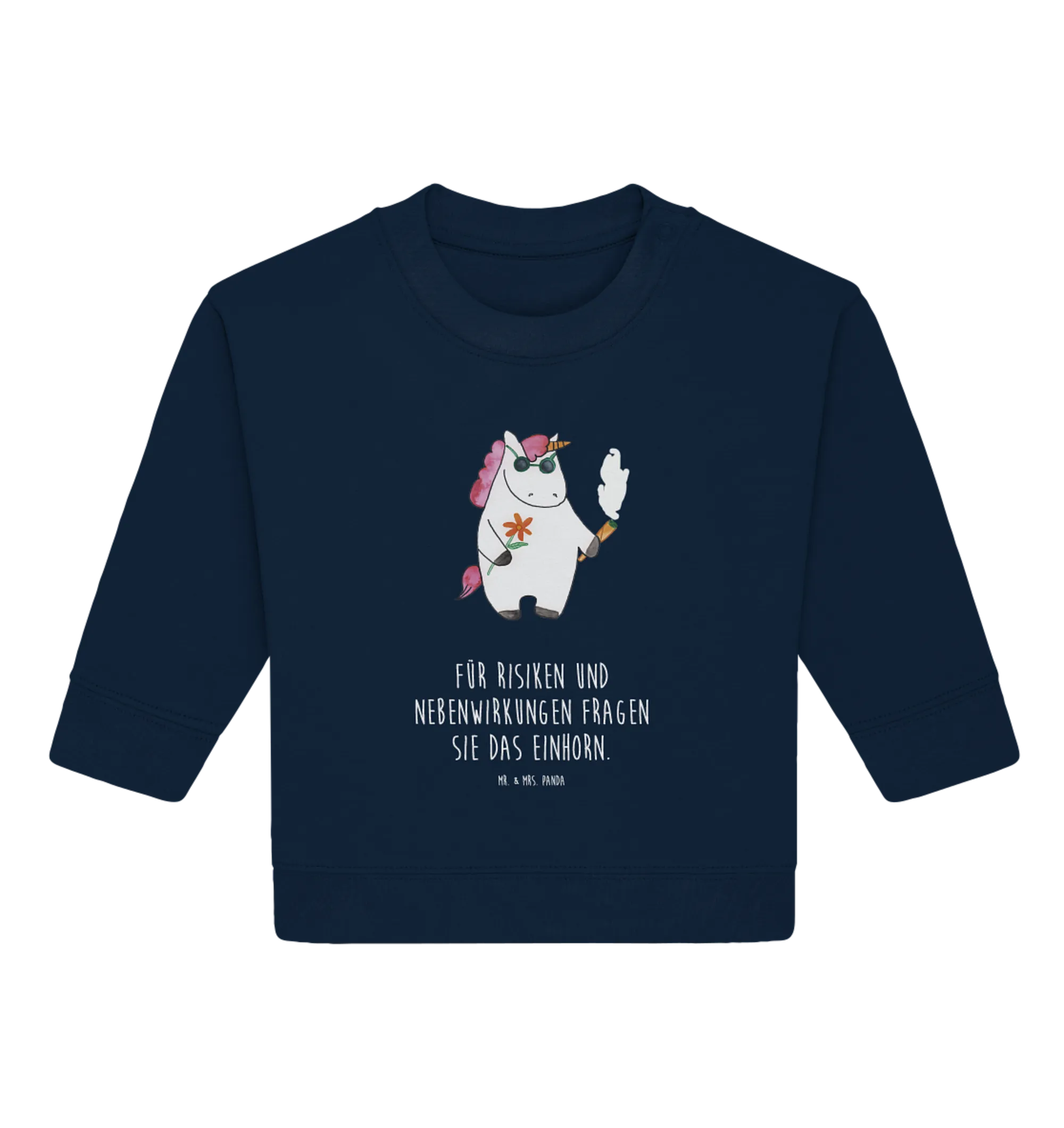 Das Einhorn mit dem Slogan "Für Risiken und Nebenwirkungen fragen Sie das Einhorn." sorgt nicht nur für Lacher, sondern ist auch ein echter Hingucker auf jedem Baby-Kleidertag. Zudem macht sich dieser Pullover hervorragend auf Fotos, wenn die Kleinen die ersten Schritte wagen oder beim Spielen im Freien toben.