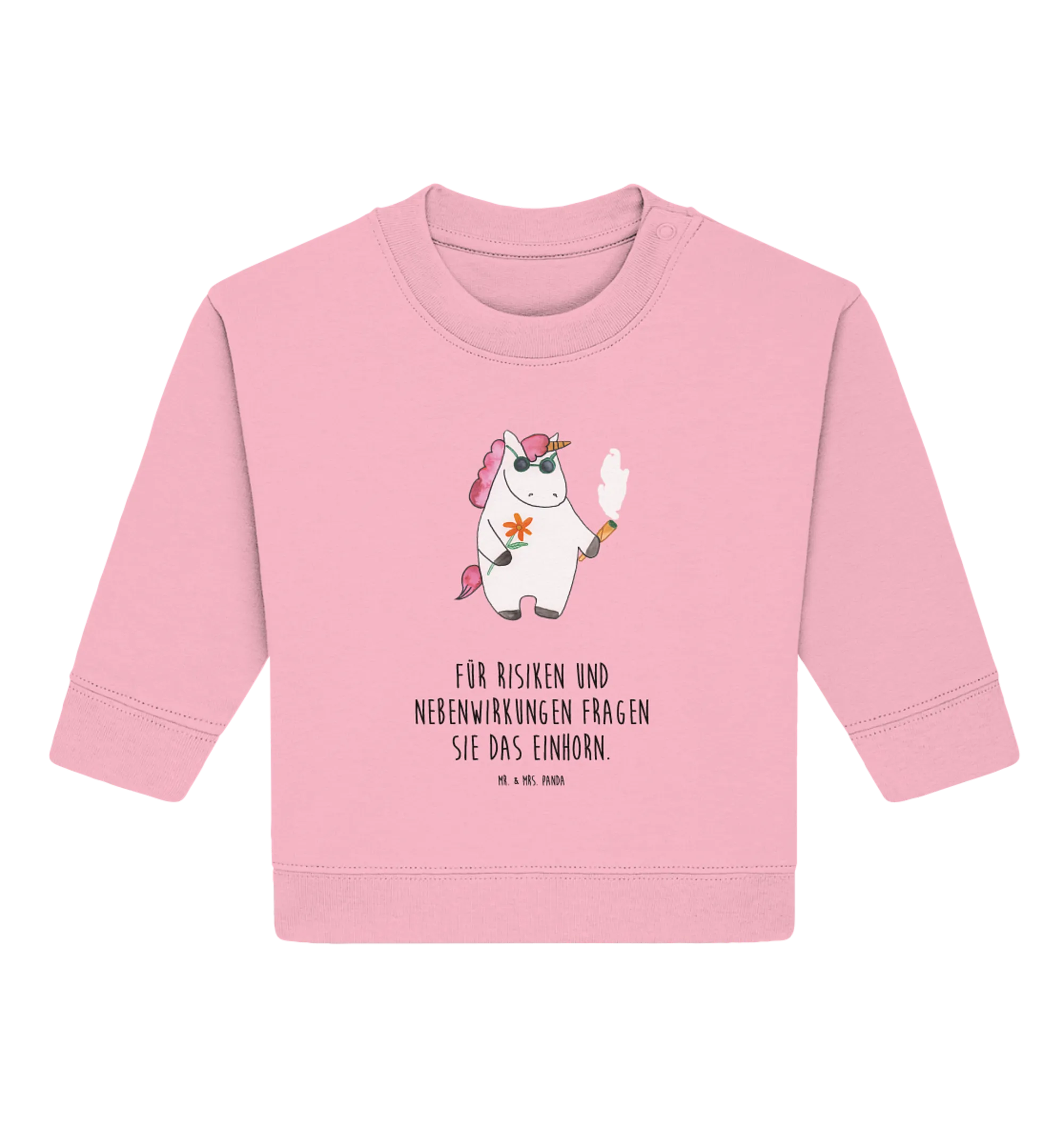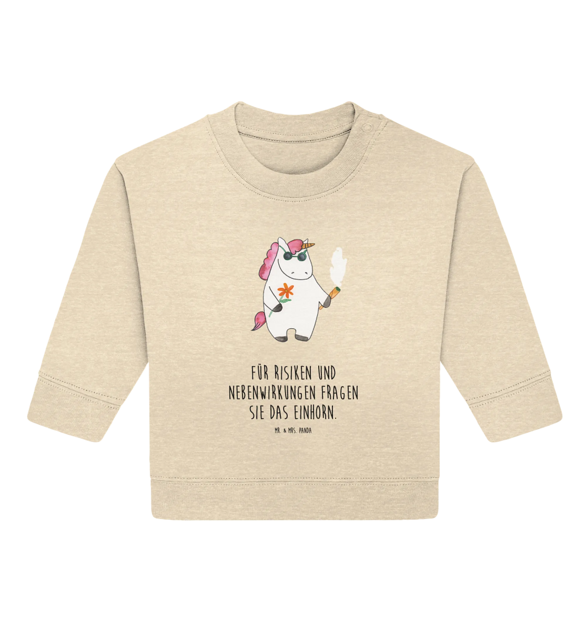 Der Organic Baby Pullover Einhorn Woodstock aus der zauberhaften Einhorn-Kollektion von Mr. & Mrs. Panda ist das perfekte Geschenk für alle kleinen Einhorn-Fans und deren Eltern! Mit einem bunten, witzigen Motiv ist dieser Pullover nicht nur ein echter Hingucker, sondern sorgt auch für jede Menge Spaß und gute Laune. Das süße Einhorn mit seiner Sonnenbrille und dem Joint in der Hand verkörpert ein entspanntes Lebensgefühl, das bereits die Großen begeistert hat. Die Aufschrift „Für Risiken und Nebenwirkungen fragen Sie das Einhorn.“ macht den Pullover zu einem einzigartigen Kleidungsstück, das beim Wickeln oder in der Krabbelgruppe sofort für Aufsehen sorgt.