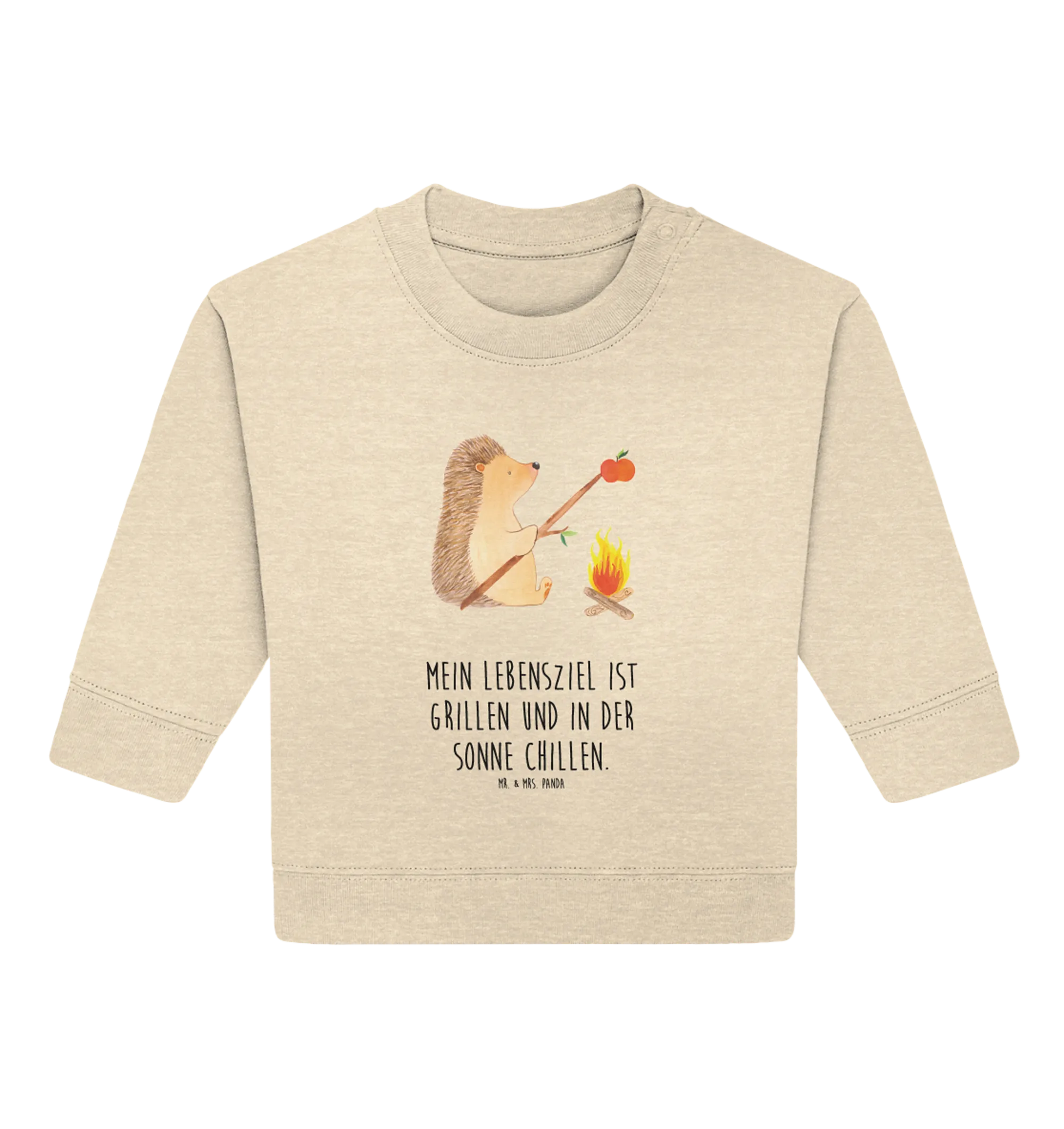 Der Igel grillt – ein magischer Baby Pullover von Mr. & Mrs. Panda! Mit diesem fantastischen Pullover aus 100% Öko-Baumwolle wird Dein kleiner Schatz garantiert alle Blicke auf sich ziehen. Das bezaubernde Motiv zeigt einen niedlichen Igel, der genüsslich einen Apfel über dem offenen Feuer grillt. Er lächelt entspannt, während er die Sonne genießt. Perfekt für alle kleinen Grillfans und Sonnenanbeter!