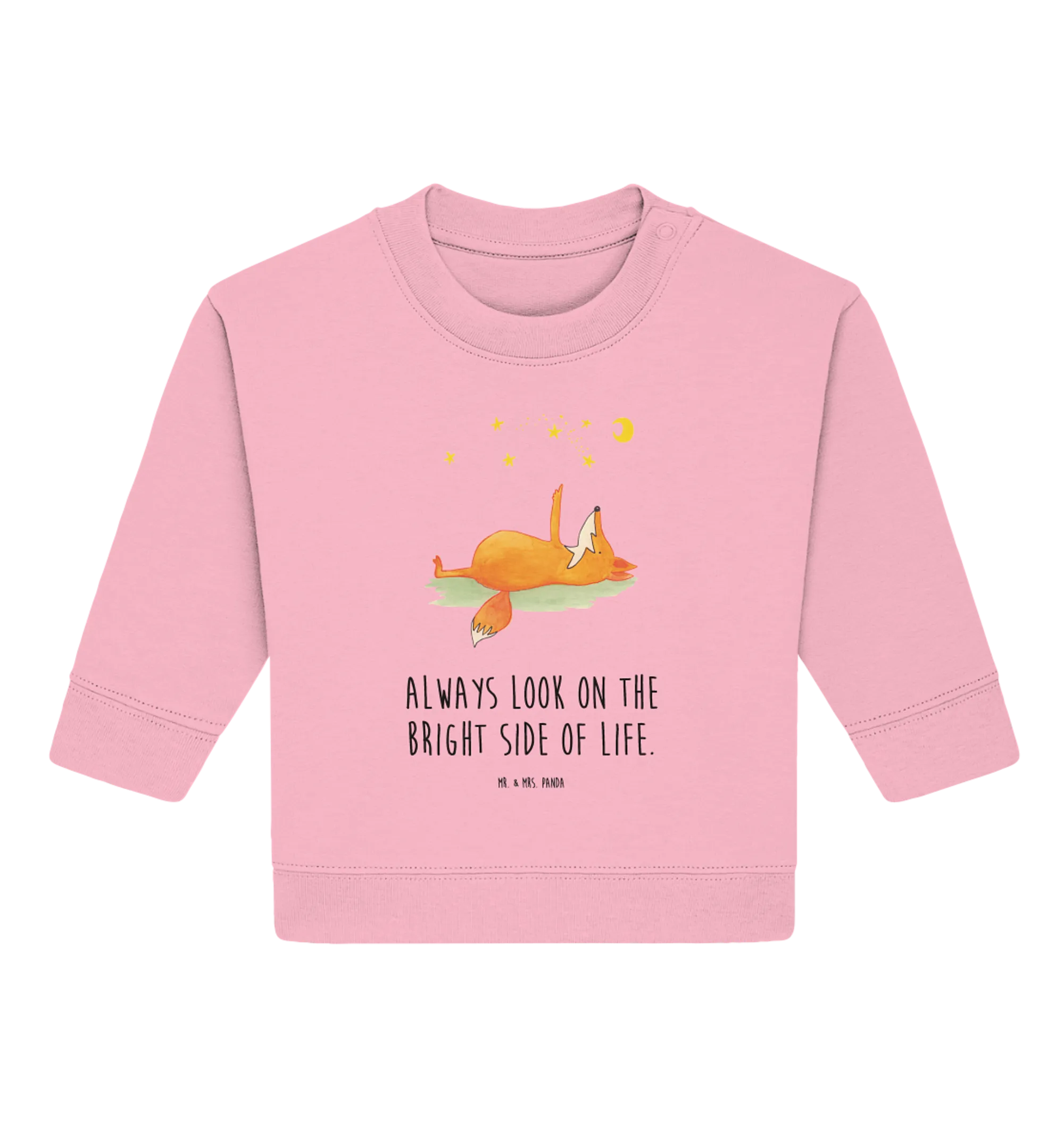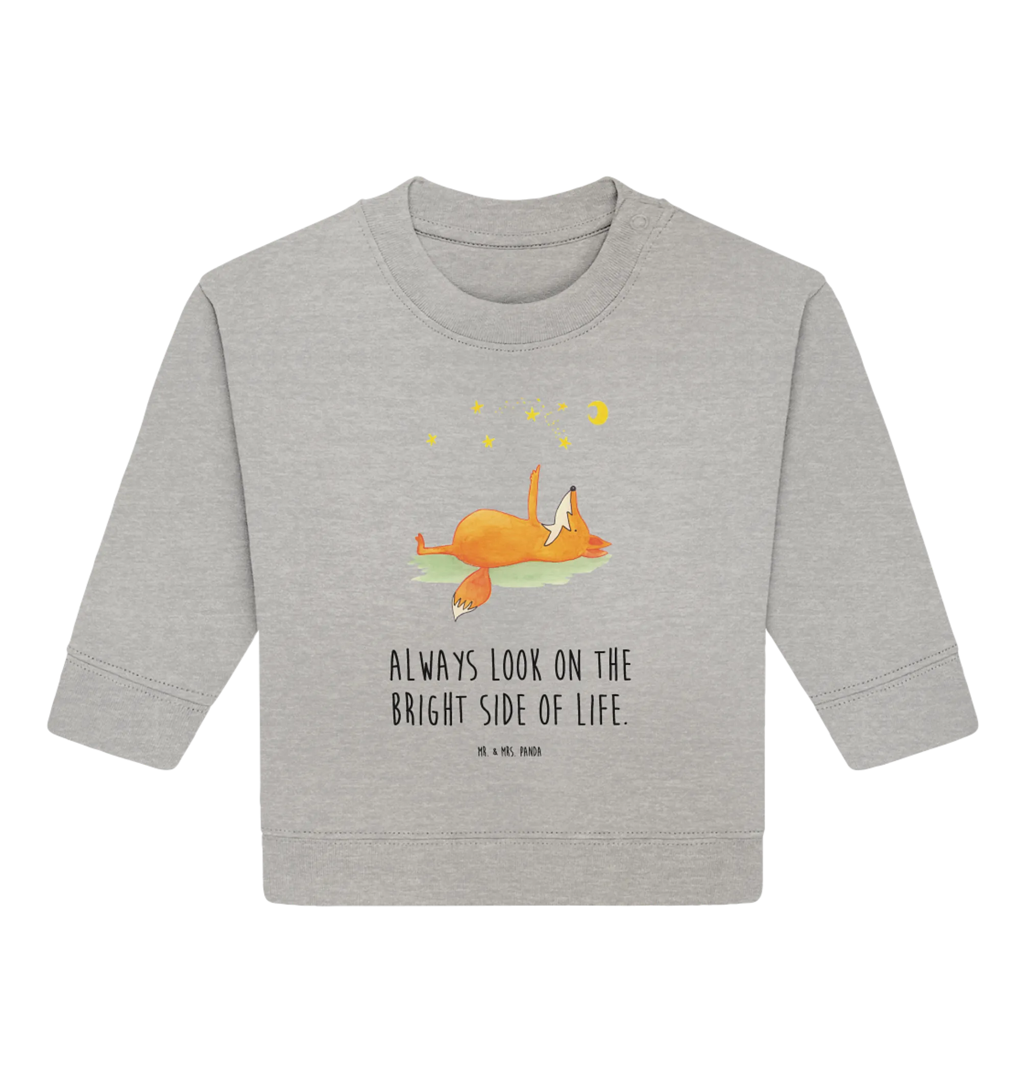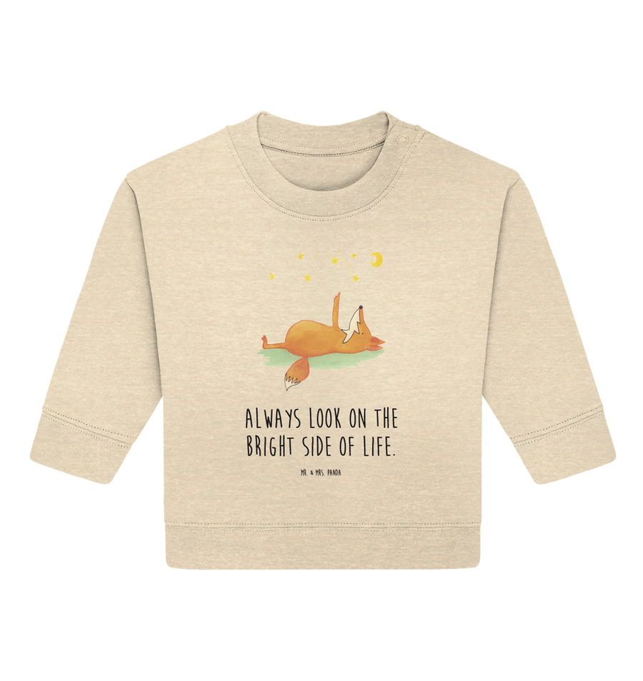 Entdecke unseren zauberhaften Organic Baby Pullover mit dem süßen Motiv "Fuchs Sterne" aus der Fuchs Kollektion von Mr. & Mrs. Panda. Dieser besondere Pullover ist nicht nur ein stylisches Kleidungsstück, sondern auch ein echter Blickfang für kleine Sternengucker und Träumer. Der niedliche Fuchs, der auf dem Rücken liegt und in den Nachthimmel schaut, lädt dazu ein, zusammen die Sterne zu betrachten. Mit dem romantischen Spruch "Always look on the bright side of life" bringt dieser Pullover eine positive Botschaft, die in jedem Herzen strahlen kann.