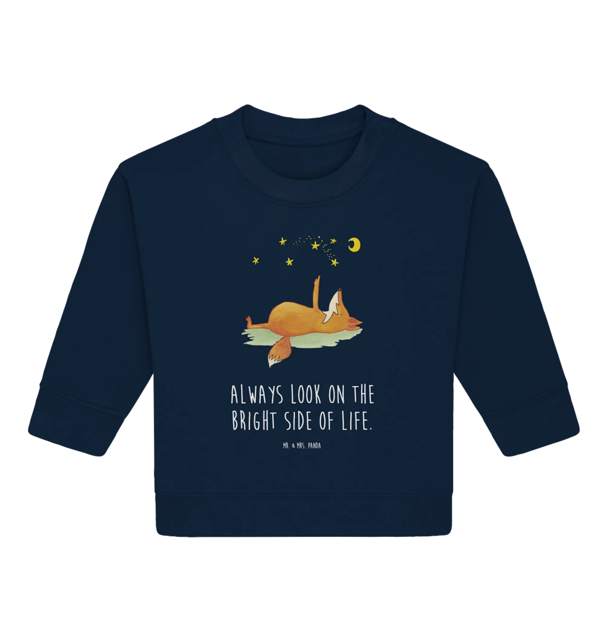 Das süße Design zeigt einen entzückenden Fuchs, der entspannt auf seinem Rücken liegt und in den strahlenden Sternenhimmel blickt. Dieses liebevoll handgezeichnete Motiv regt die Phantasie an und macht den Pullover zu einem idealen Geschenk für frisch gebackene Eltern oder als besonderes Stück für das eigene Baby. Die Kombination aus dem fröhlichen Fuchs und dem Spruch "Always look on the bright side of life" verbreitet Positivität und Lebensfreude.