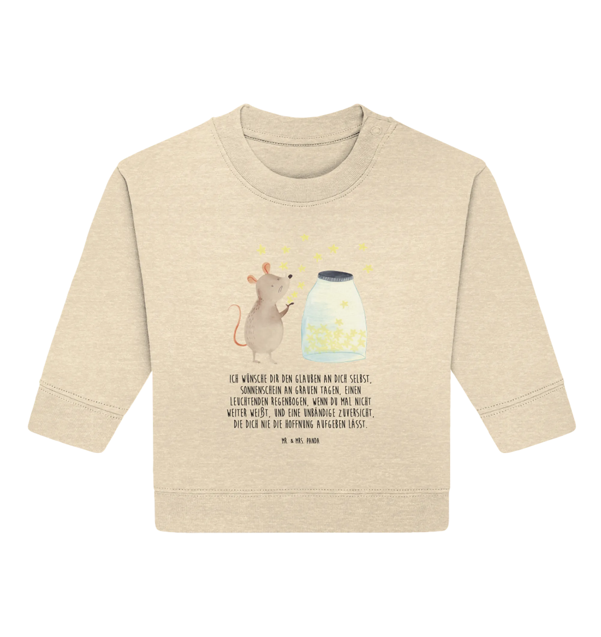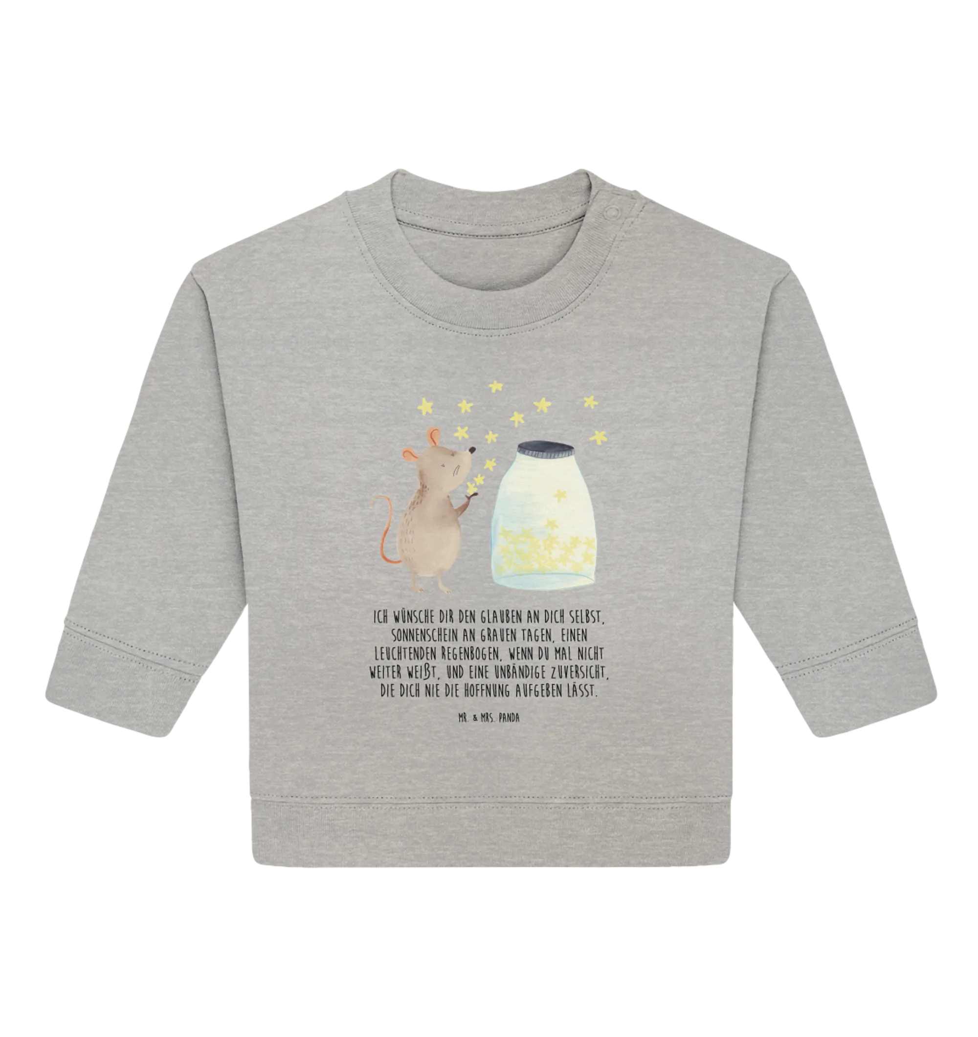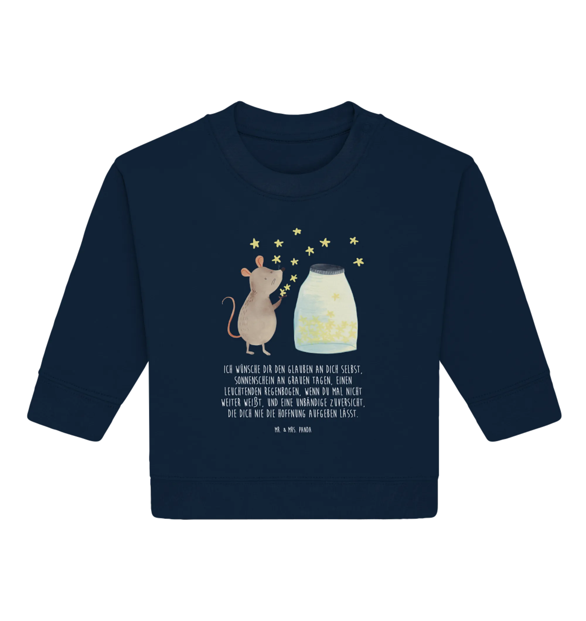 Das liebevoll gestaltete Design zeigt eine süße Maus, die vor einem Glas voller schimmernder Sterne sitzt. Sie träumt von Abenteuern und entführt dein Kind auf eine Reise durch die Weiten des Universums. Dieses niedliche Motiv zusammen mit dem einfühlsamen Spruch – "Ich wünsche dir den Glauben an dich selbst, Sonnenschein an grauen Tagen, einen leuchtenden Regenbogen, wenn du mal nicht weiter weißt, und eine unbändige Zuversicht, die dich nie die Hoffnung aufgeben lässt" – macht den Pullover zu einem wundervollen Geschenk zur Taufe, zur Geburt oder zum ersten Geburtstag.