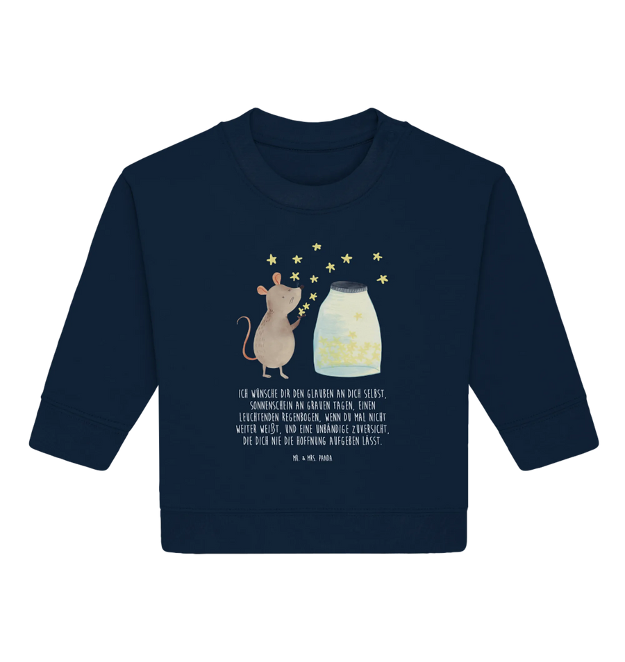 Das liebevolle Design zeigt eine kleine, niedliche Maus, die vor einem Glas funkelnder Sterne sitzt und sie auf eine wunderbare Reise durch das Universum entführt. Mit dem tollen Spruch 'Ich wünsche dir den Glauben an dich selbst, Sonnenschein an grauen Tagen, einen leuchtenden Regenbogen, wenn du mal nicht weiter weißt, und eine unbändige Zuversicht, die dich nie die Hoffnung aufgeben lässt.' wird der Pullover zu einem begleitenden Freund auf dem Lebensweg deines Kindes.