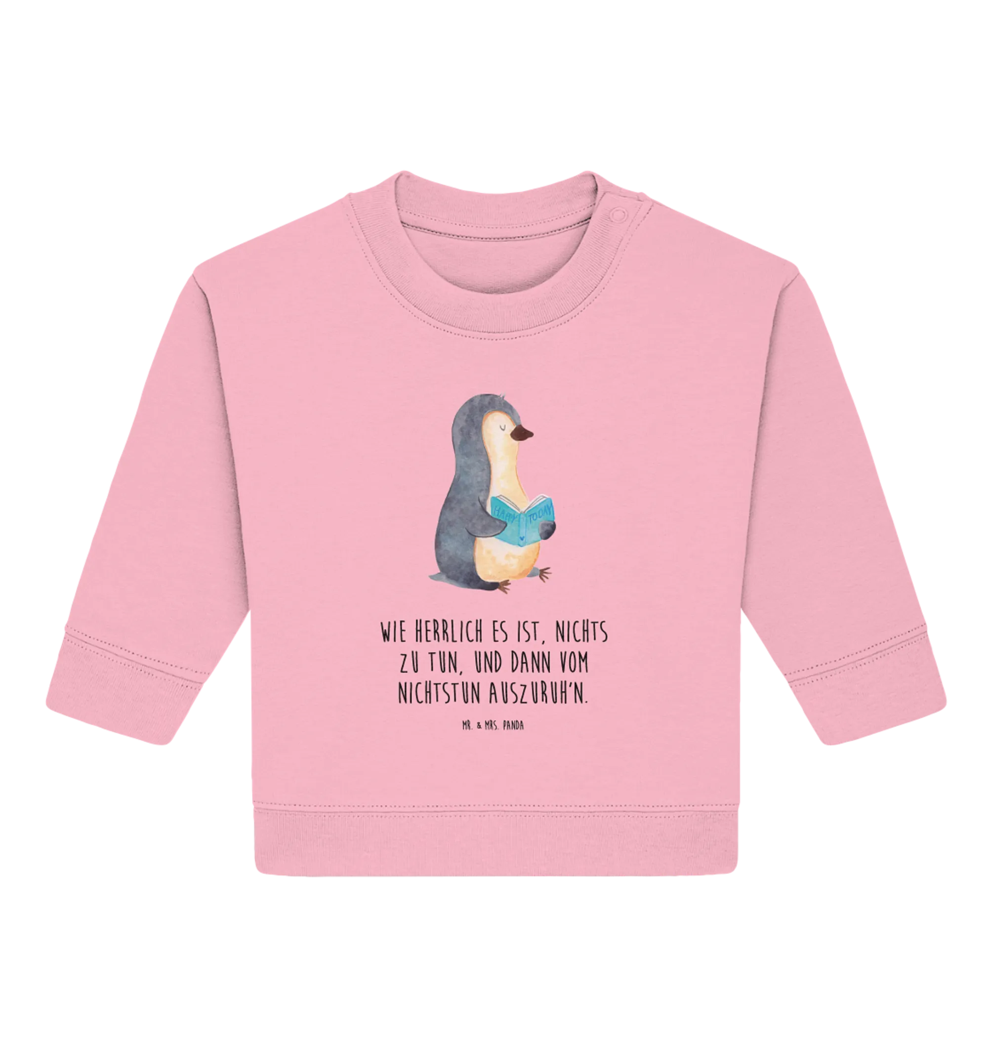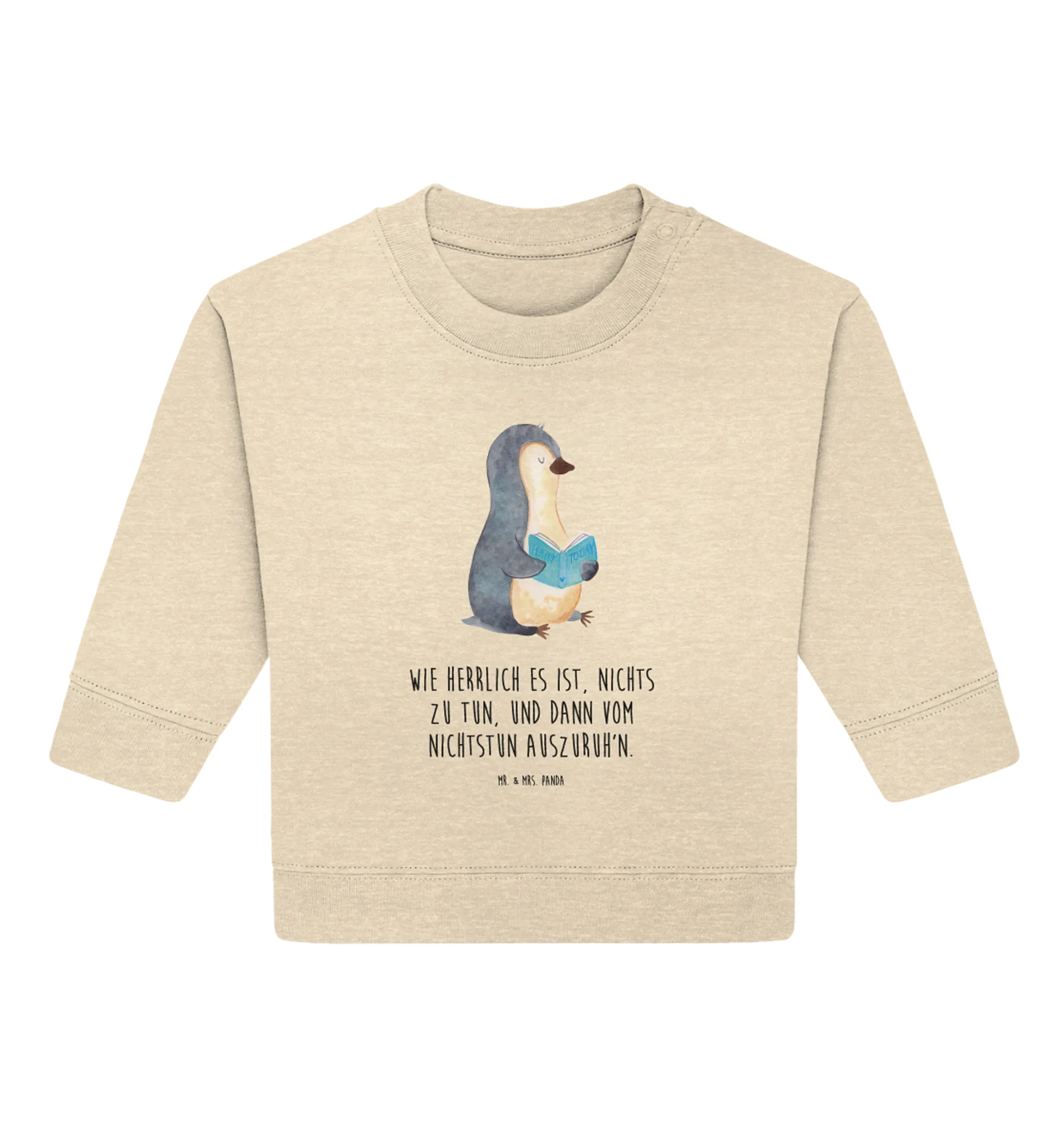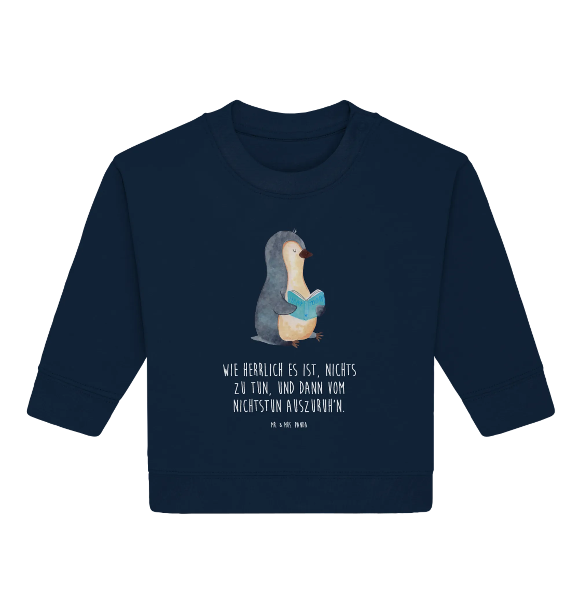 Der süße Organic Baby Pullover mit dem bezaubernden Pinguin-Motiv aus der einzigartigen Pinguin-Kollektion von Mr. & Mrs. Panda ist das perfekte Geschenk für alle kleinen Bücherwürmer und deren Eltern! Dieser Baby Sweatshirt bringt nicht nur Freude, sondern auch eine Botschaft: 'Wie herrlich es ist, nichts zu tun, und dann vom Nichtstun auszuruh'n.' Der charmante Pinguin, der in ein spannendes Buch vertieft ist, wird die Herzen von kleinen Entdeckern im Handumdrehen erobern.