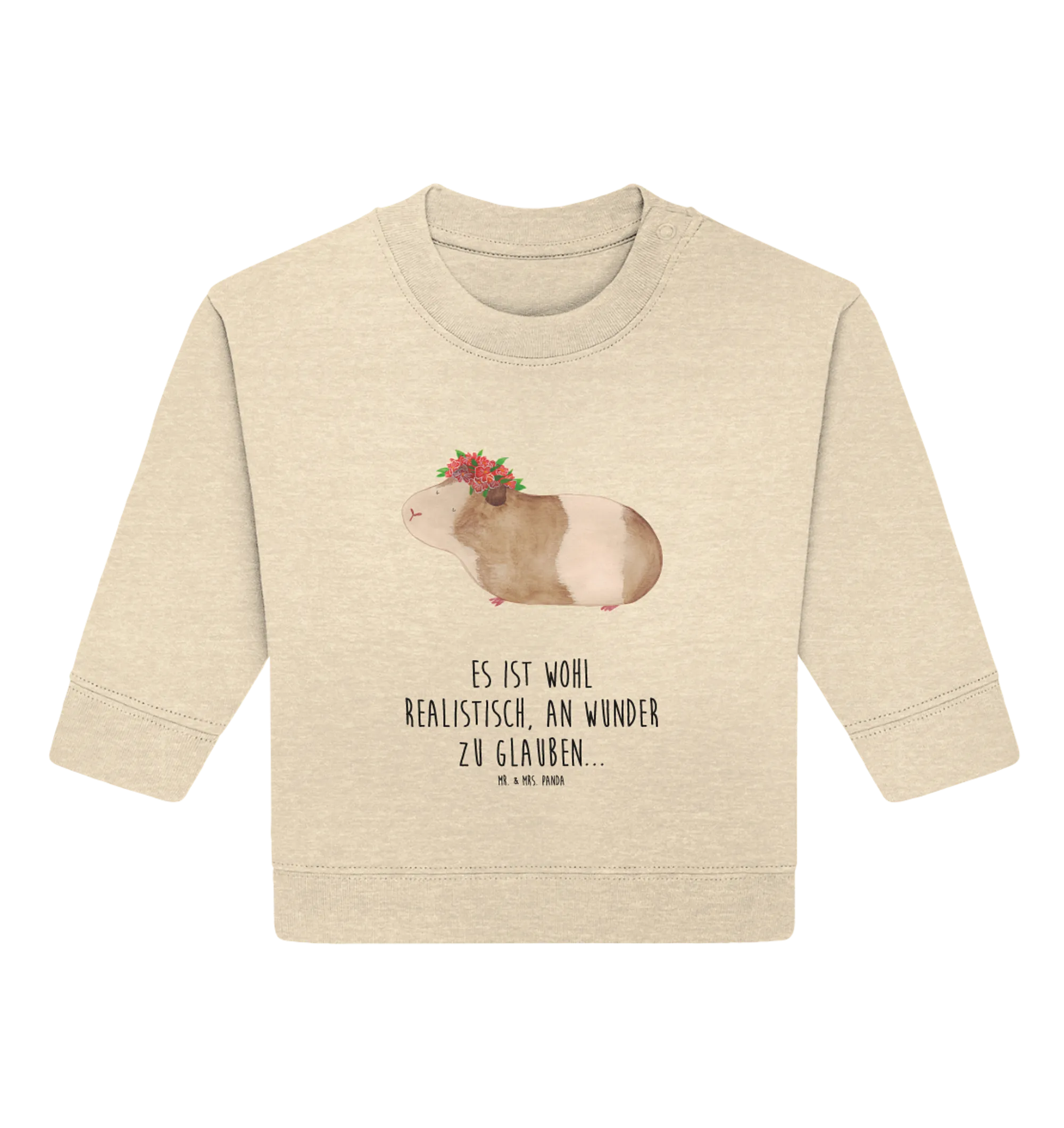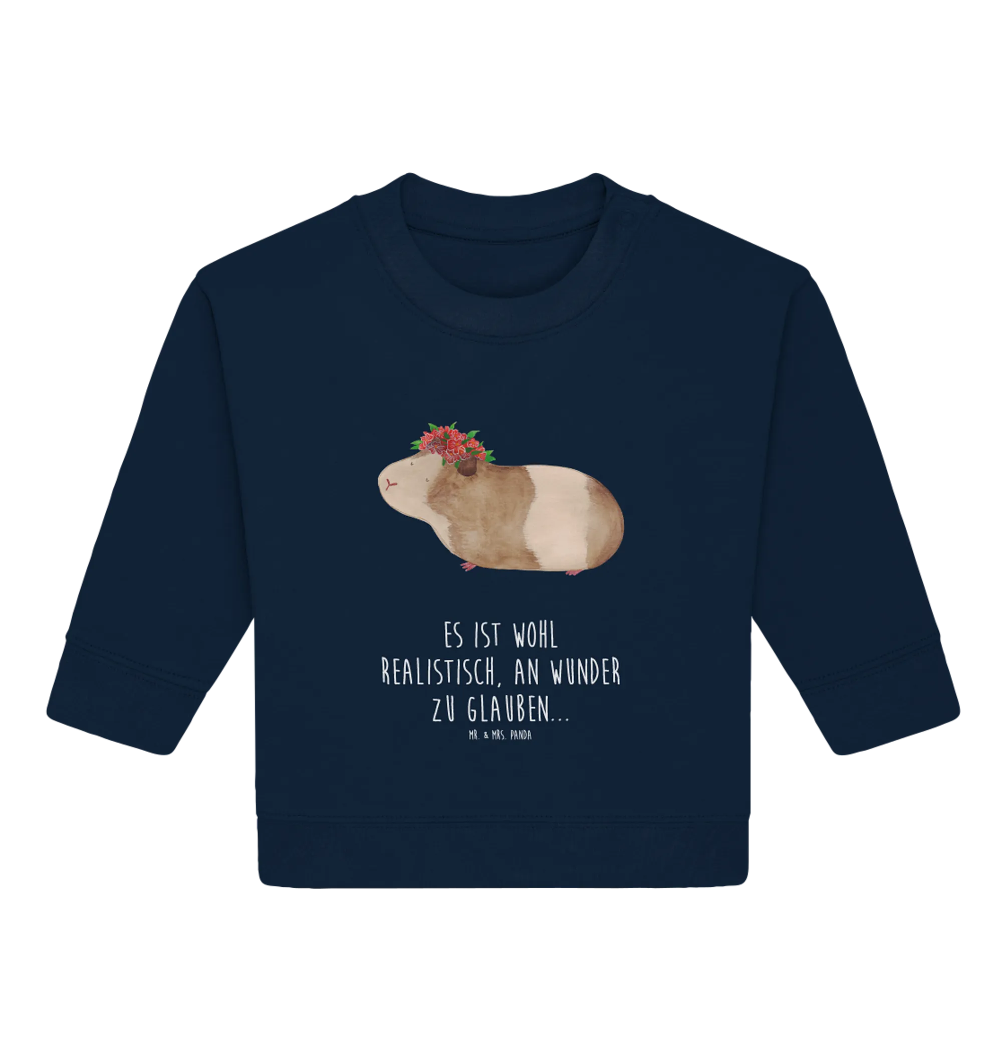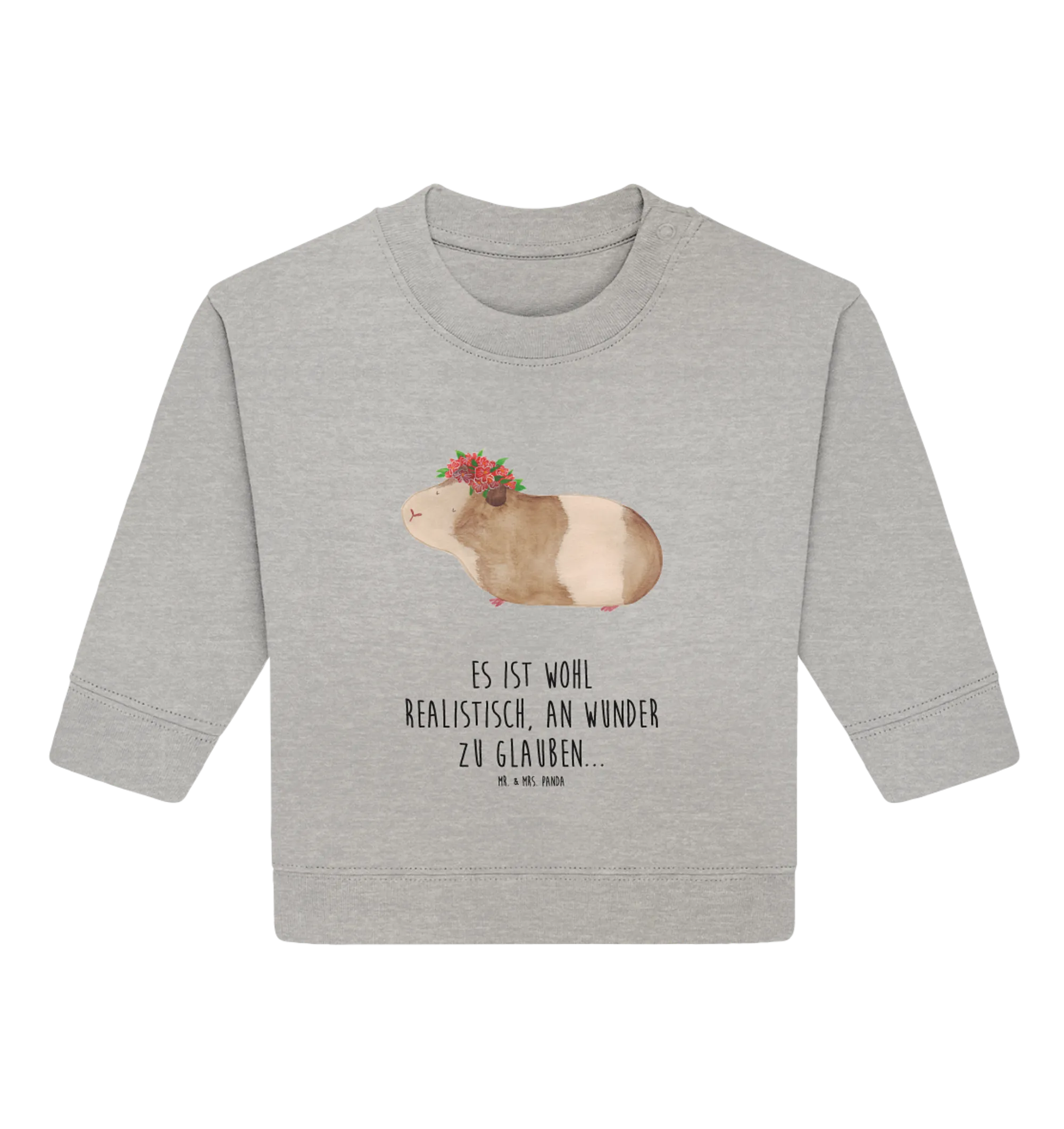 Der Organic Baby Pullover "Meerschweinchen weise" aus der bezaubernden Small World Kollektion von Mr. & Mrs. Panda ist der perfekte Begleiter für kleine Abenteurer! Mit einem liebevoll handgezeichneten Meerschweinchen und dem witzigen Spruch "Es ist wohl realistisch, an Wunder zu glauben..." zaubert dieser Pullover nicht nur jedem ein Lächeln ins Gesicht, sondern regt auch schon die Kleinsten zum Nachdenken an. Immerhin ist die Weisheit des Meerschweinchens unbestreitbar!