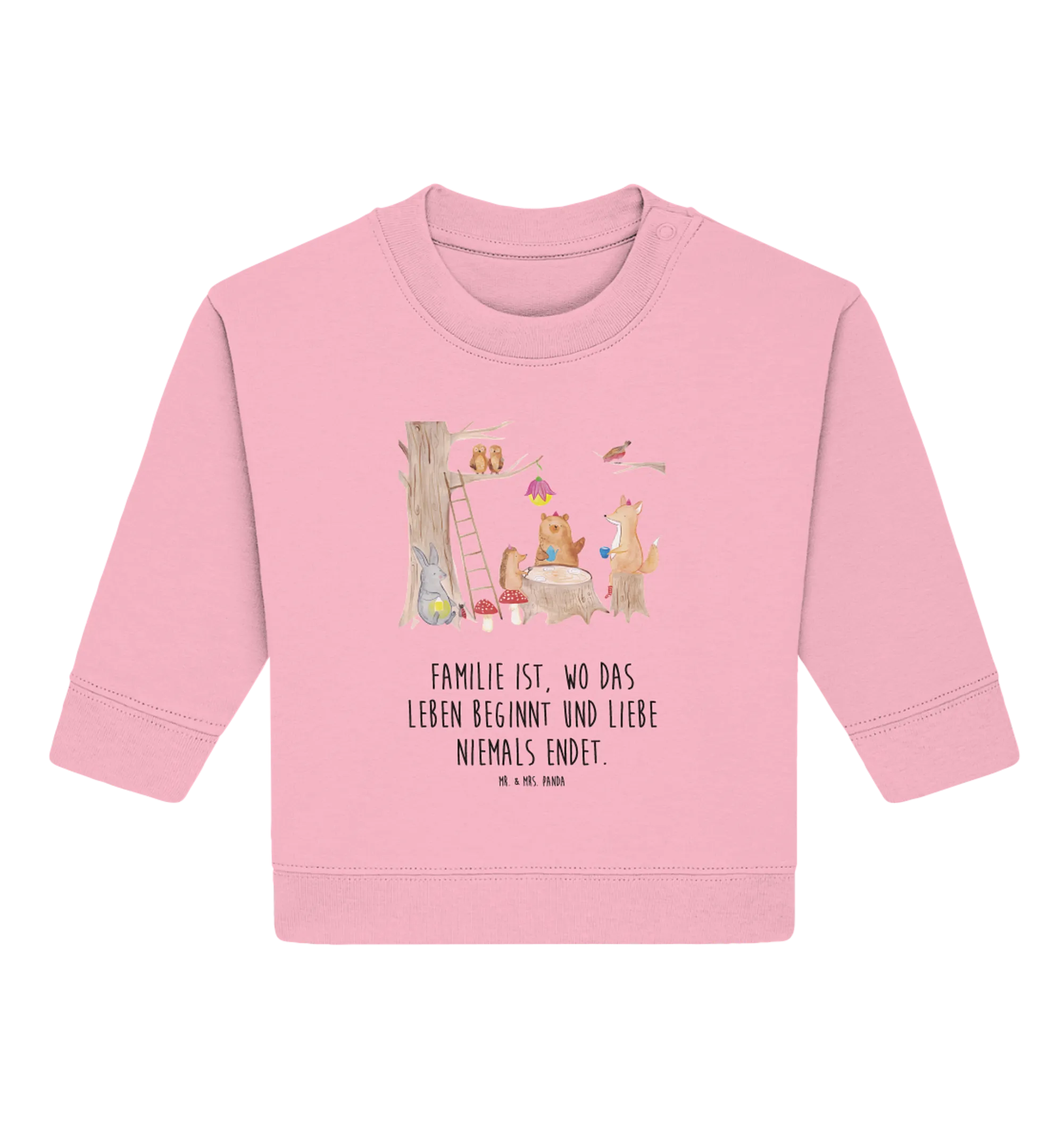 Ein zauberhafter Baby Sweater von Mr. & Mrs. Panda: Das handgezeichnete Aquarellmotiv zeigt Füchse, Eichhörnchen, Hasen und Mäuse beim fröhlichen Picknick im Wald. Die beruhigenden Cotton Pink Töne und die liebevollen Details machen diesen Pullover zu einem echten Lieblingsstück für Baby und Eltern.