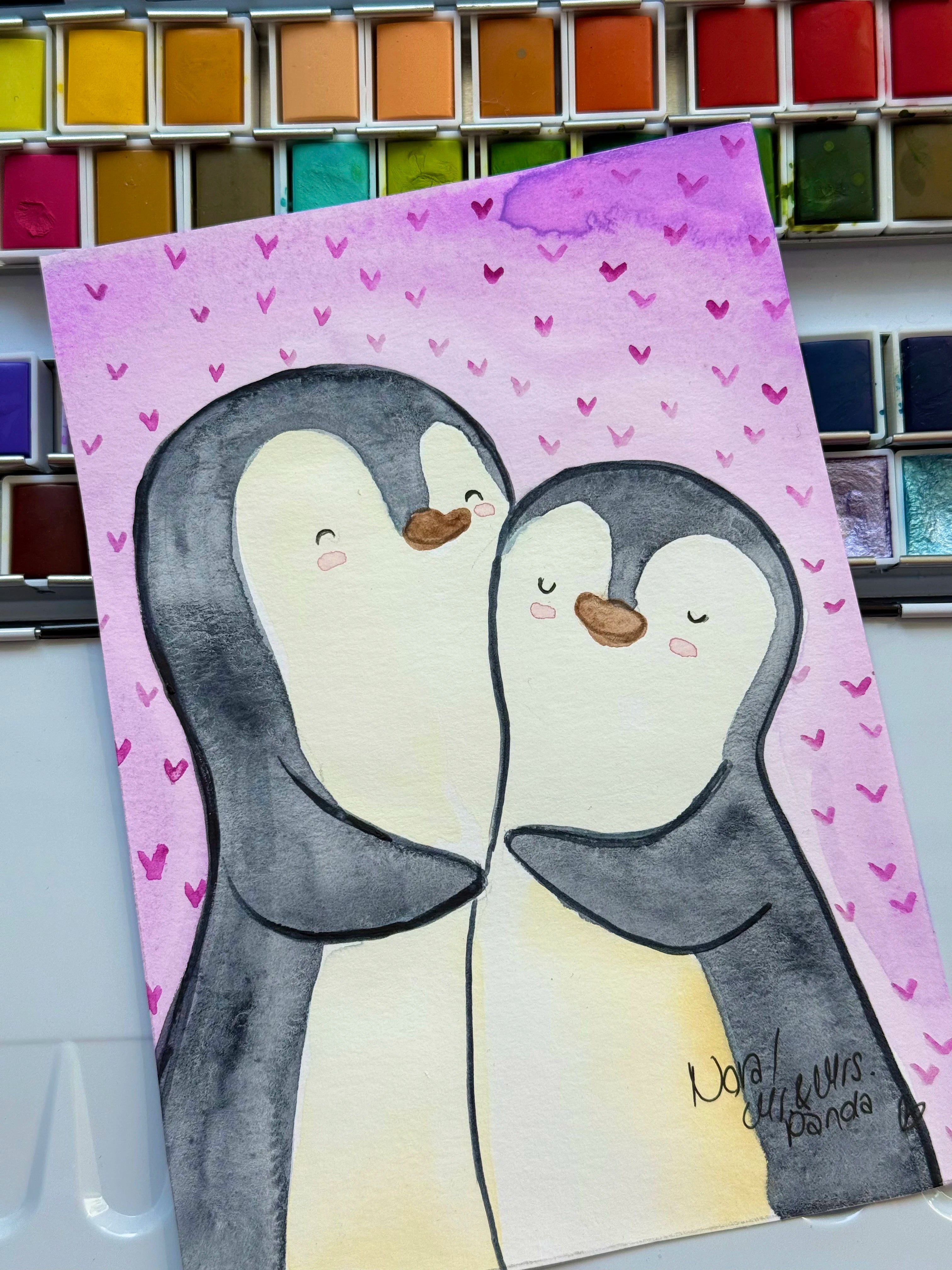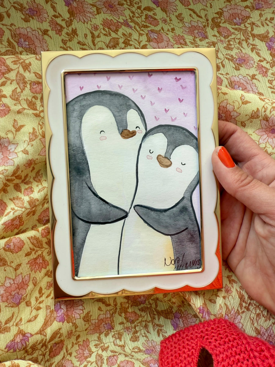 Oryginalny Akwarelowy rysunek "para zakochanych pingwinów" w ramce