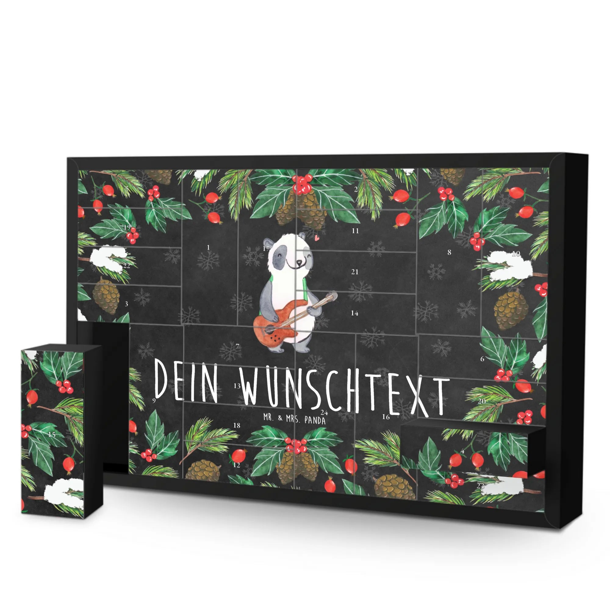 Der personalisierte befüllbare Adventskalender mit dem süßen Panda-Motiv und der roten Bassgitarre ist das perfekte Geschenk für Musikliebhaber und kreative Menschen. 🎸