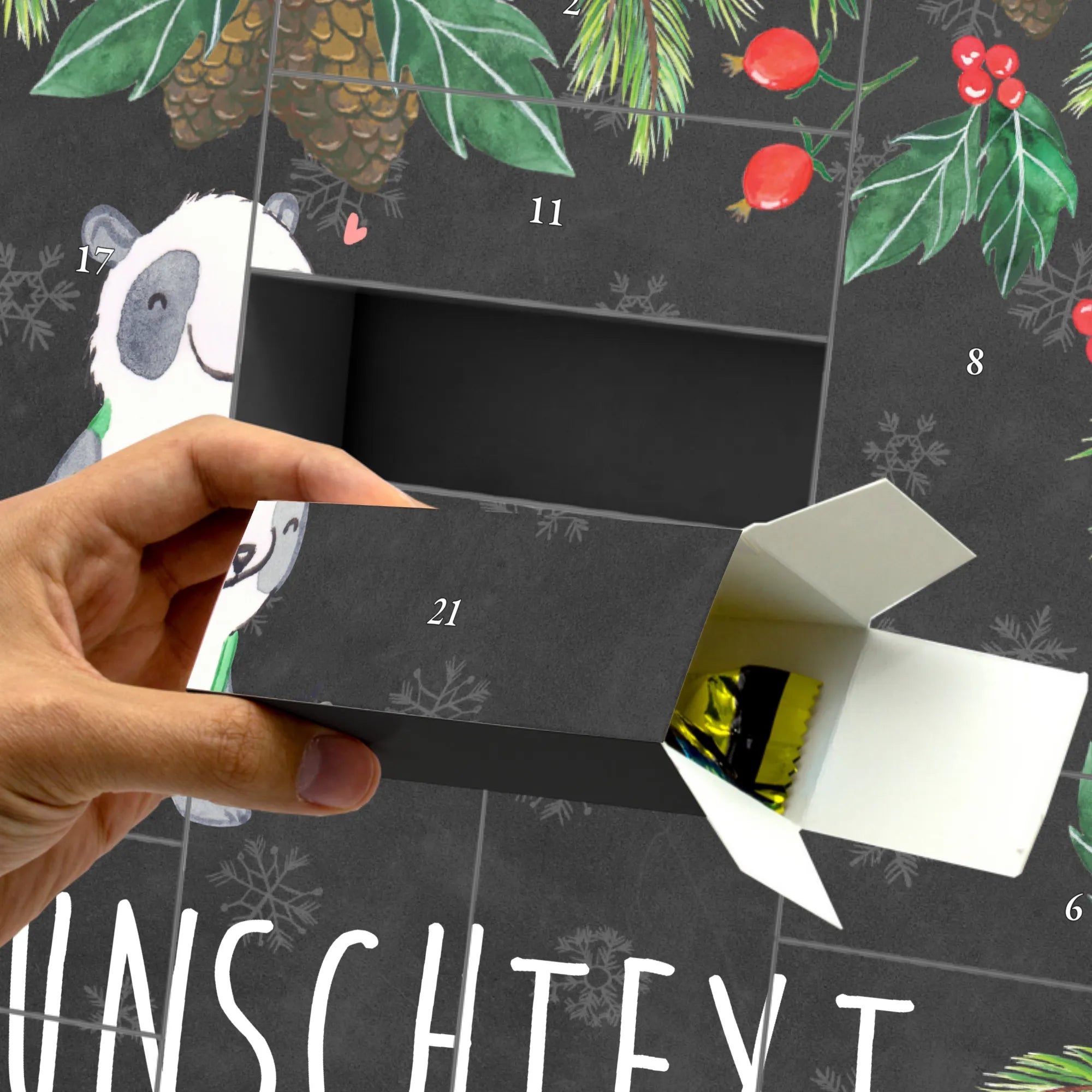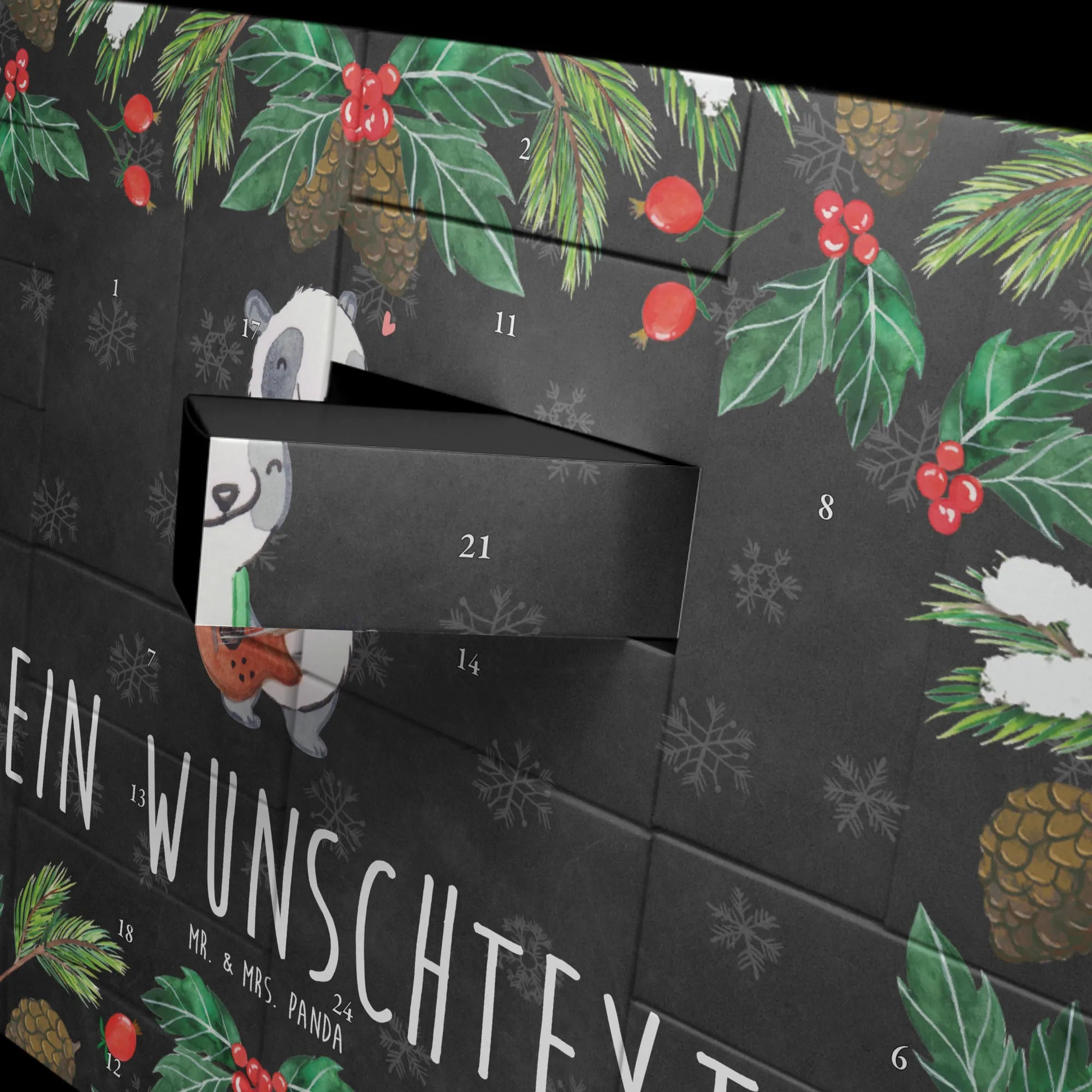 Dieser wunderschöne Adventskalender aus stabilem 300 Gramm Karton beeindruckt mit einem liebevollen Design von Mrs. Panda, das die Freude an der Musik und die Leidenschaft für Instrumente verkörpert. Der Panda, der in einer grünen Hosenträgerhose eine rote Bassgitarre spielt, ist nicht nur ein echter Blickfang, sondern bringt auch ein Lächeln auf die Gesichter der Beschenkten.