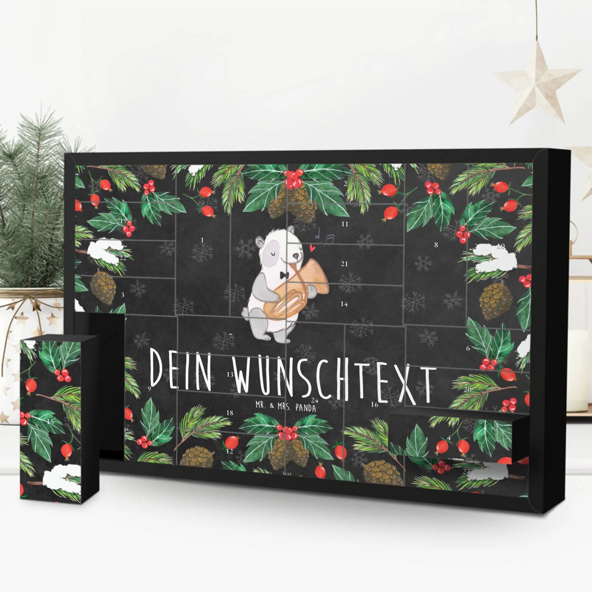 Der personalisierte und befüllbare Adventskalender von Mr. & Mrs. Panda ist das perfekte Geschenk für Musikliebhaber und kleine Pfleger der Melodien. Mit unserem einzigartigen Motiv eines entzückenden Pandas, der ein Tenorhorn spielt, versüßt dieser Adventskalender die Vorweihnachtszeit auf ganz besondere Weise. Der Panda, der mit einer charmanten Fliege um den Hals und einem Herz bei sich, fröhlich musiziert, zaubert jedem Betrachter ein Lächeln ins Gesicht.