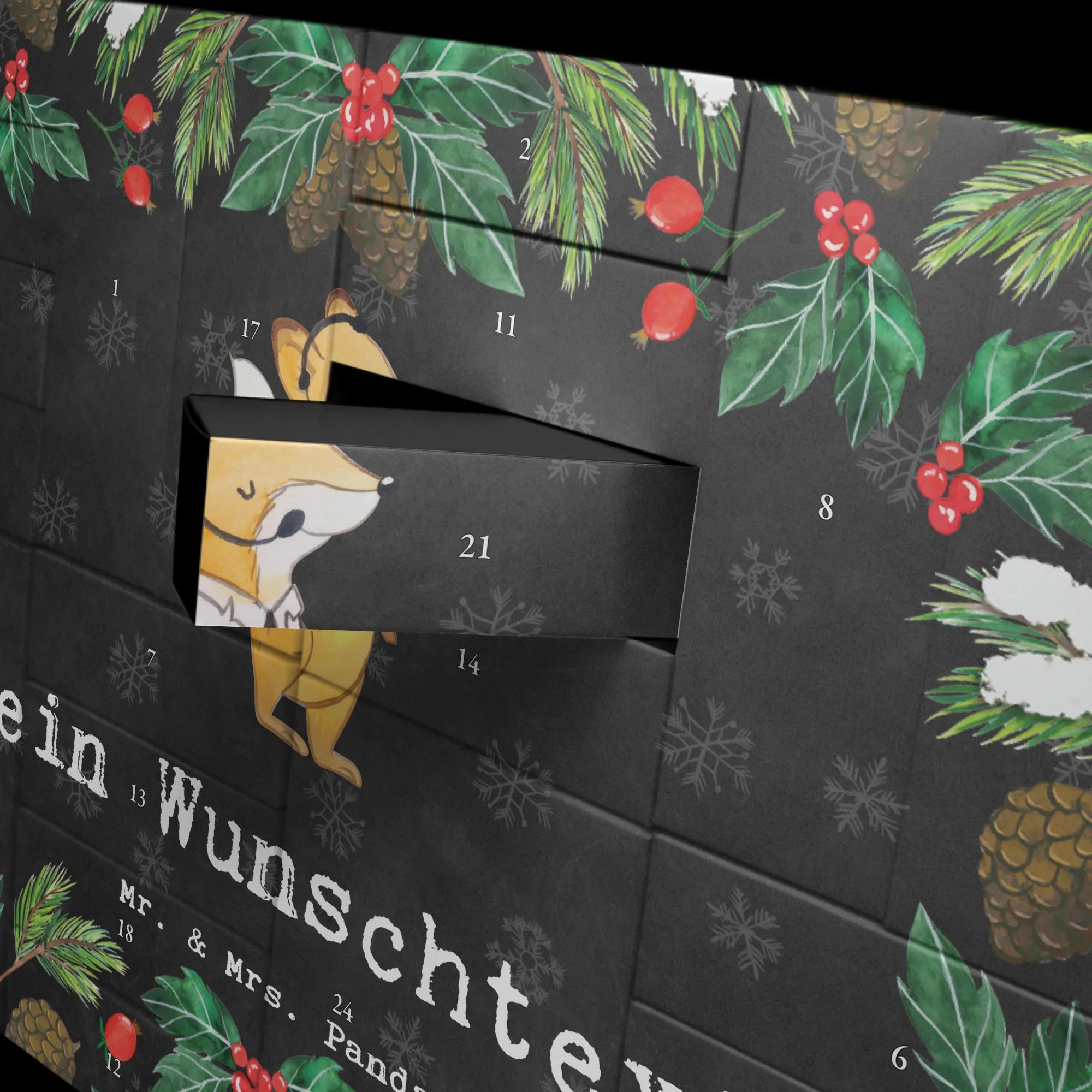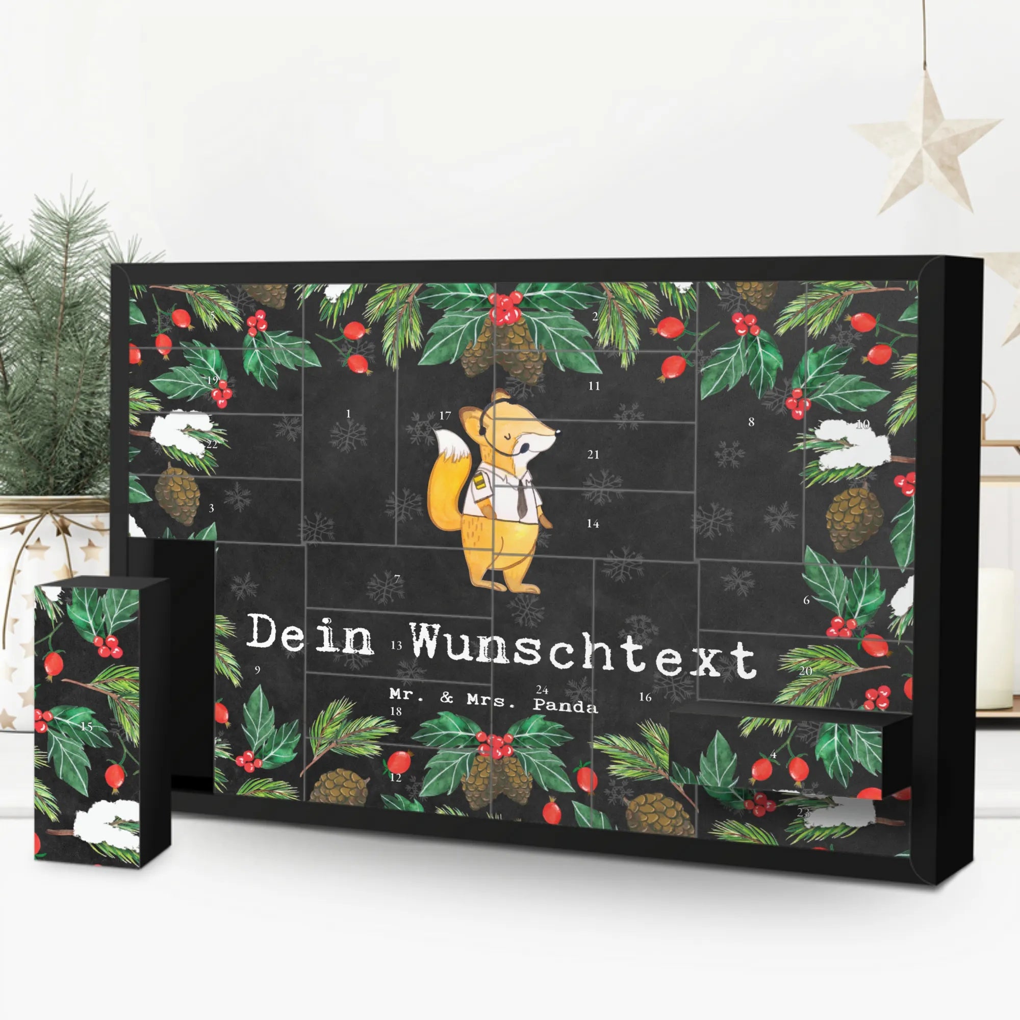 Design & Qualität: Die Aquarell-Illustration von Mrs. Panda zeigt einen süßen Fuchs mit Headset und Fluguniform – charmant, freundlich und mit viel Herz. Die brillante Druckqualität auf seidenmatter Oberfläche macht den Kalender besonders edel. Die integrierte Aufstellvorrichtung sorgt dafür, dass sich der Adventskalender überall wunderbar präsentieren lässt.