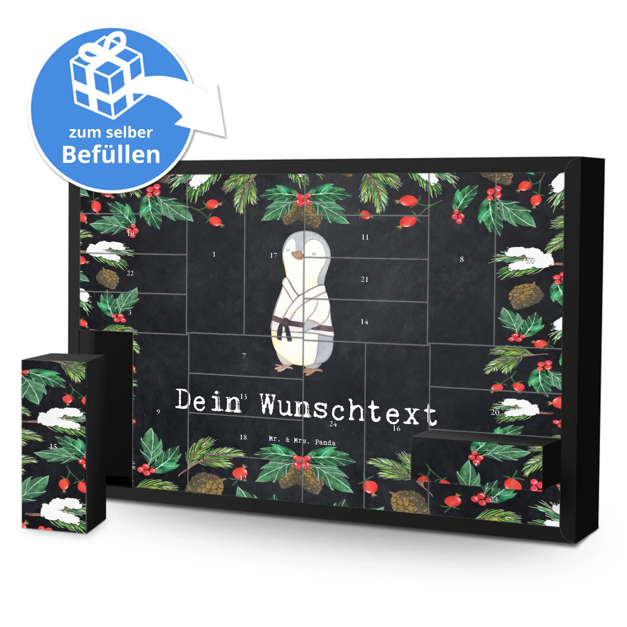 Der personalisierbare Befüllbare Adventskalender von Mr. & Mrs. Panda ist das perfekte Geschenk für alle Sportbegeisterten, insbesondere für Karate-Fans! Mit seinem fröhlichen Motiv eines Pinguins im Karateanzug und dem spritzigen Slogan "Karate ist meine Medizin" bringt dieser Kalender Freude in die Vorweihnachtszeit.