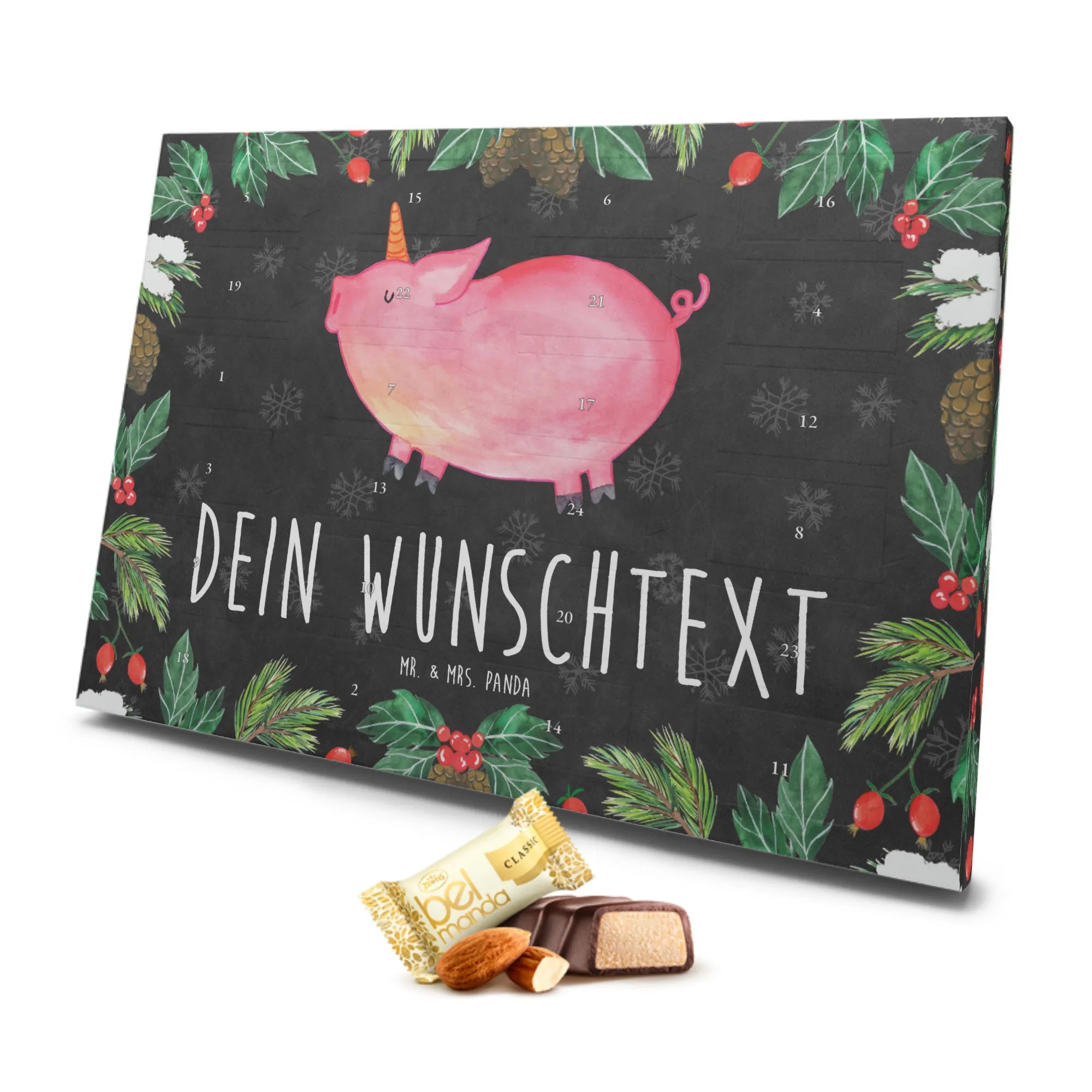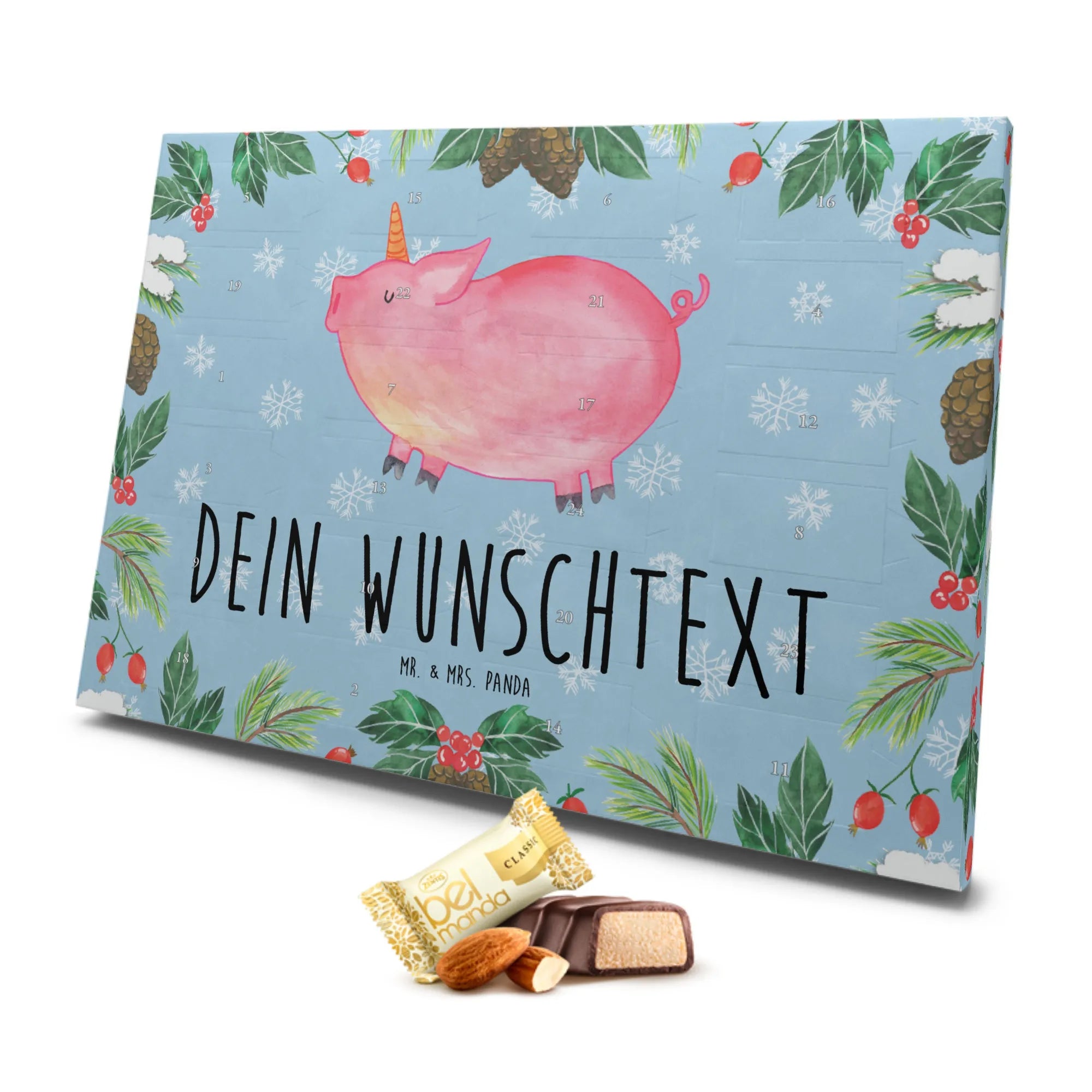 Entdecke den zauberhaften, personalisierten Marzipan Adventskalender mit dem fantastischen Einhorn Schweinhorn Motiv aus der Einhorn - Kollektion von Mr. & Mrs. Panda! Dieser Adventskalender ist nicht nur ein süßes Highlight in der Vorweihnachtszeit, sondern auch das perfekte Geschenk für alle Einhornliebhaber, die das Besondere lieben.