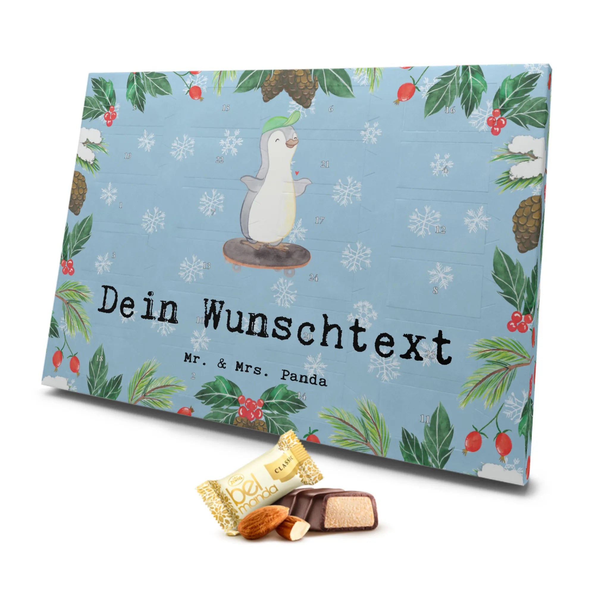 Bist du auf der Suche nach dem perfekten Geschenk für einen Skater oder einfach einen Sportbegeisterten in deinem Leben? Dann ist der personalisierte Marzipan Adventskalender von Mr. & Mrs. Panda mit dem süßen Motiv "Pinguin Skateboarden Medizin" genau das Richtige!