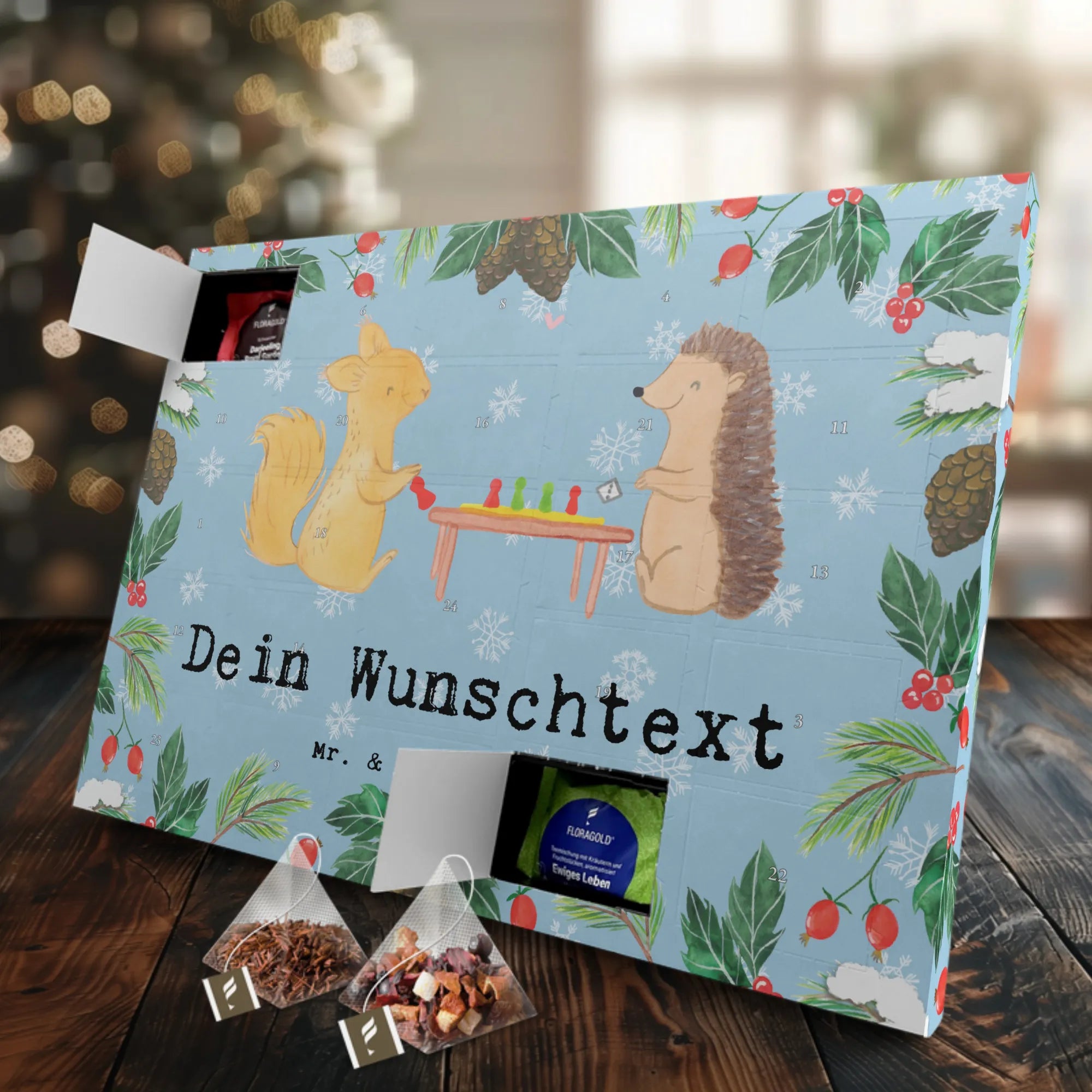 Suchst Du das perfekte Geschenk für einen Spieleabend? Dann ist unser personalisierten Tee Adventskalender mit dem niedlichen Eichhörnchen-Motiv 'Gesellschaftsspiele ist meine Medizin.' genau das Richtige! Dieser wunderschöne Adventskalender aus hochwertigem 300 Gramm Karton ist nicht nur optisch ein Highlight, sondern auch voller köstlicher Teesorten, die jeden Tag im Advent zu einem besonderen Erlebnis machen.