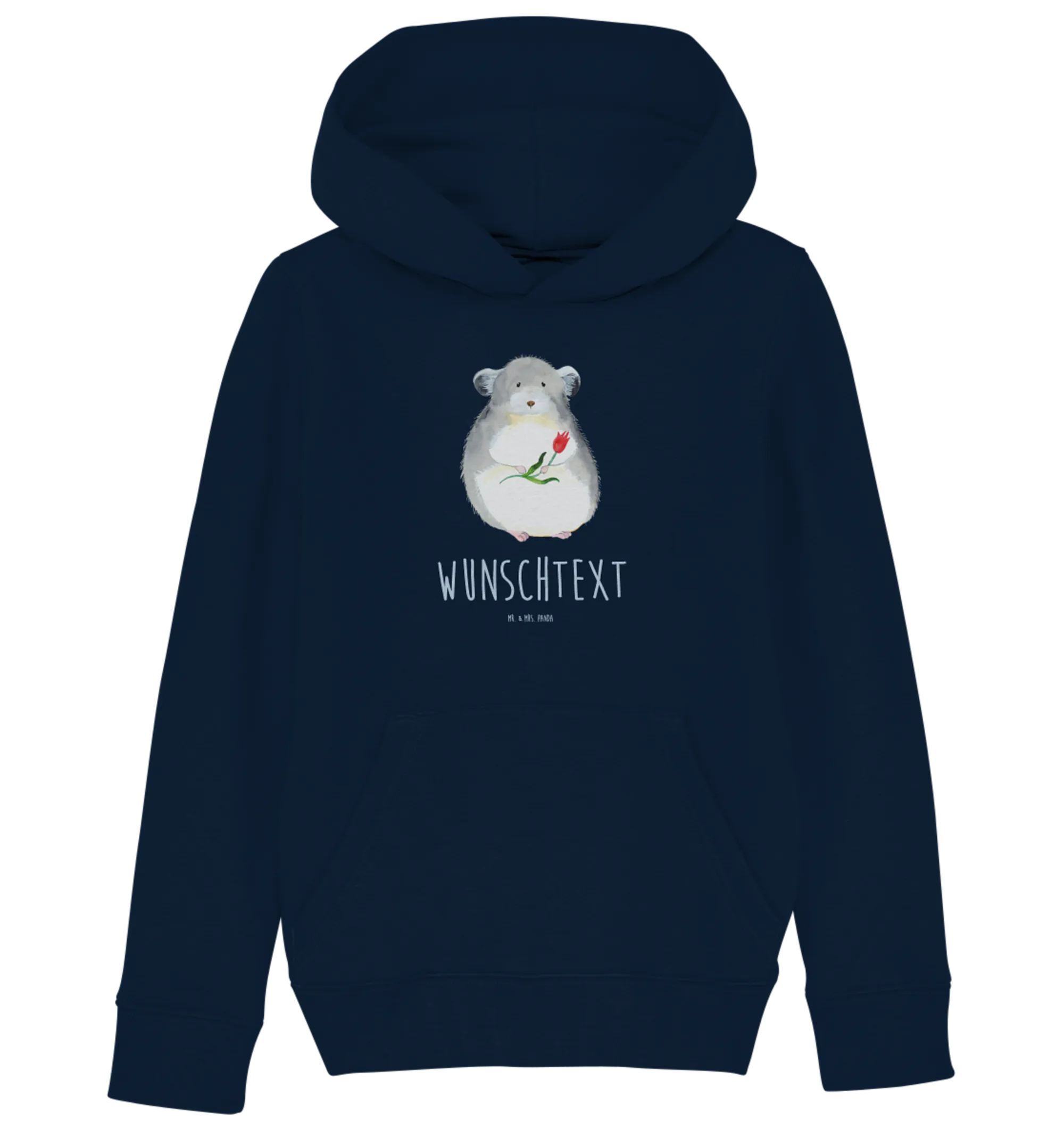 Entdecke den perfekten Begleiter für kleine Tierfreunde – unseren personalisierten Kinder-Hoodie mit dem zauberhaften Motiv "Chinchilla mit Blume" aus der beliebten Small World Kollektion von Mr. & Mrs. Panda!