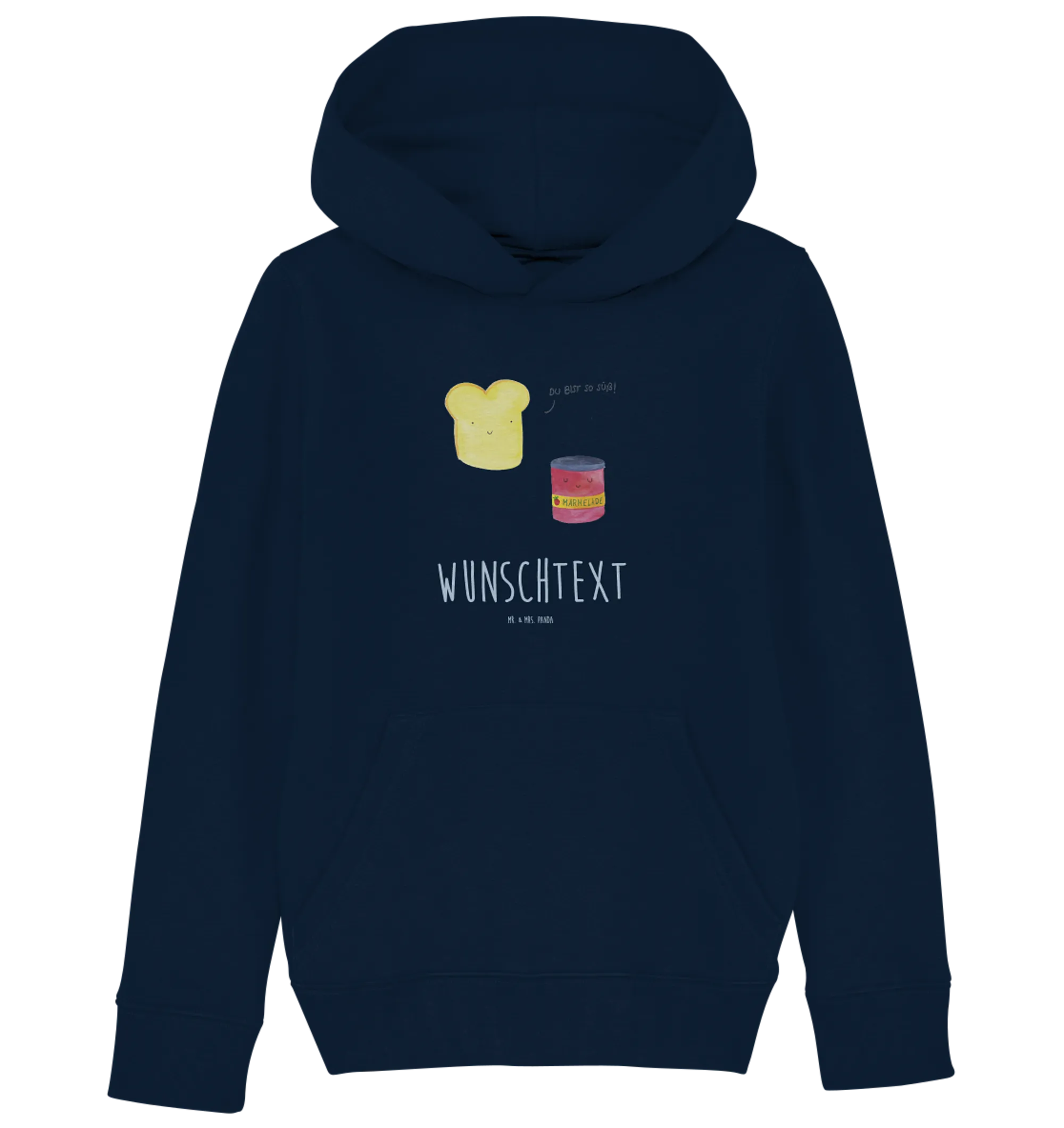 Eines der schönsten Features ist die Möglichkeit der Personalisierung. Du kannst den Hoodie mit dem Namen deines Kindes oder einem individuellen Wunschtext versehen, was ihn zu einem einzigartigen und persönlichen Geschenk macht. So wird der Hoodie zu einem ganz besonderen Begleiter, der die Kids mit einem einzigartigen Stil ausstattet. Mit dem süßen Motiv "Toast & Marmelade" schaffst du eine tolle Verbindung zwischen Alltag und Freude.