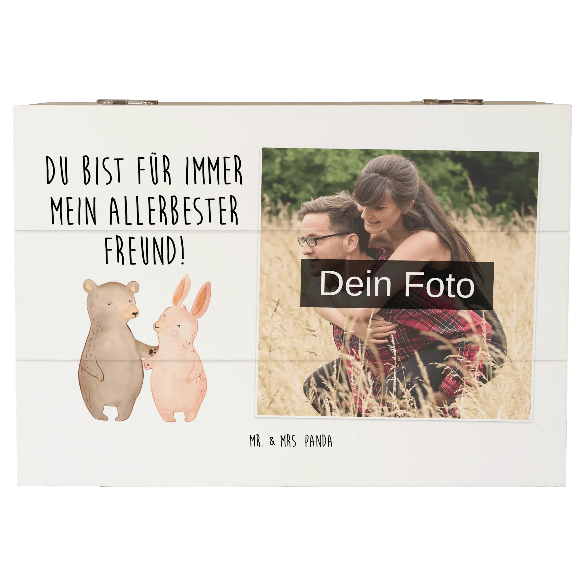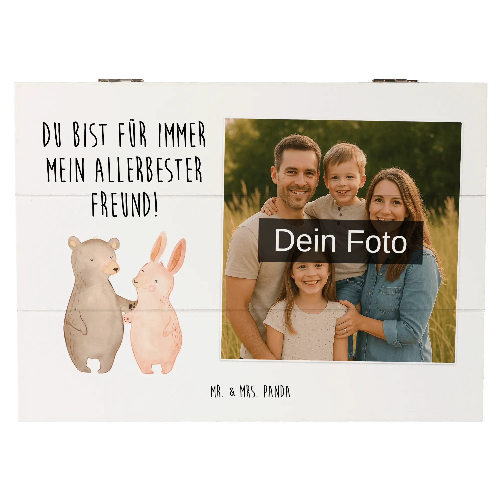 Personalisierte Foto Holzkiste Bär und Hase Umarmen - 22 x 15 cm - Weiß