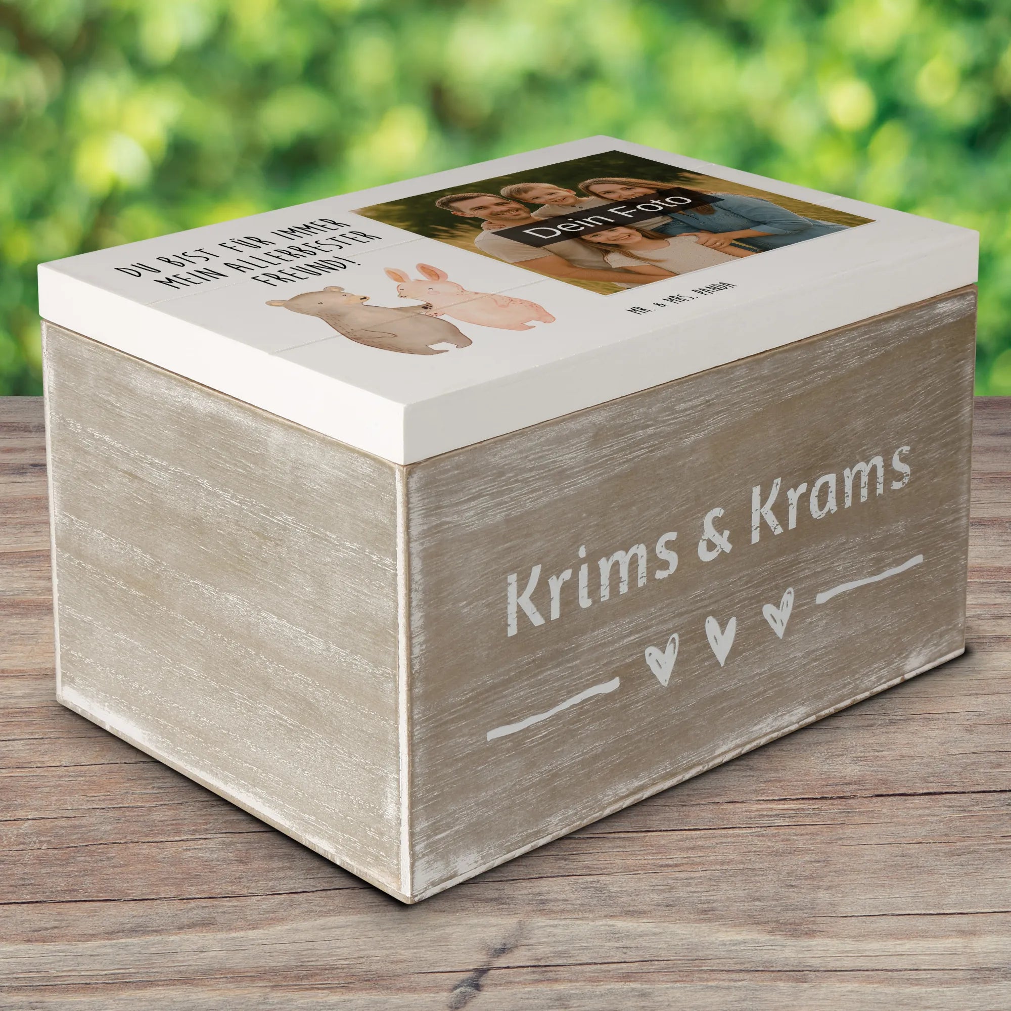 Um deiner Kiste eine ganz persönliche Note zu verleihen, kannst du sie ganz nach deinem Geschmack mit einem Wunschtext oder Namen personalisieren. Mit dem liebevollen Spruch "Du bist für immer mein allerbester Freund!" wird sie zum absoluten Highlight und erinnert die beschenkte Person immer an die ganz besonderen Momente, die ihr zusammen erlebt habt. Dies macht diese Kiste nicht nur zu einem individuellen Geschenk, sondern auch zu einer Schatztruhe voller Erinnerungen, die ein Leben lang hält.