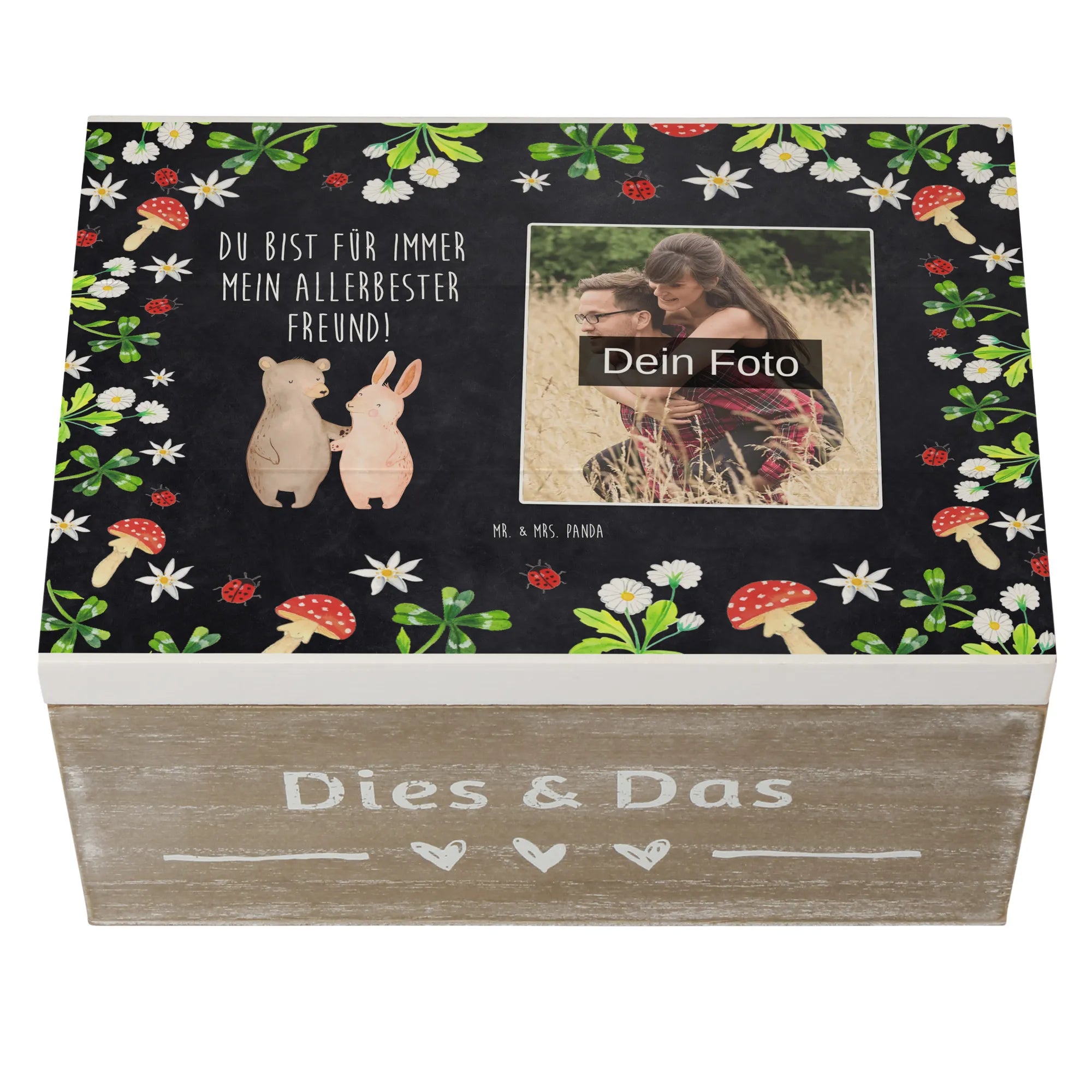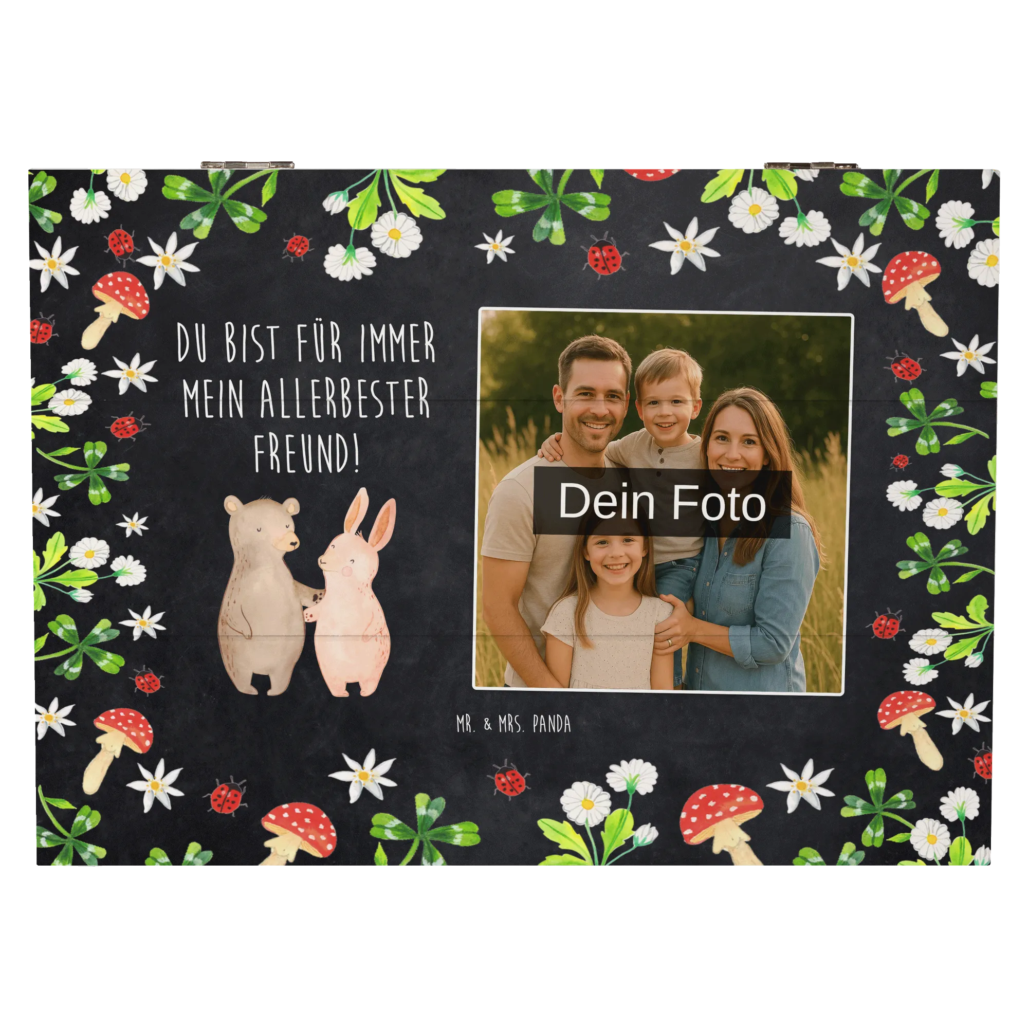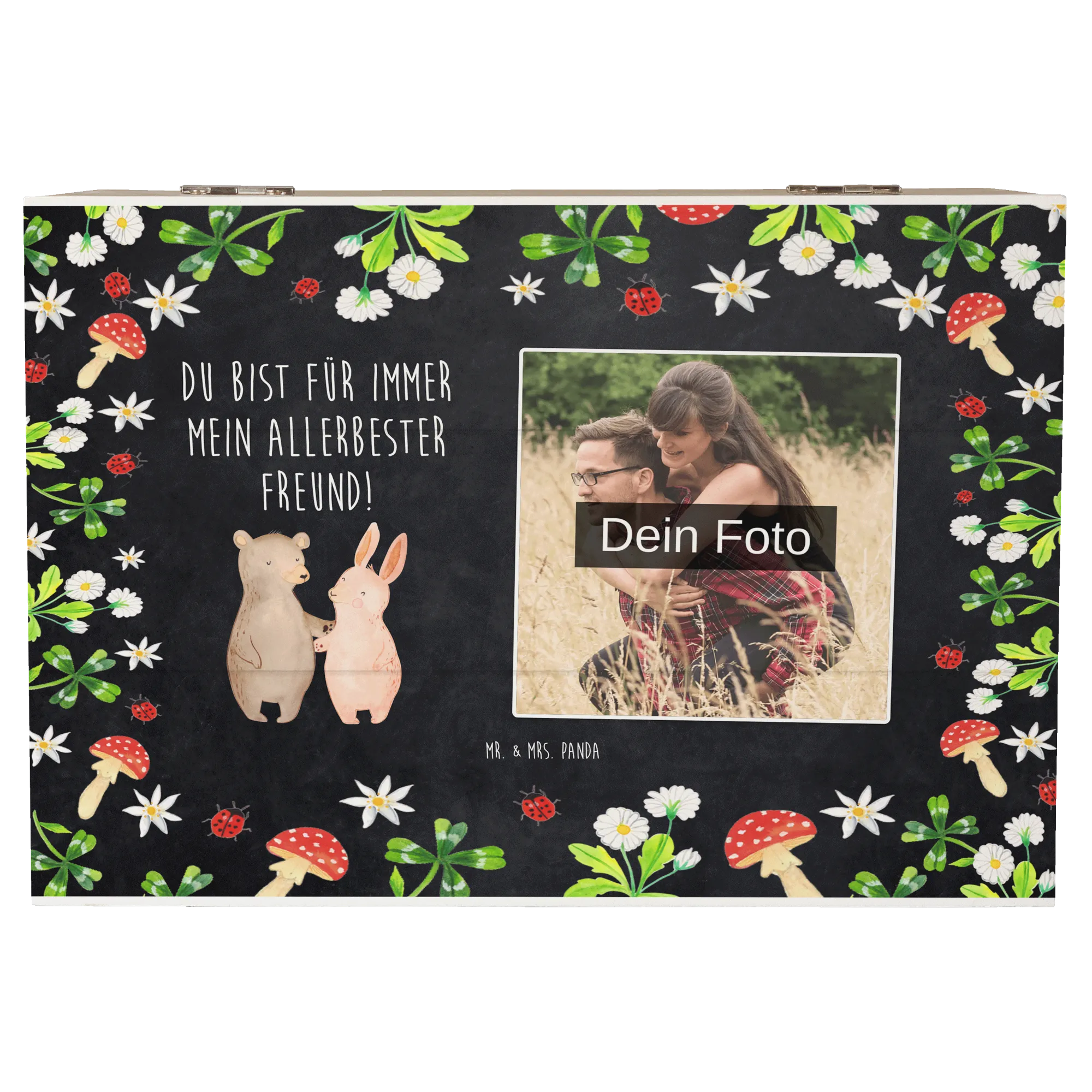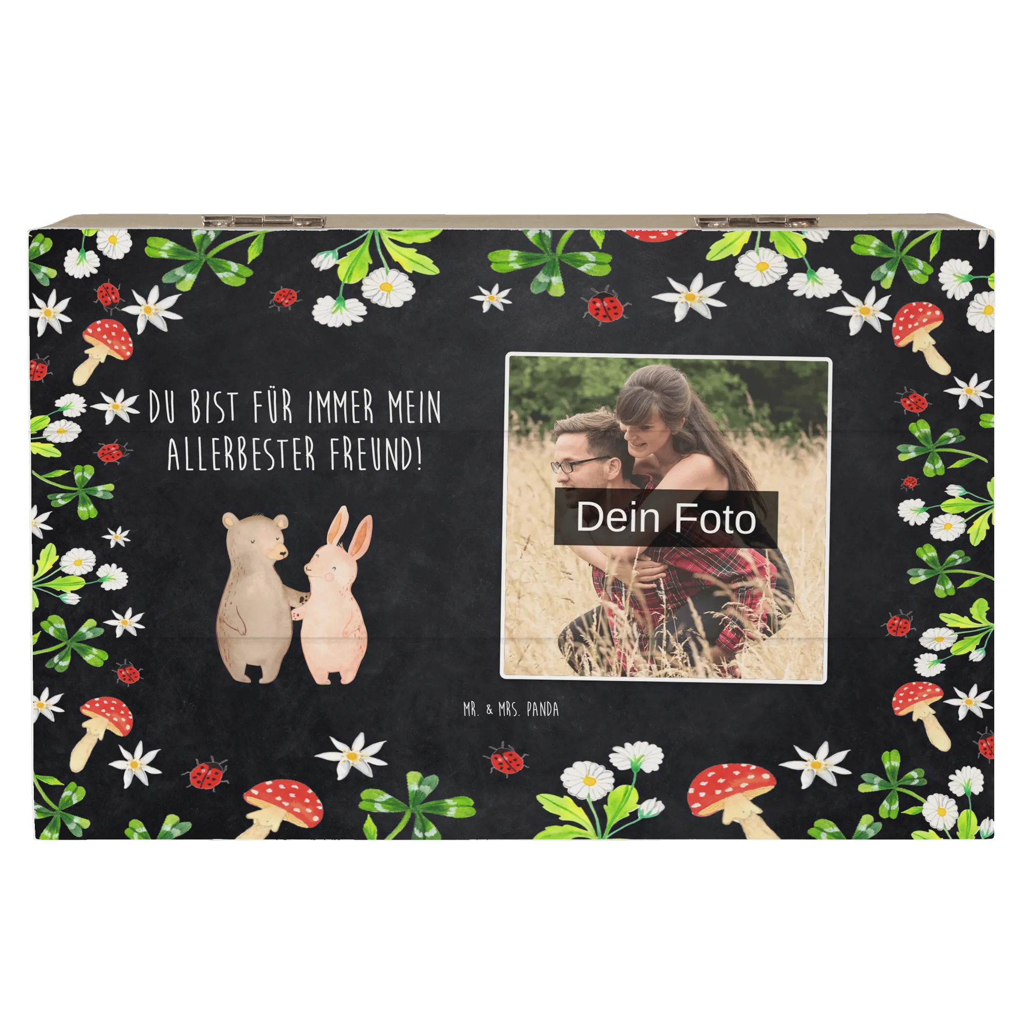 Die personalisierte Foto Holzkiste von Mr. & Mrs. Panda ist das perfekte Geschenk für alle, die ihren Liebsten eine besondere Freude machen möchten. Mit dem niedlichen Motiv von einem Bären und einem Hasen, die sich innig umarmen, vermittelt diese Kiste Liebe und Verbundenheit.
