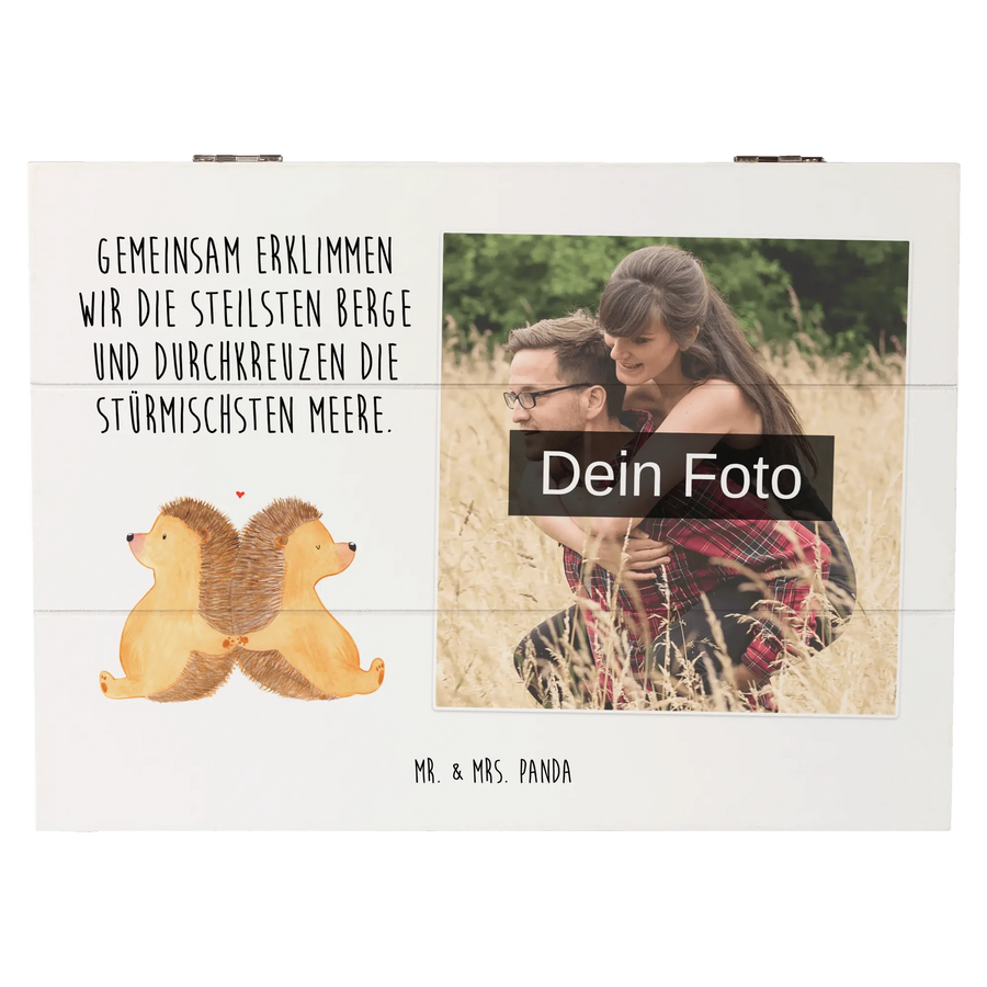 Entdecke die wundervolle, personalisierte Foto Holzkiste mit dem zauberhaften Motiv der händchenhaltenden Igel von Mr. & Mrs. Panda – perfekt für deine Liebsten!