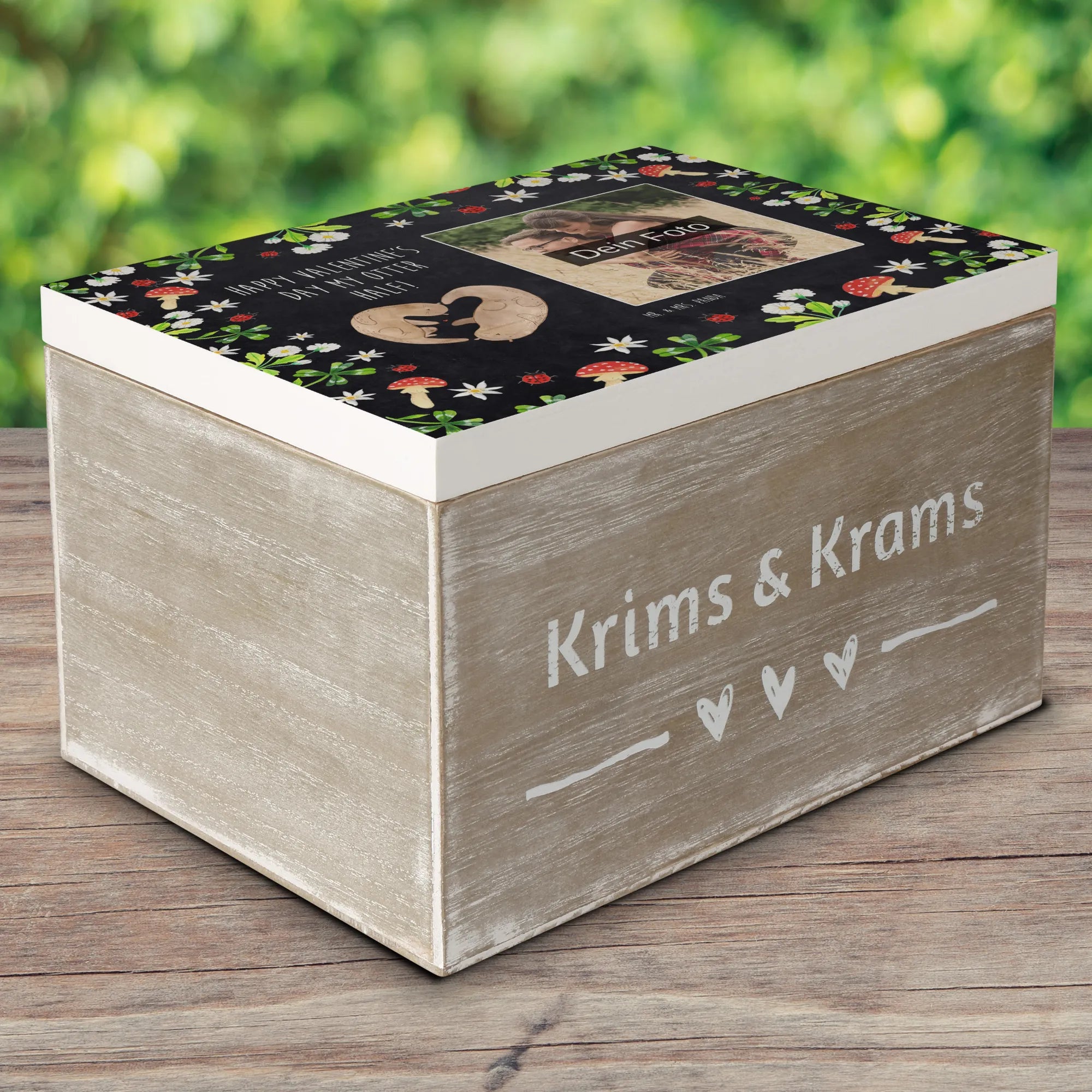 Besonderheit: Die Kiste ist mit Einschlagscharniere versehen, die das Öffnen und Schließen besonders leicht machen. So können deine Liebesbotschaften und Schätze jederzeit einfach entnommen und wieder sicher verstaut werden. Denk daran, Fotos in guter Auflösung hochzuladen, um das beste Druckergebnis zu erzielen. Die Fotos werden nicht nachbearbeitet, also achte darauf, dass sie gut passen!